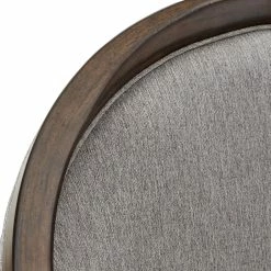 - A warm wood finish complements the textured fabric upholstery