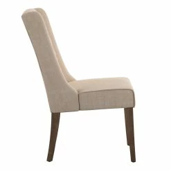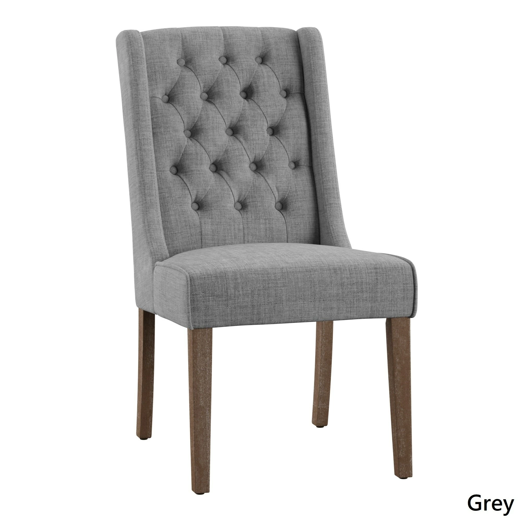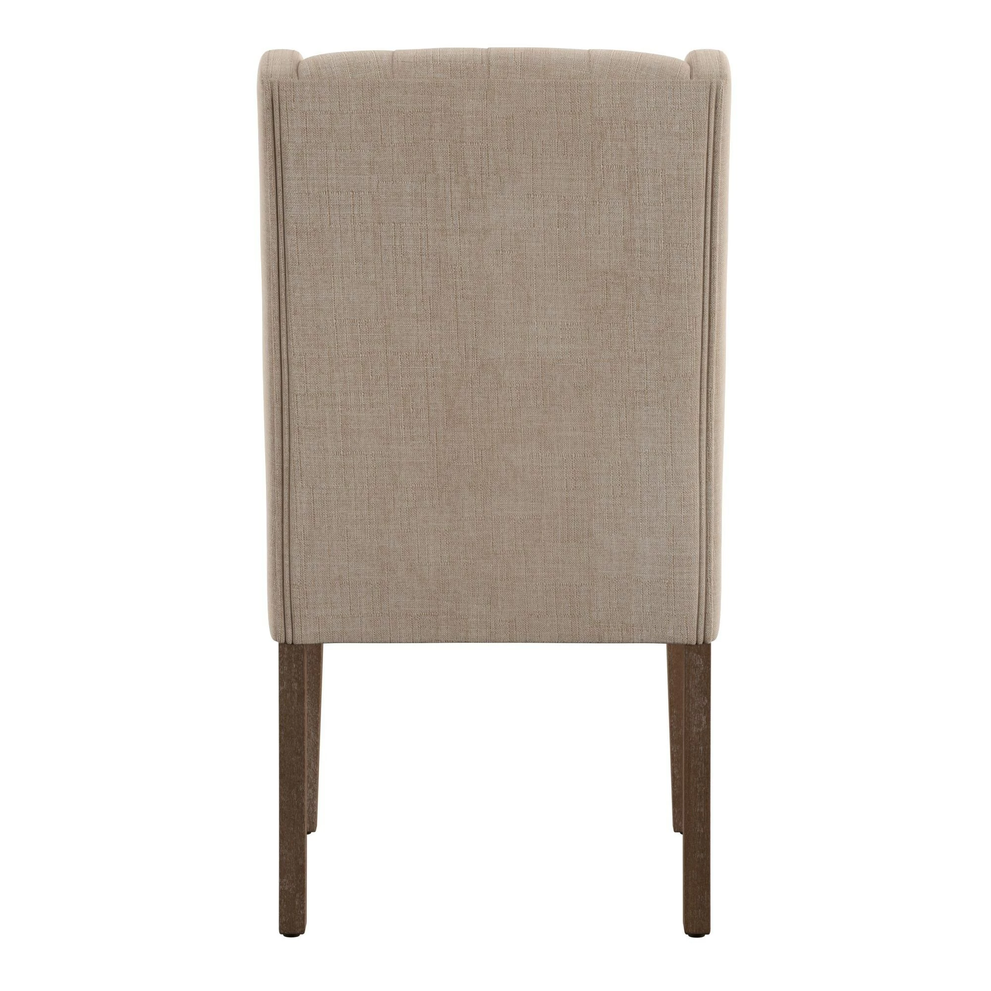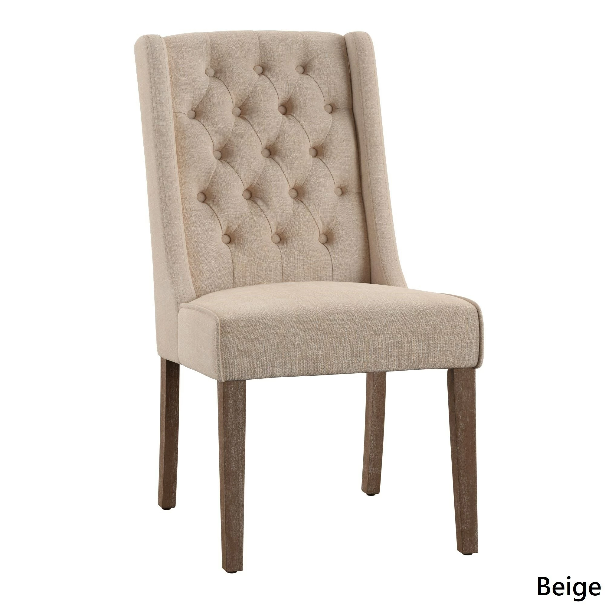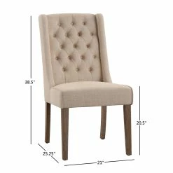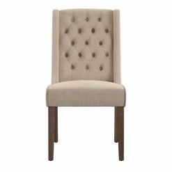 The Evelyn chestnut finish linen tufted chairs are sure to add exquisite comfort and lux style to your classically designed dining space. With cozy linen-like upholstery and the plush comfort provided by the tufted and wingback features, these chairs will soon become the favorite seat in the house. The warm, chestnut finish wood legs pair perfectly with rustic and traditional elements and provide reliable stability for frequent use. Choose from beige or grey upholstery to best suit your personal style.
