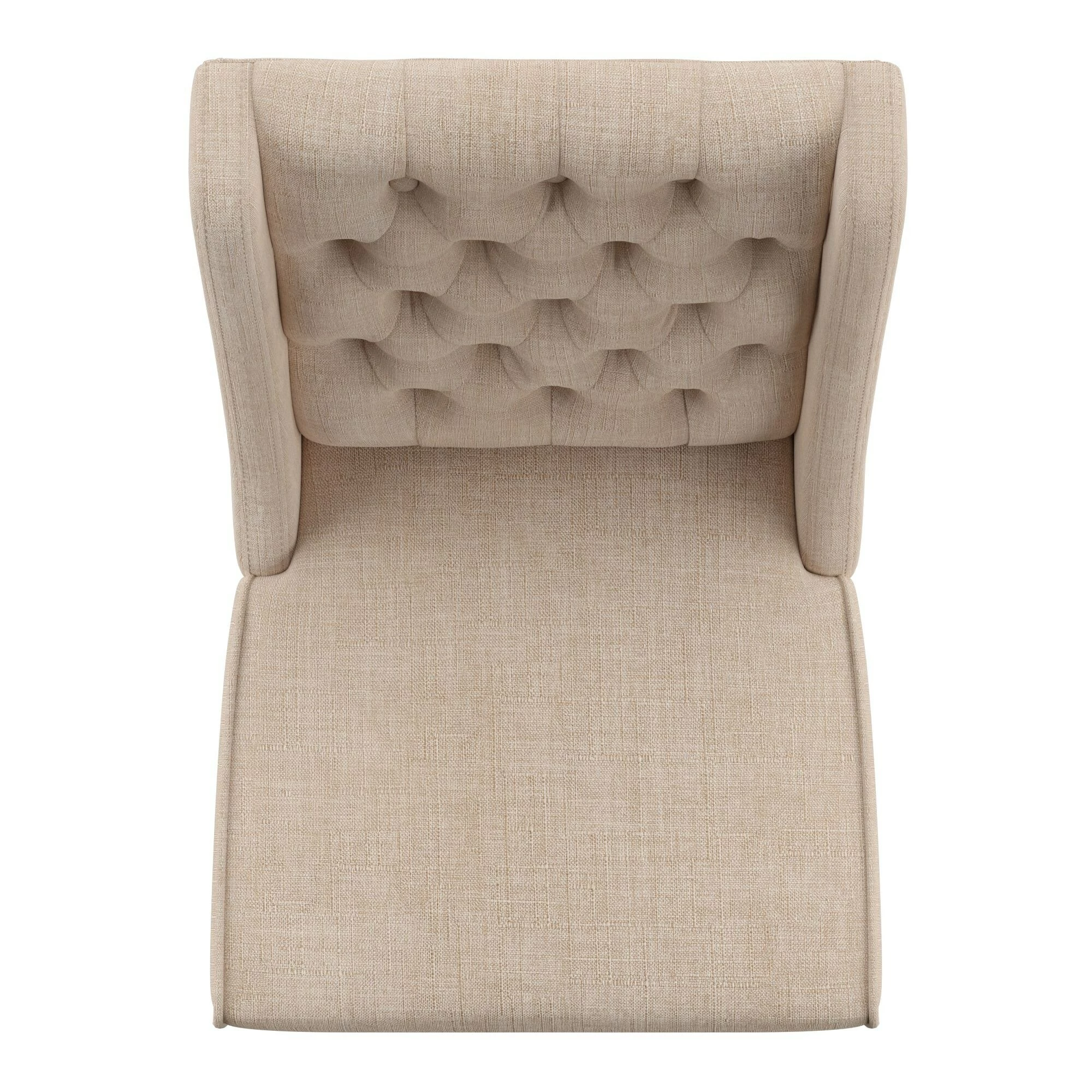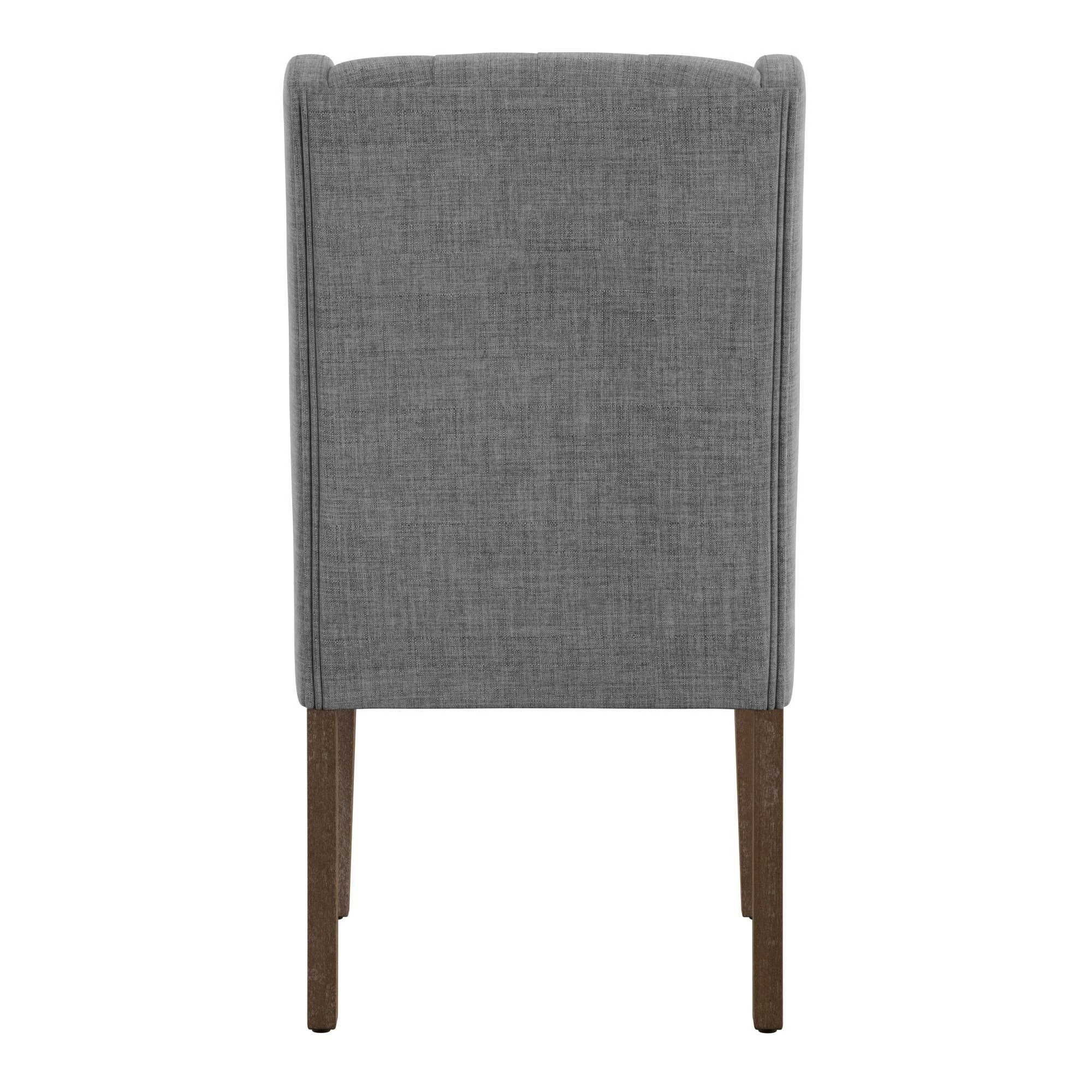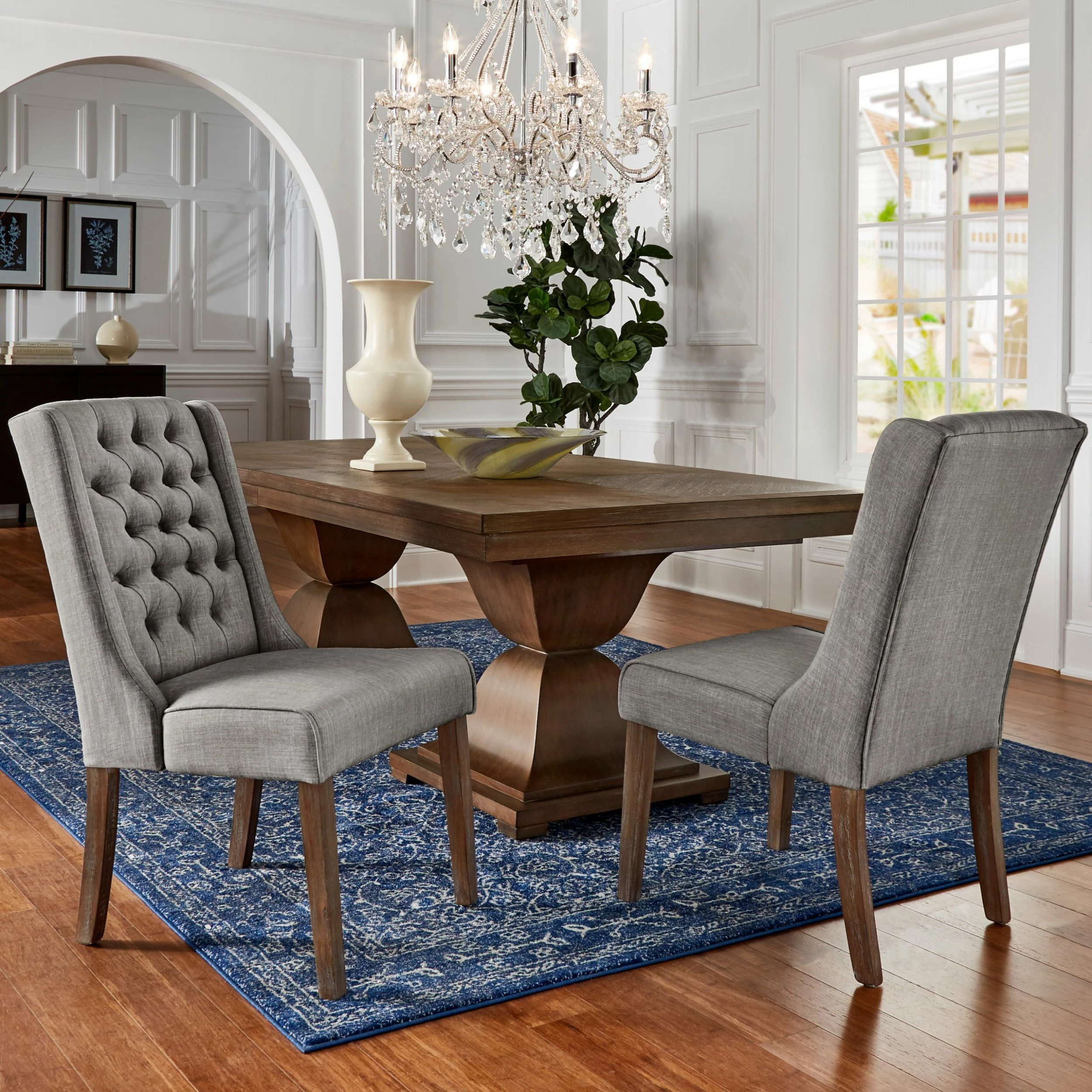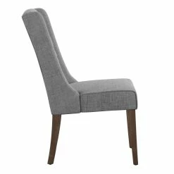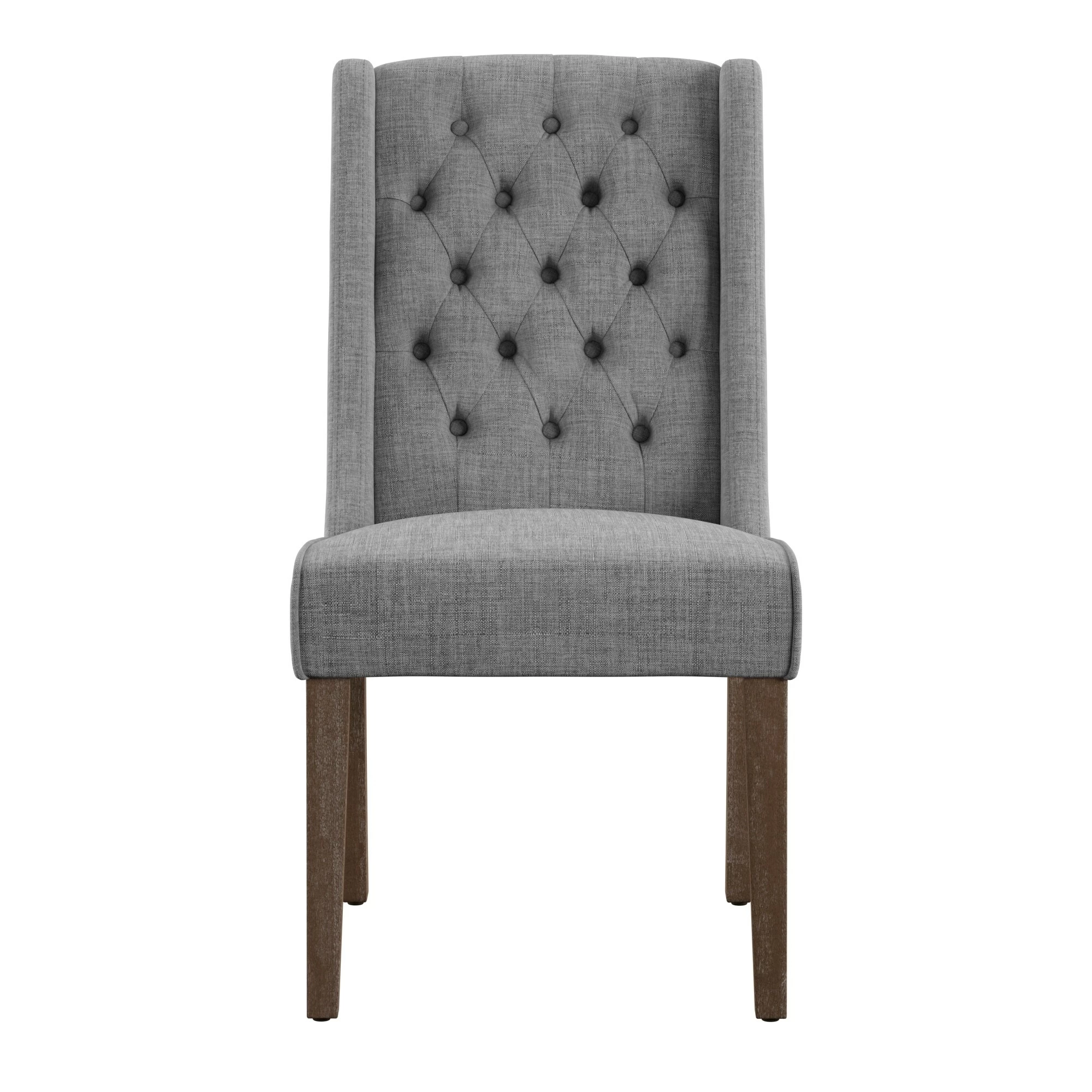 The Evelyn chestnut finish linen tufted chairs are sure to add exquisite comfort and lux style to your classically designed dining space. With cozy linen-like upholstery and the plush comfort provided by the tufted and wingback features, these chairs will soon become the favorite seat in the house. The warm, chestnut finish wood legs pair perfectly with rustic and traditional elements and provide reliable stability for frequent use. Choose from beige or grey upholstery to best suit your personal style.