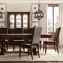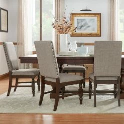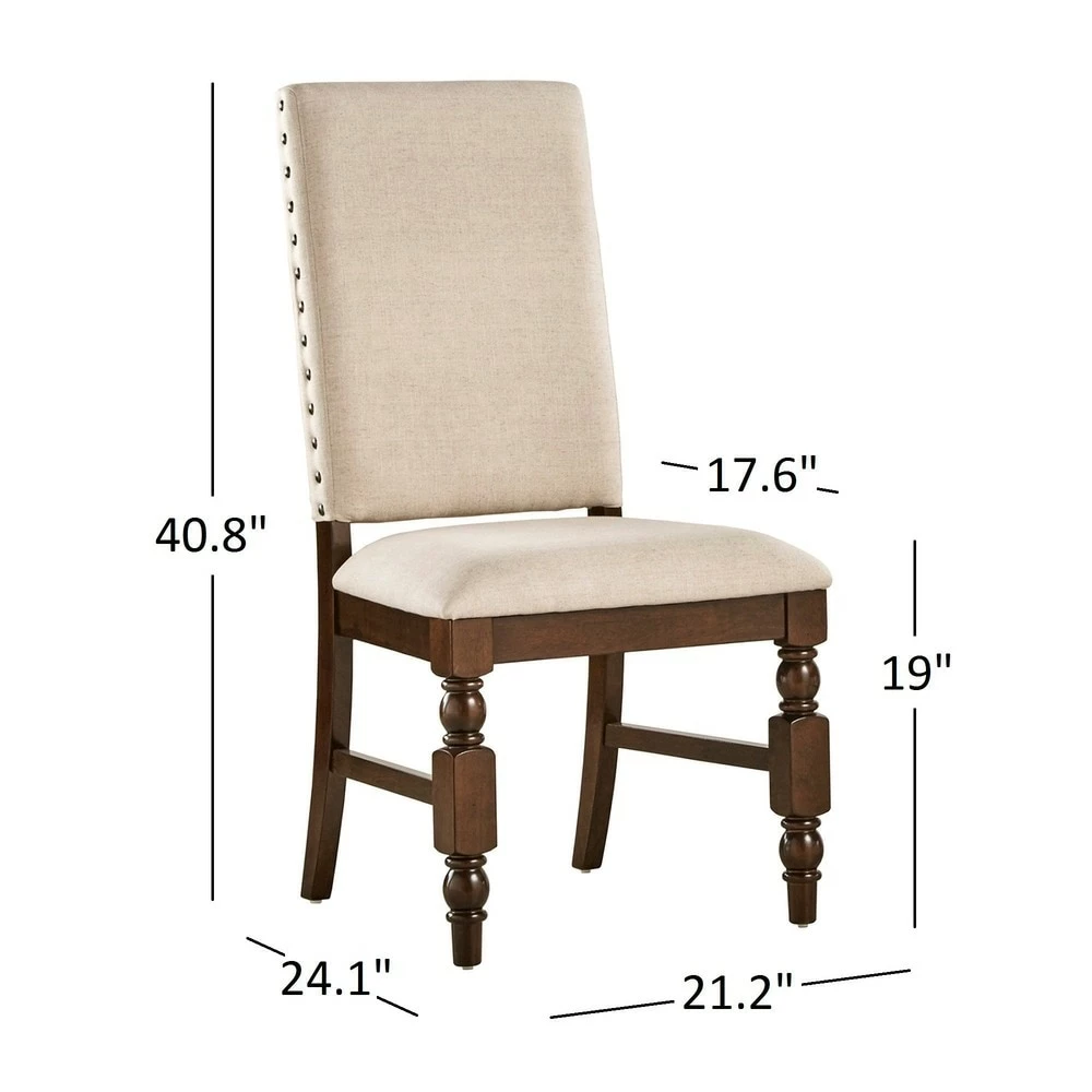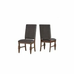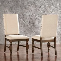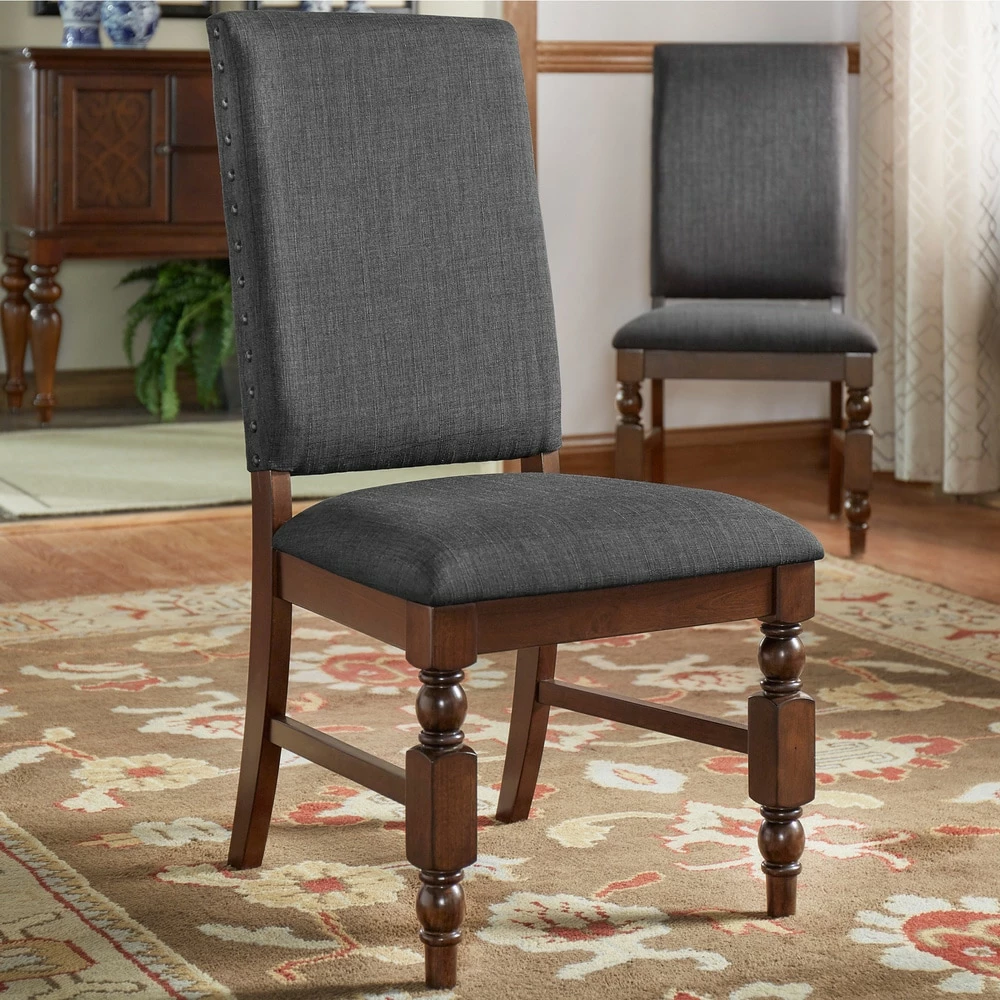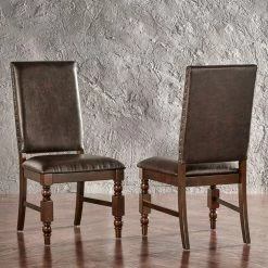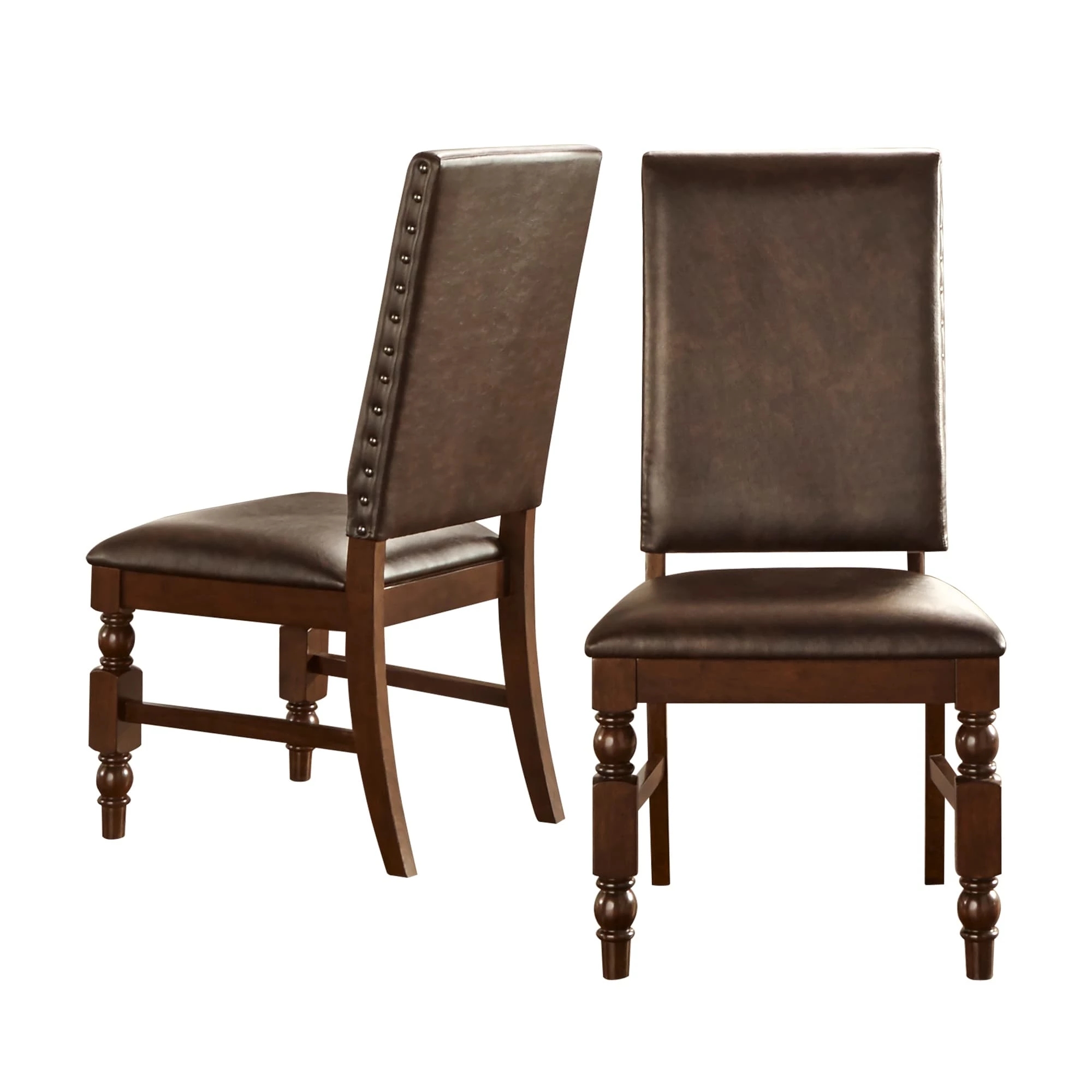 Give your traditional dining space a contemporary update with these Flatiron dining chairs. The brown wood chairs feature turned block logs, foam padding, and decorative nail head trim. Choose from four colors and PU leather or linen upholstery to perfectly complement your decor.