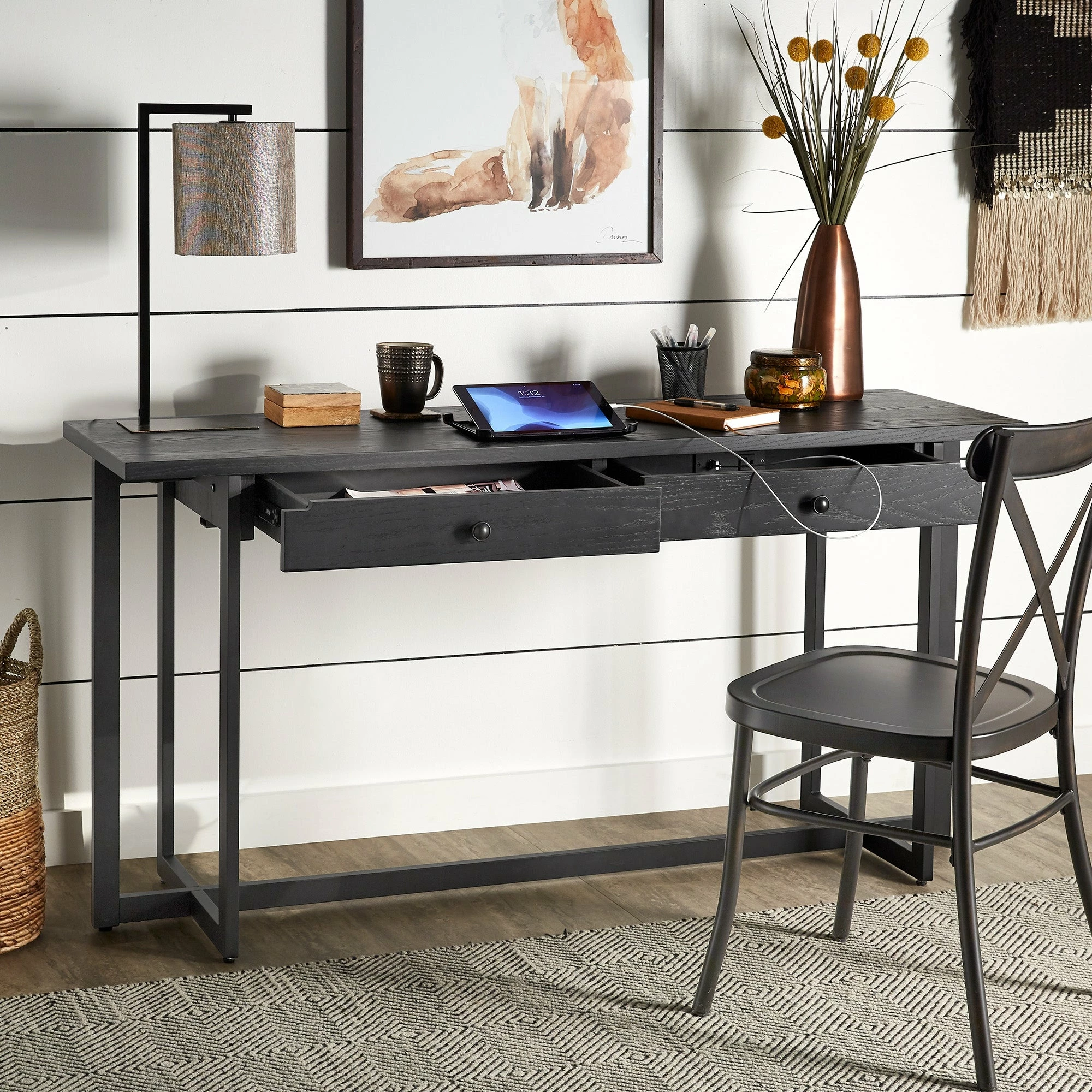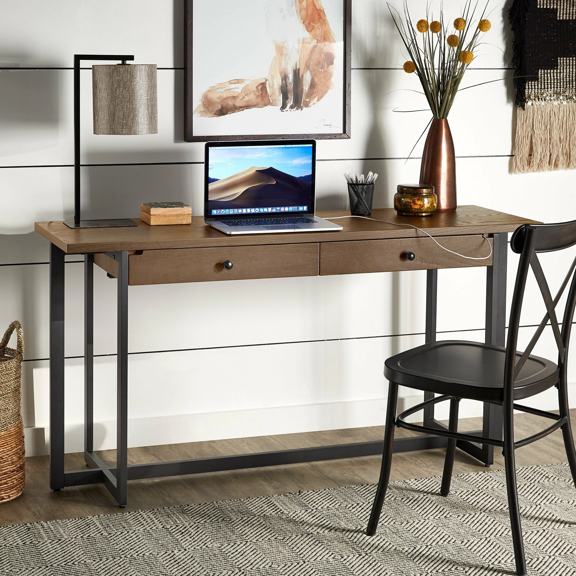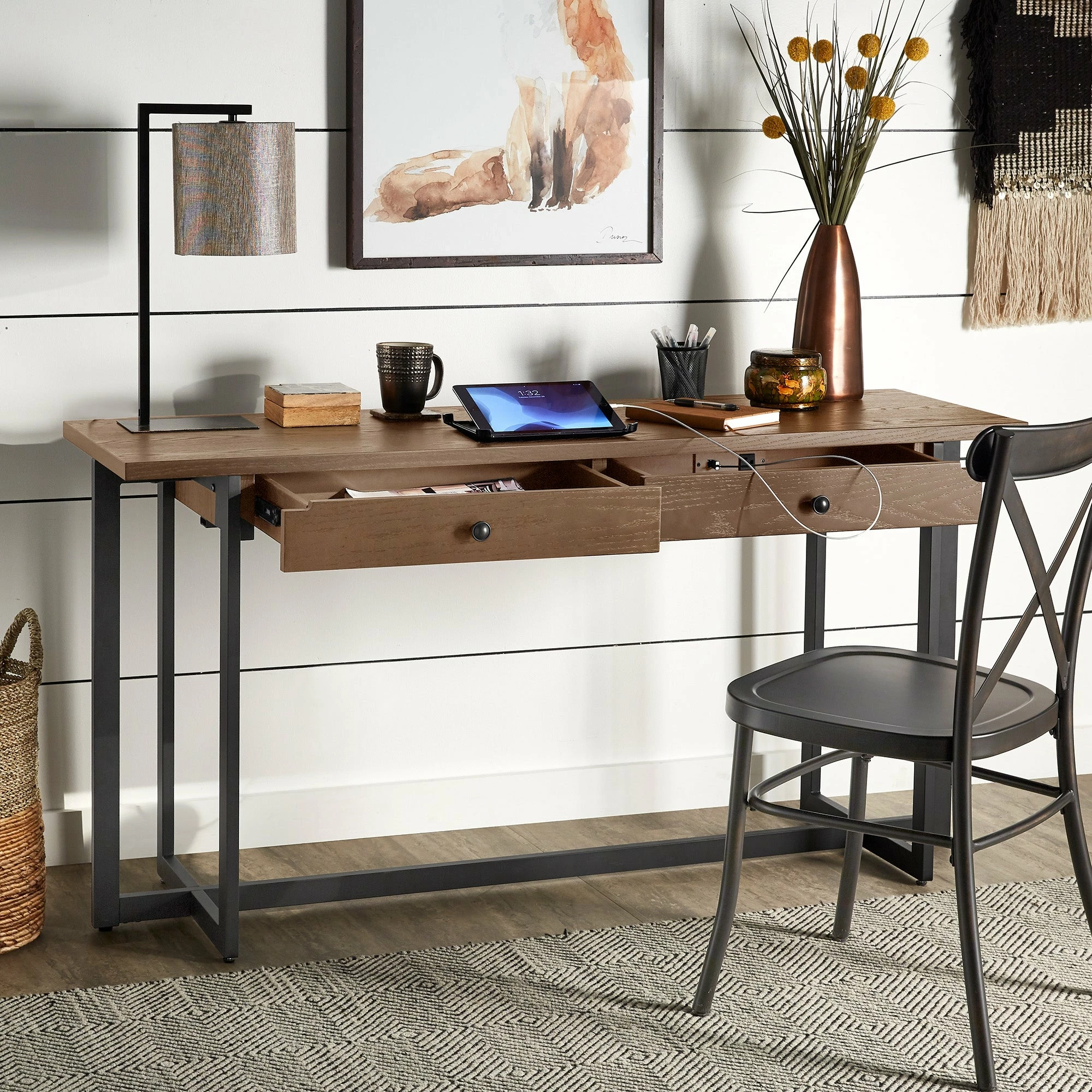 The Frazer 2-Drawer Desk with Power Outlet by iNSPIRE Q Classic is one of the most versatile pieces you could own. Perfect for any space of any size, this piece is great for setting up a workstation, with its wide table top, two spacious drawers, and a power outlet. With a neutral color scheme and distressed wood grain finish, this simple desk can blend with a variety of design styles.