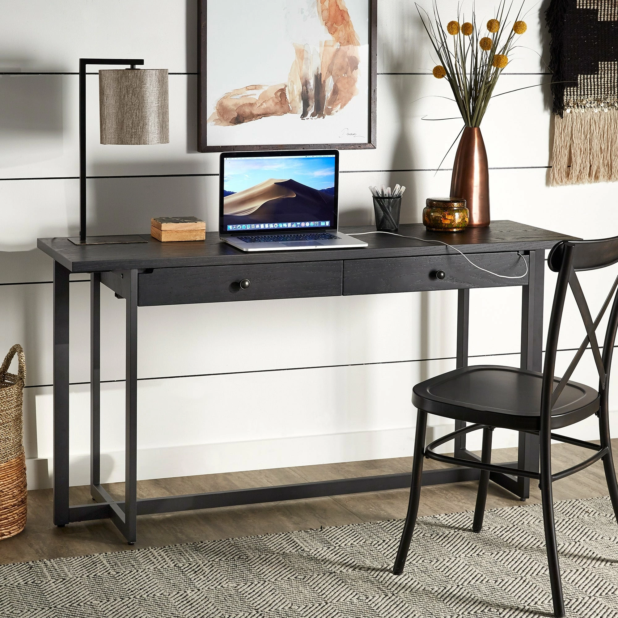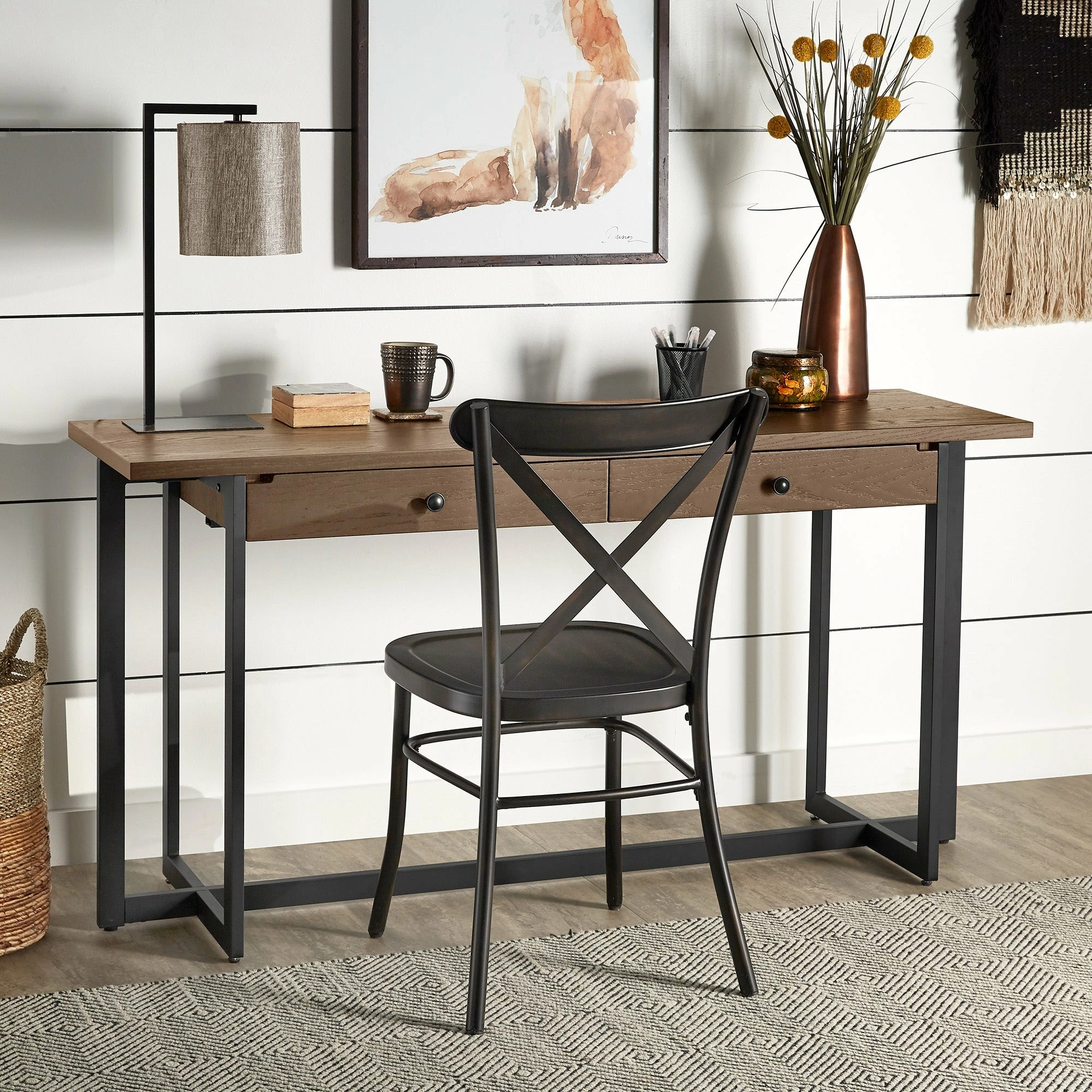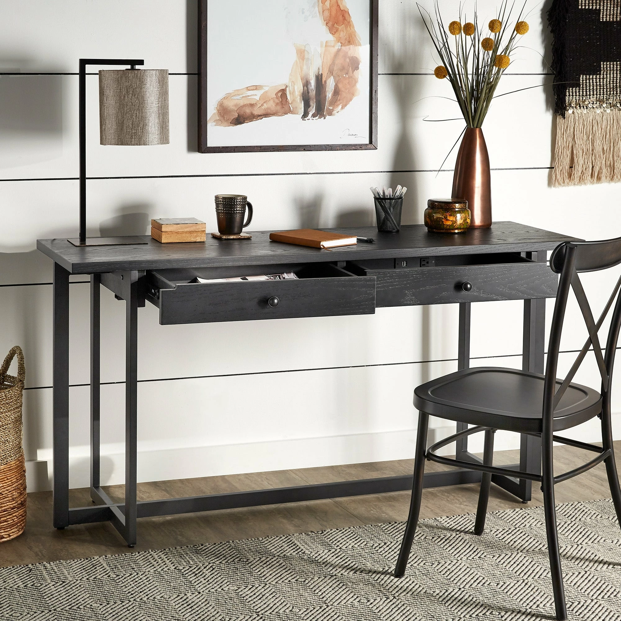 The Frazer 2-Drawer Desk with Power Outlet by iNSPIRE Q Classic is one of the most versatile pieces you could own. Perfect for any space of any size, this piece is great for setting up a workstation, with its wide table top, two spacious drawers, and a power outlet. With a neutral color scheme and distressed wood grain finish, this simple desk can blend with a variety of design styles.