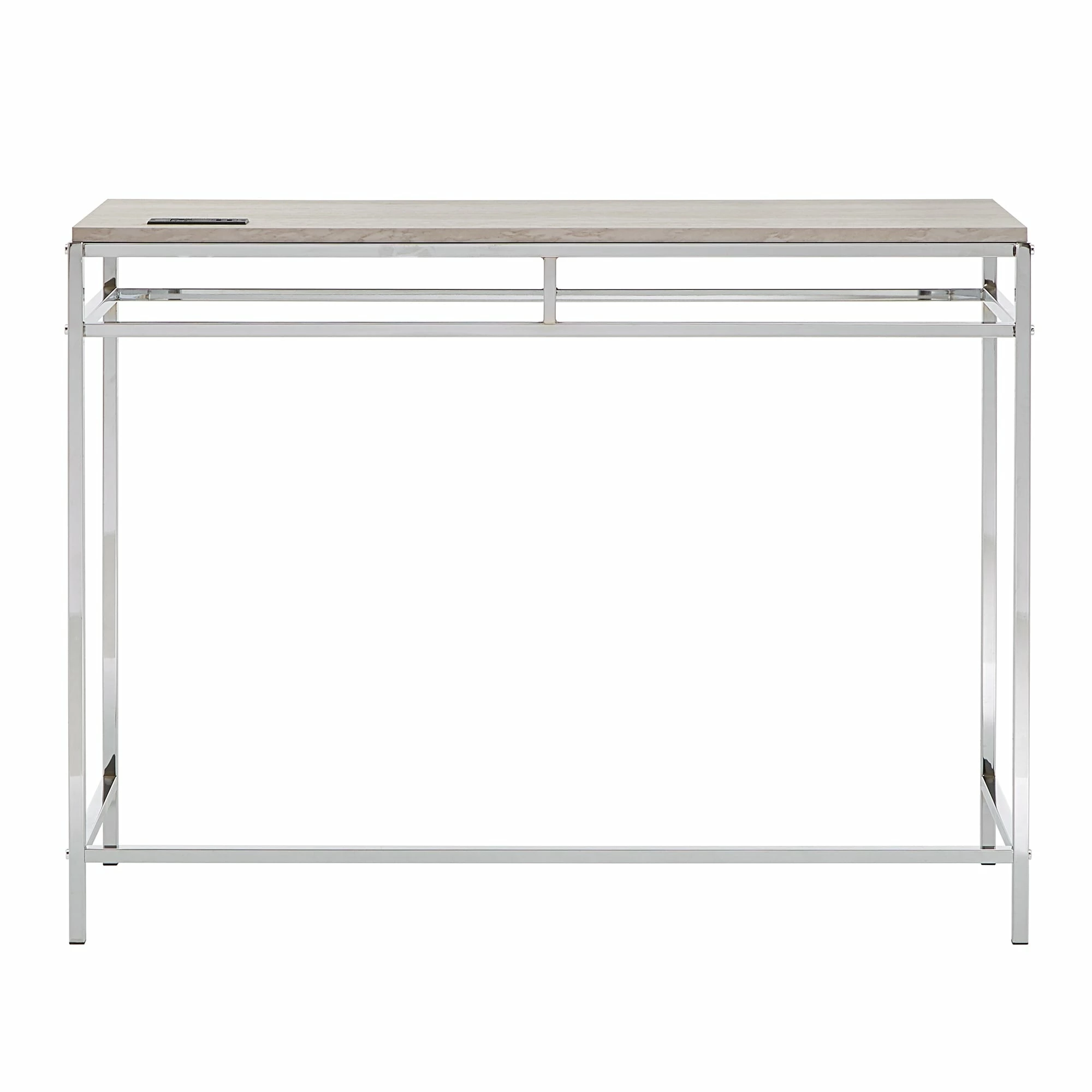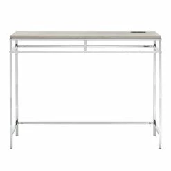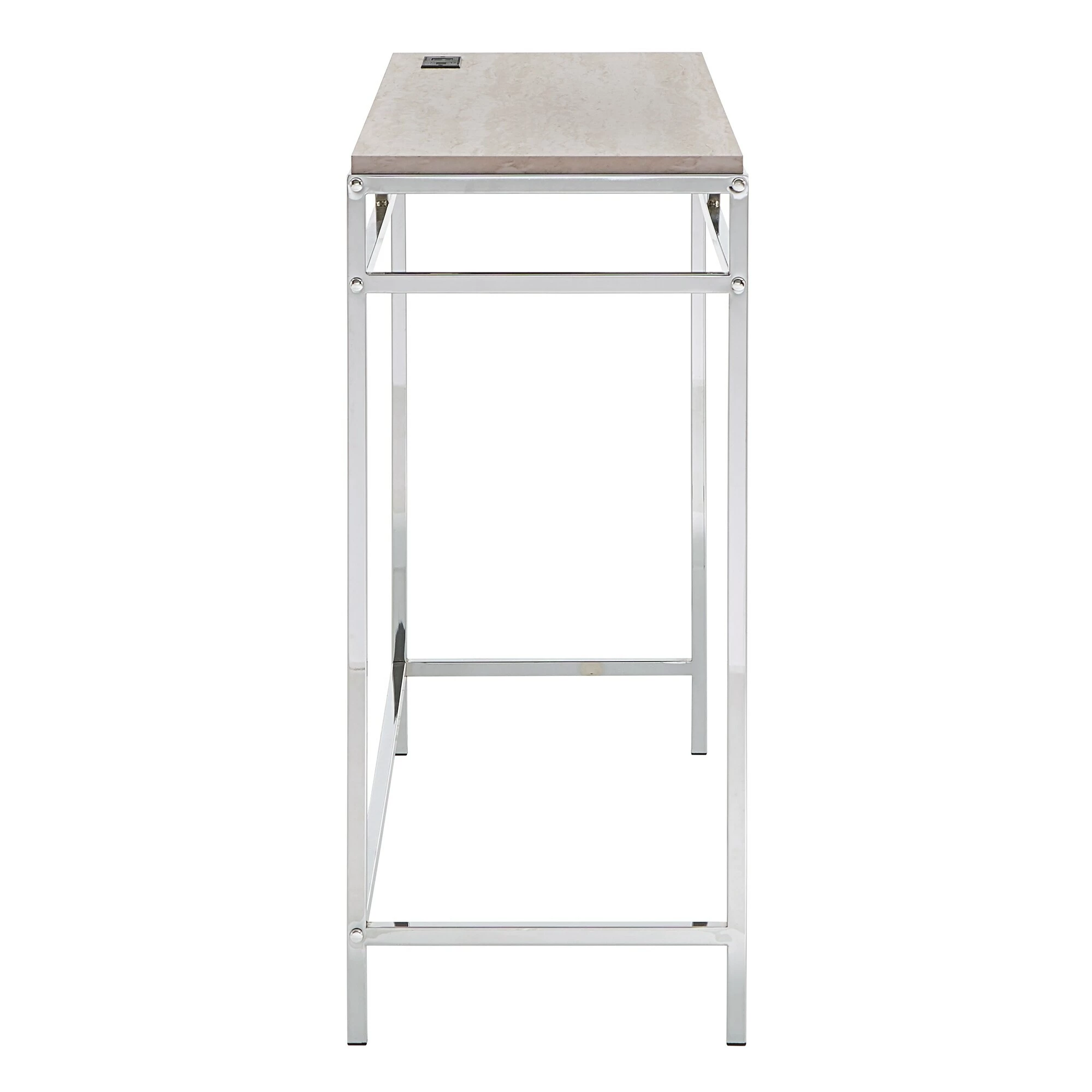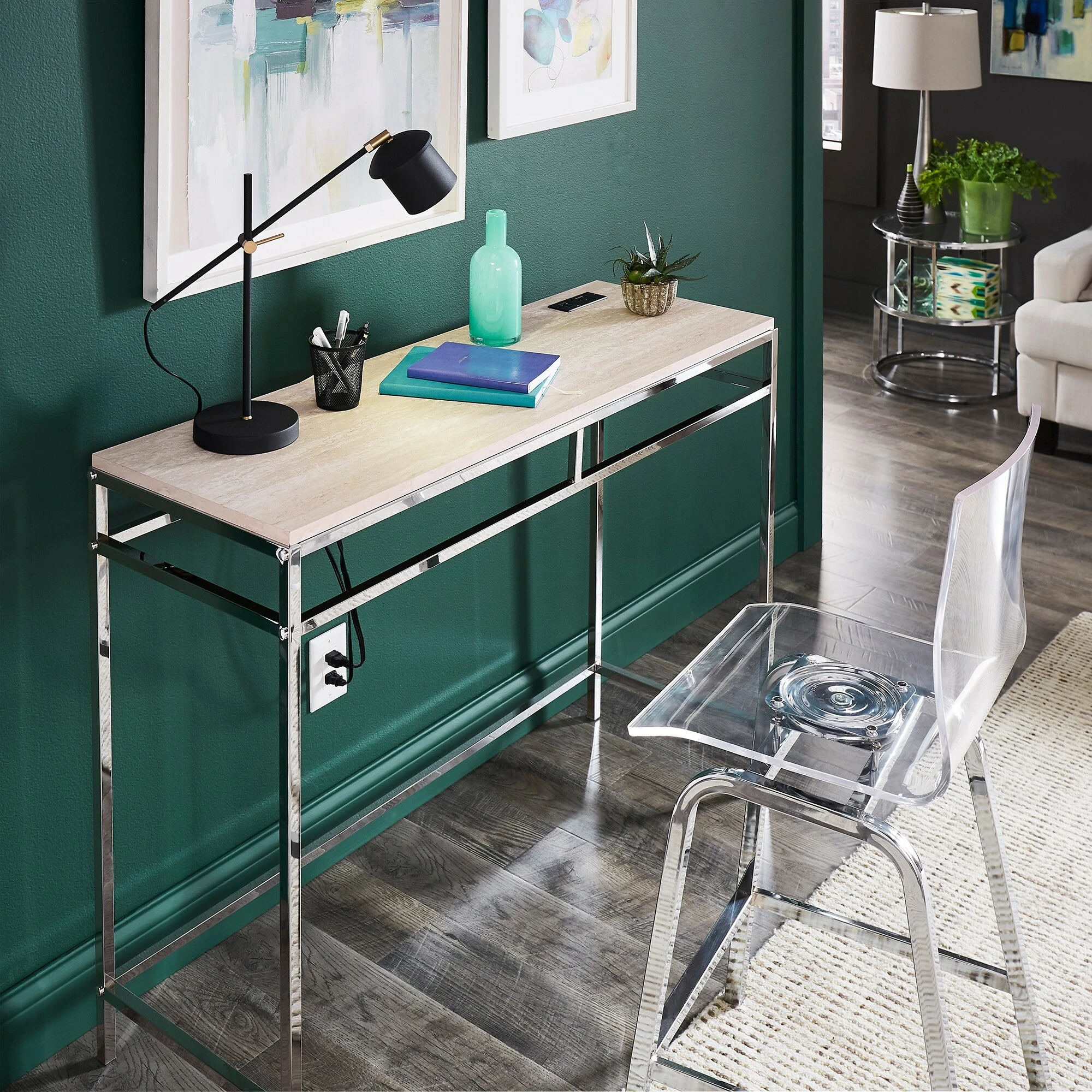 Glam styling meets classic accents in this sleek rectangular cutout desk. This Chrome Finish Counter Height Desk with Faux Marble Top and USB Charging Port is sure to become your new favorite space to work on homework, journal, and catch up with friends on social media! With a convenient power outlet and 2 USB charging ports built right into the top of the desk, you’ll never have to worry about your electronics losing charge while working on priority projects- we know how time consuming it can be to find an available outlet. Light finish smooth touch faux marble graces the top of this desk to add a simple classic styling, while the chrome capped accents and base add a sophisticated glam vibe in order to complete your home office in a stylish way!