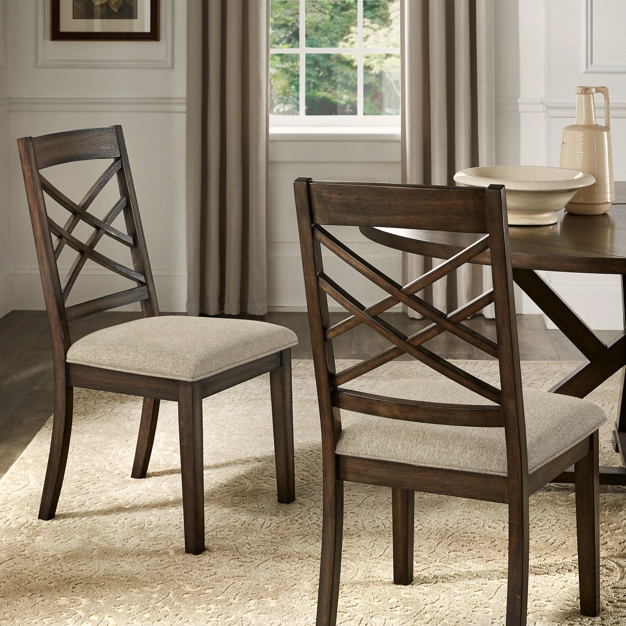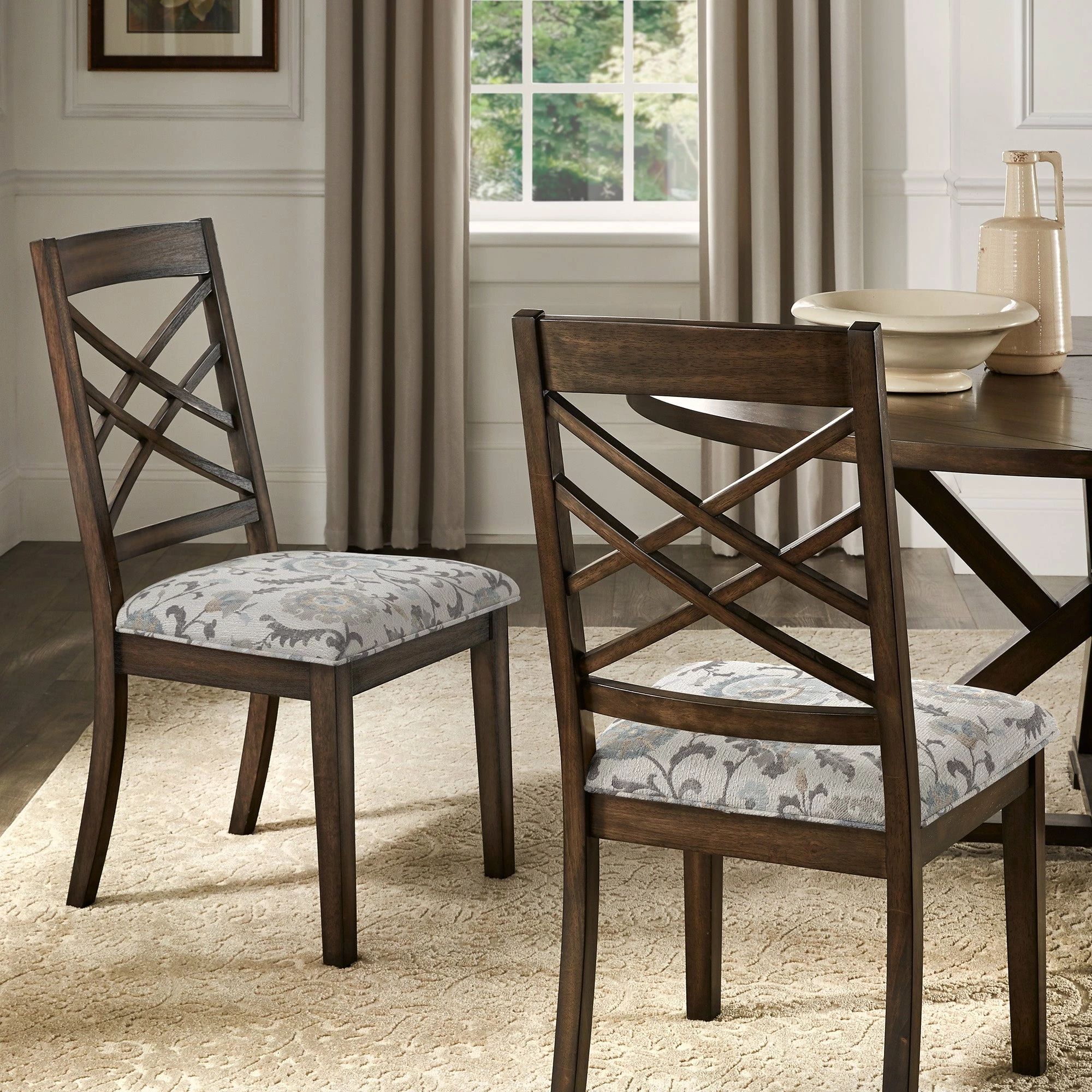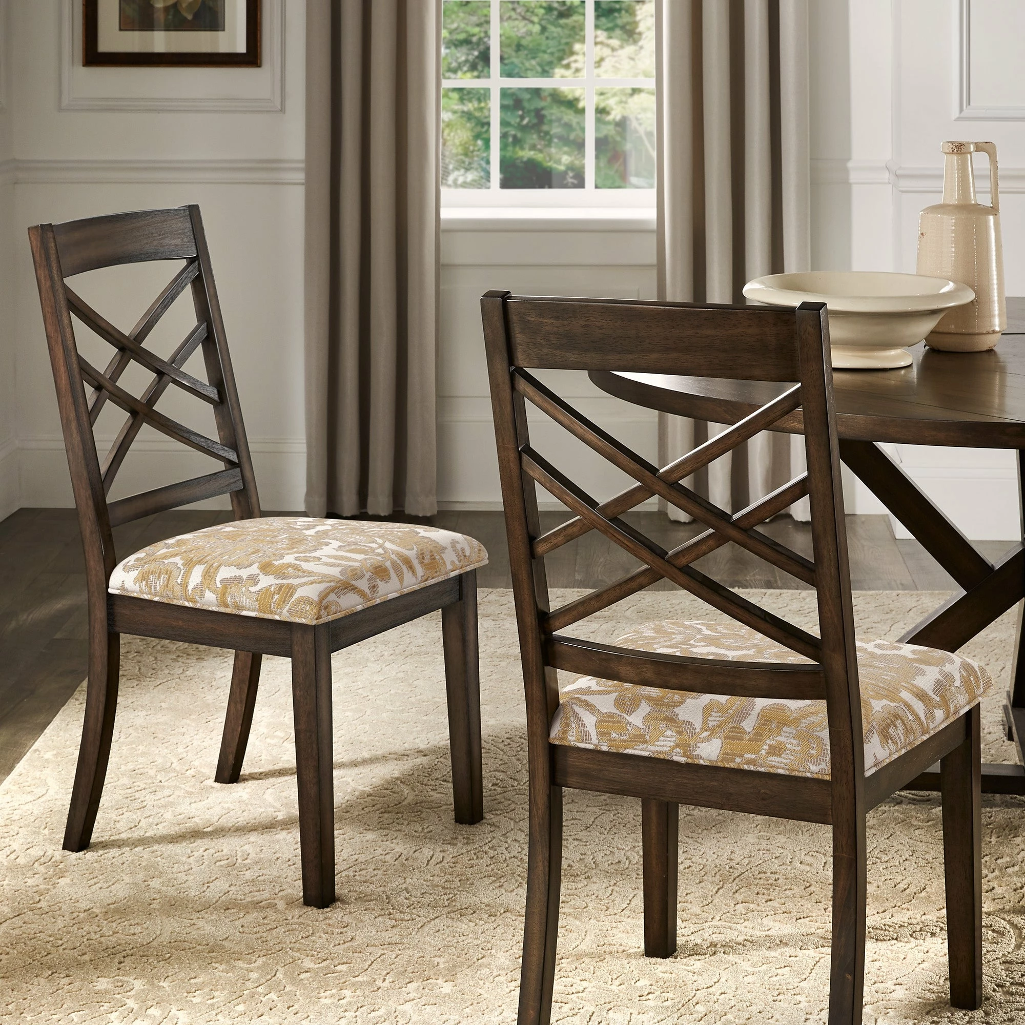 Enhance the dining experience of your family guests with these Custom Upholstered Espresso Finish Dining Chairs (Set of 2) from iNSPIRE Q. These chairs feature soft and cushioned upholstered seats so you can dine in luxurious comfort, while the lattice style backs provide support and a touch of classic beauty. With stunning custom upholstery “made to order”, these chairs are one of a kind, so you can truly create a look that’s all your own. The espresso finish blends seamlessly with any color scheme while solid wood construction provides ensured durability for everyday use.