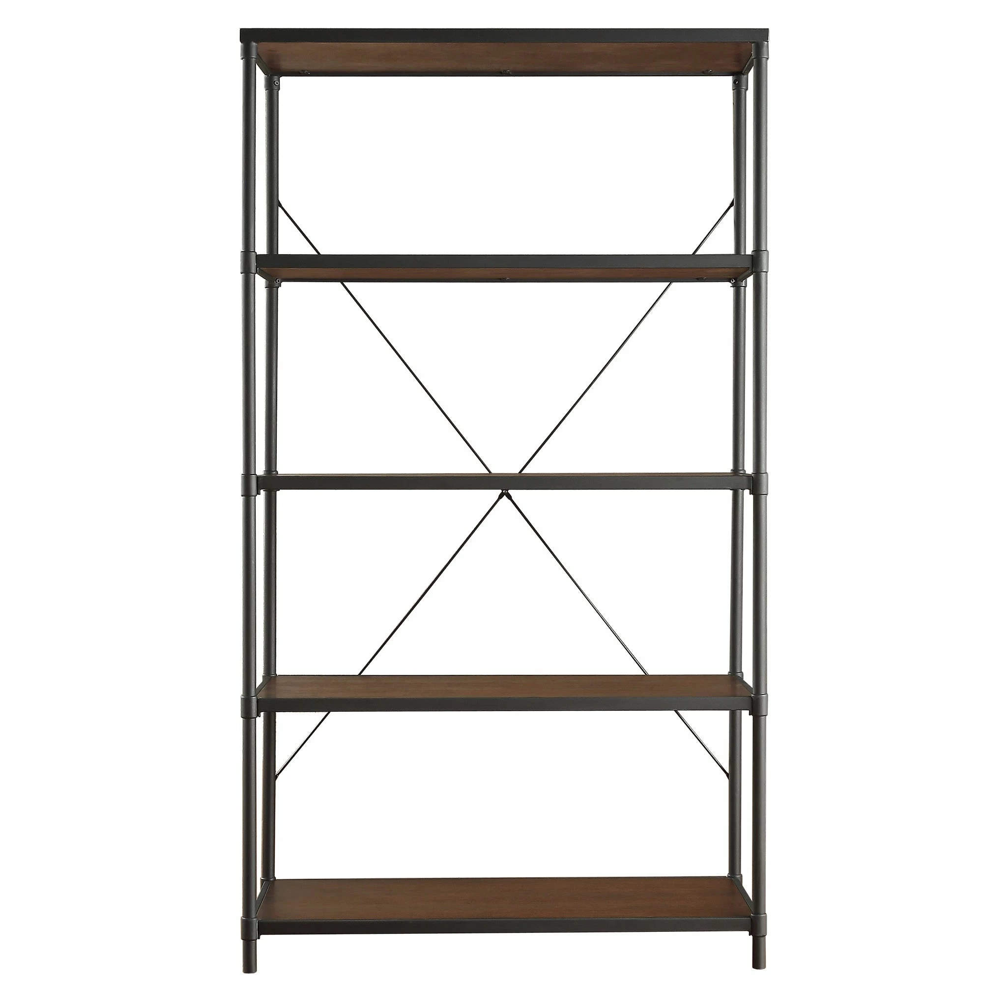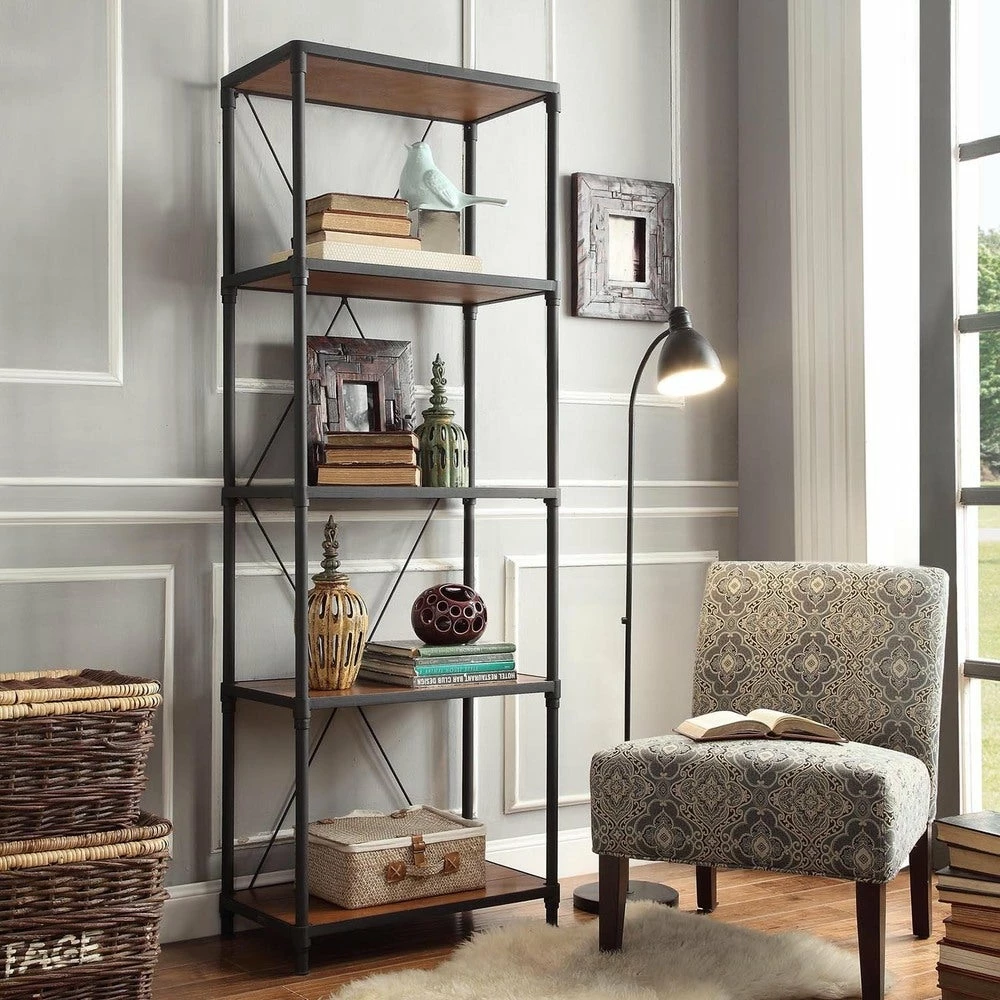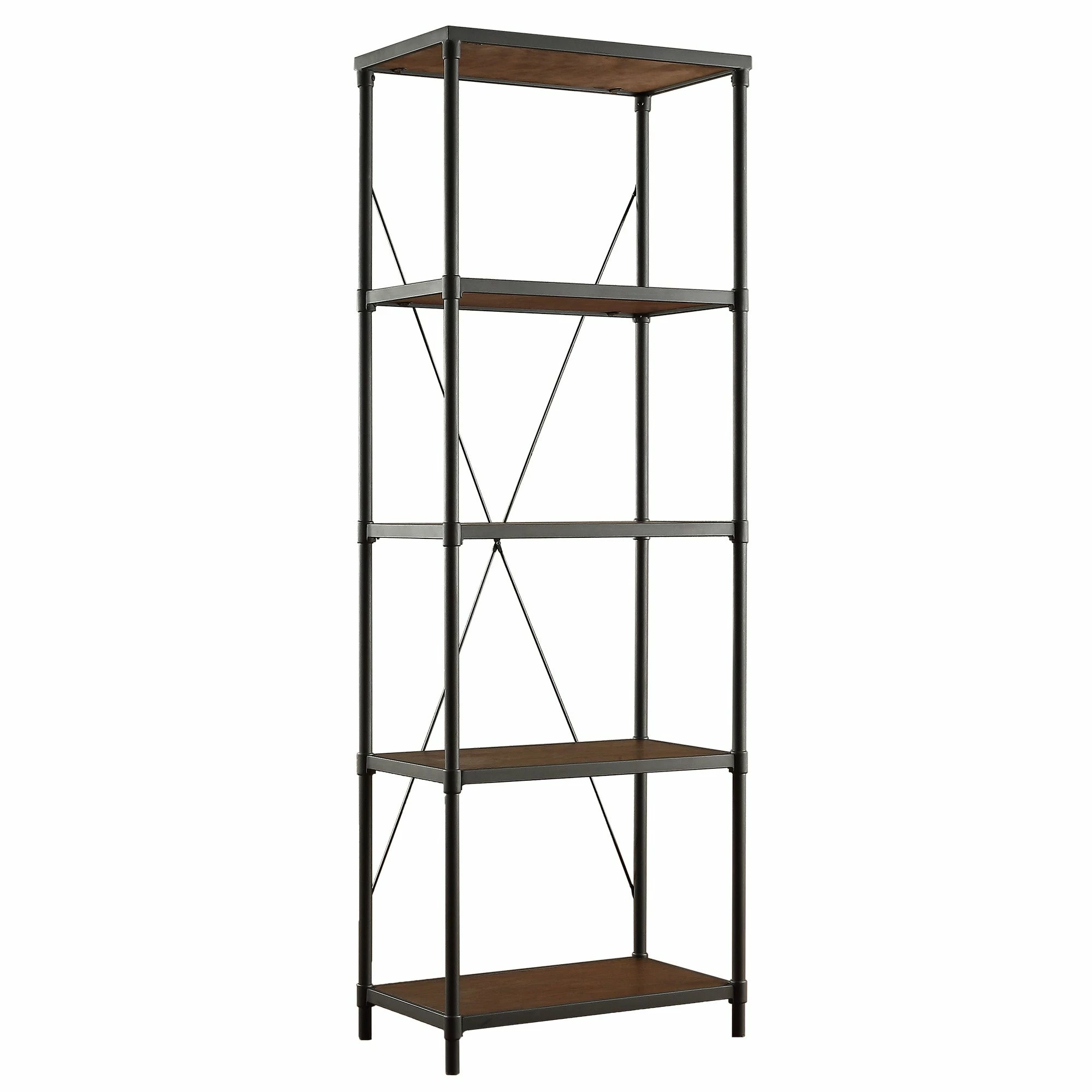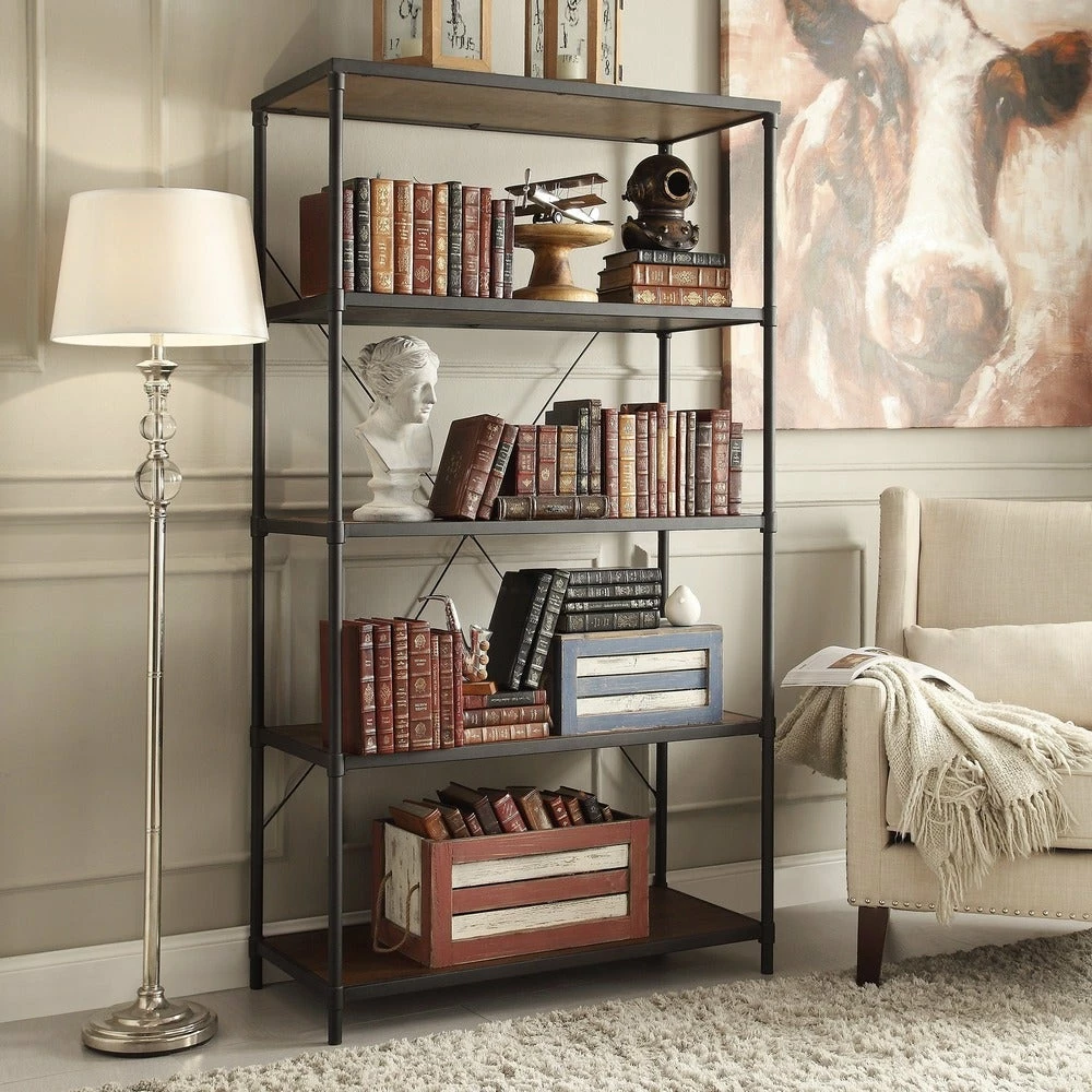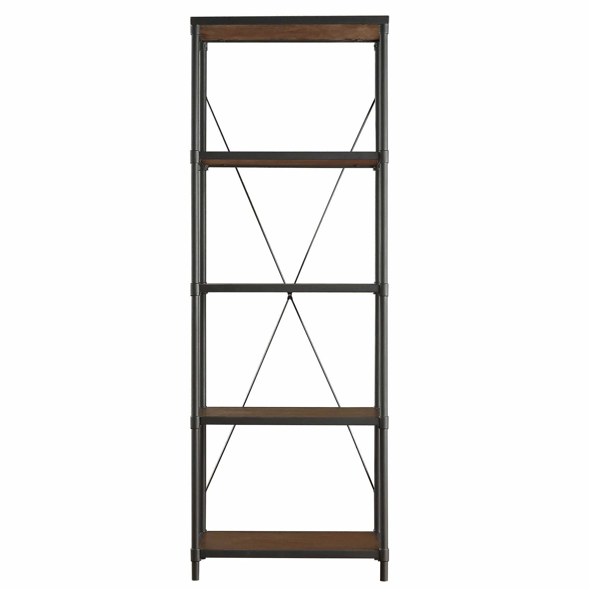 Display all your favorite books, vases, and keepsakes on the four roomy shelves of this Harrison bookcase. Featuring a metal pipe frame in painted finish, this bookcase offers sturdy support and durable service. An open back with an x-shaped brace enhances the classic industrial look of this bookcase.