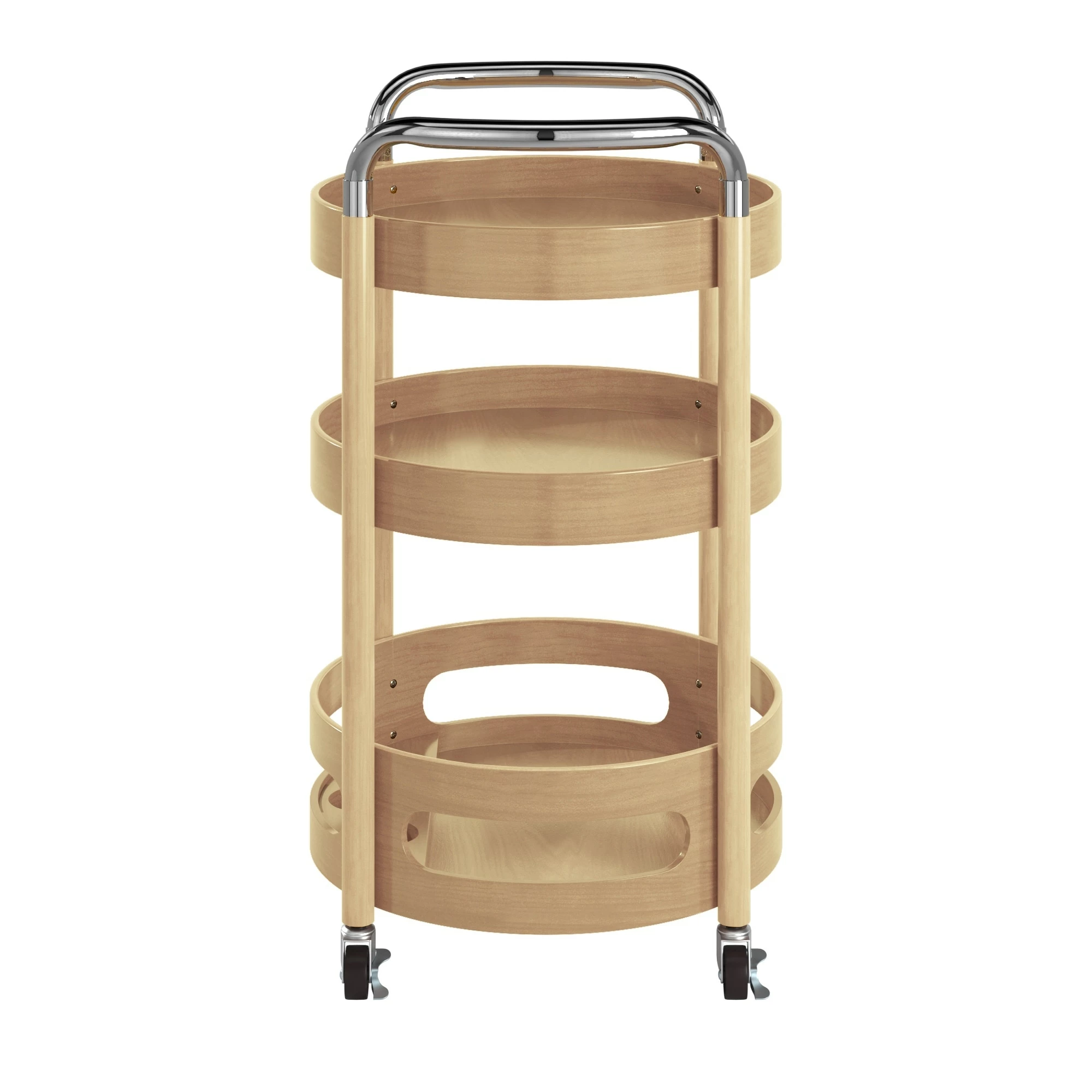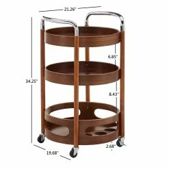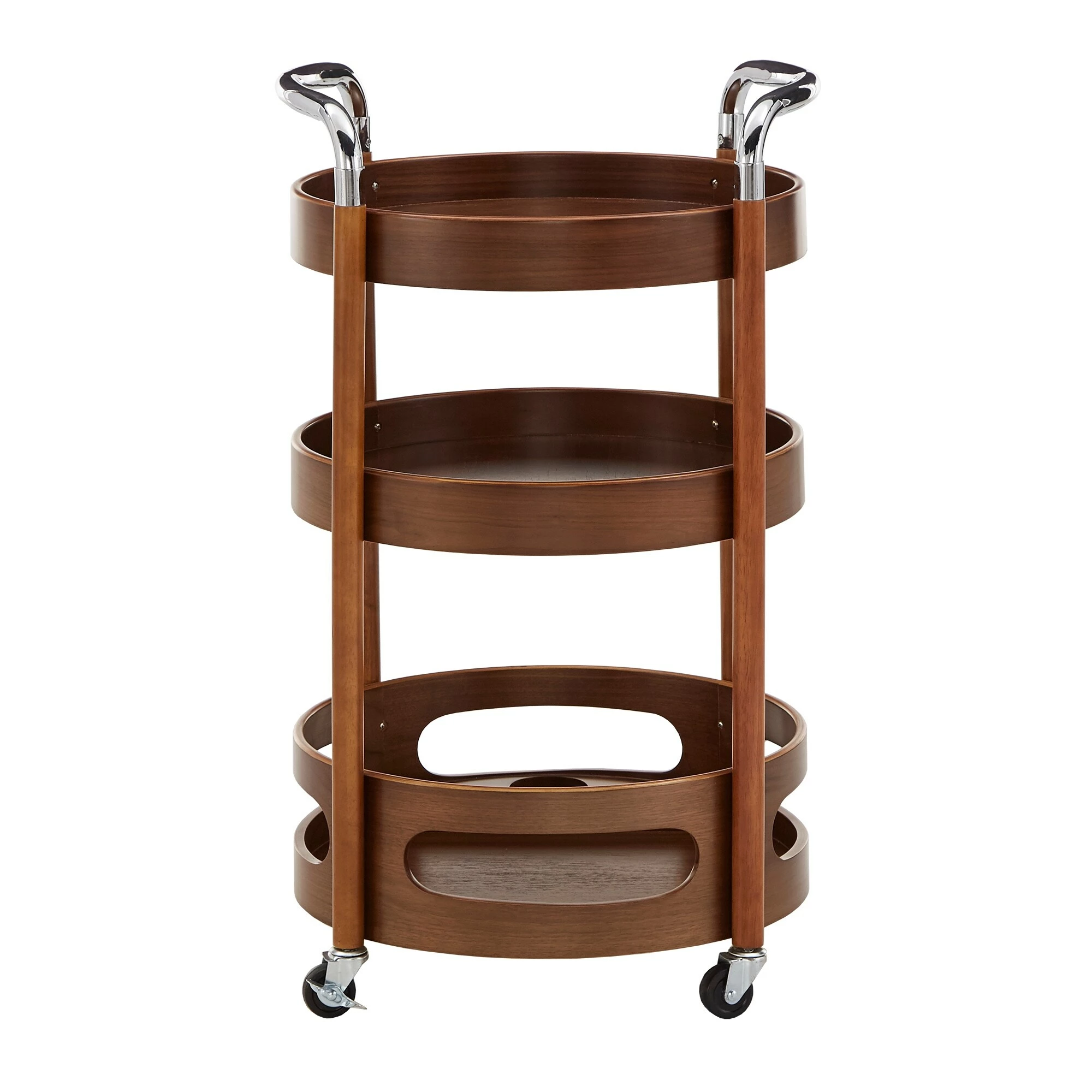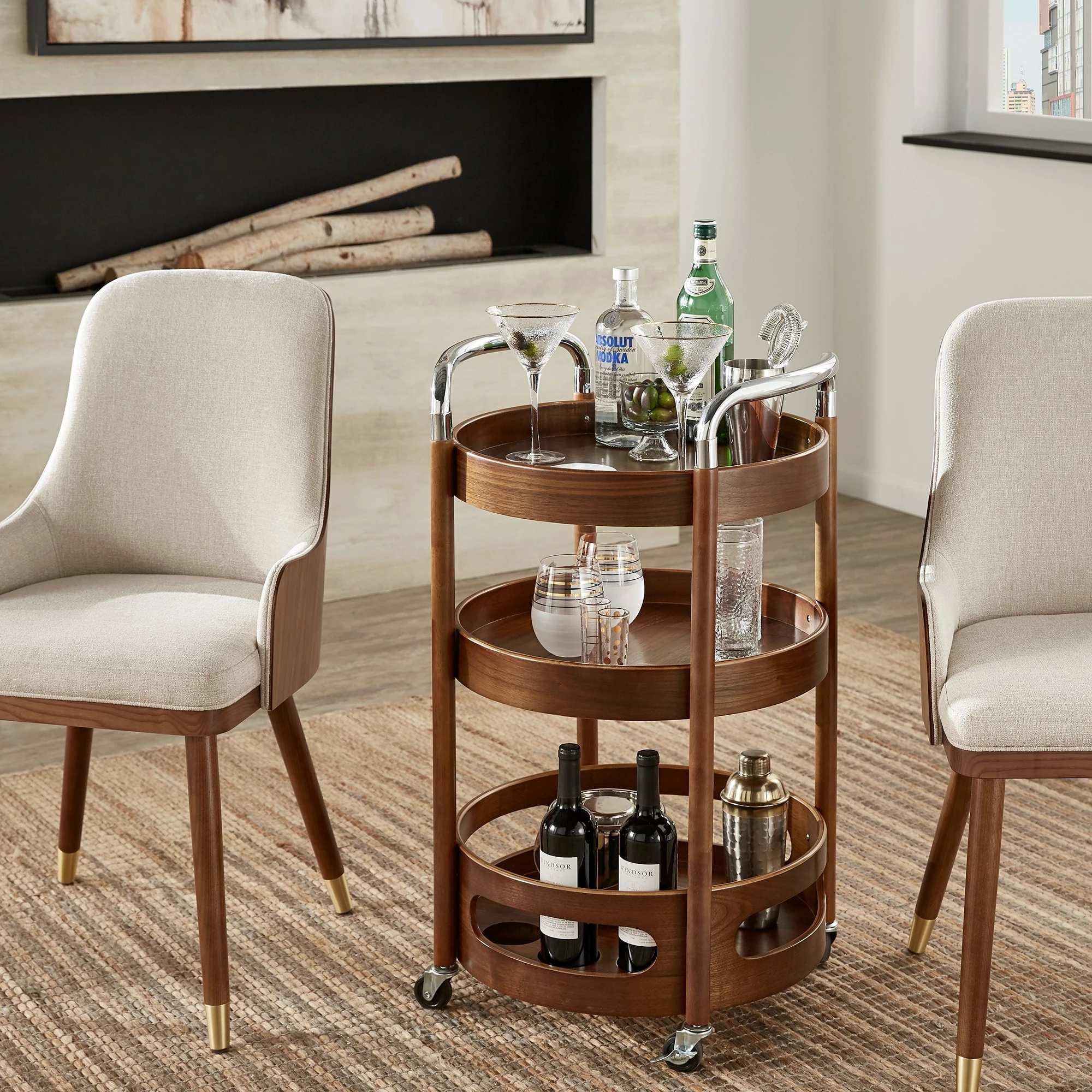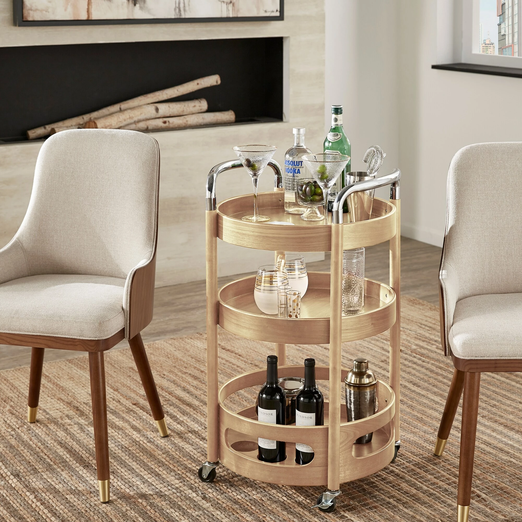Bring home a fresh aesthetic with the Haylee Round Bar Cart from iNSPIRE Q® Modern! New-age curved chrome handles add a bold contrast to this luxe solid wood cart. Three wide tiered round shelves allow you to store all of your bar essentials in a convenient and easy to organize way. This spacious bar cart has the capability to hold glassware, bottles, and other bar essentials with ease. Tall mixers, wide ice buckets, and bottles fit best on the bottom shelf, while the upper two shelves can accommodate glassware, garnishing, or other smaller items! With simple styling, this bar cart is perfect for those who enjoy a minimalist look and feel.