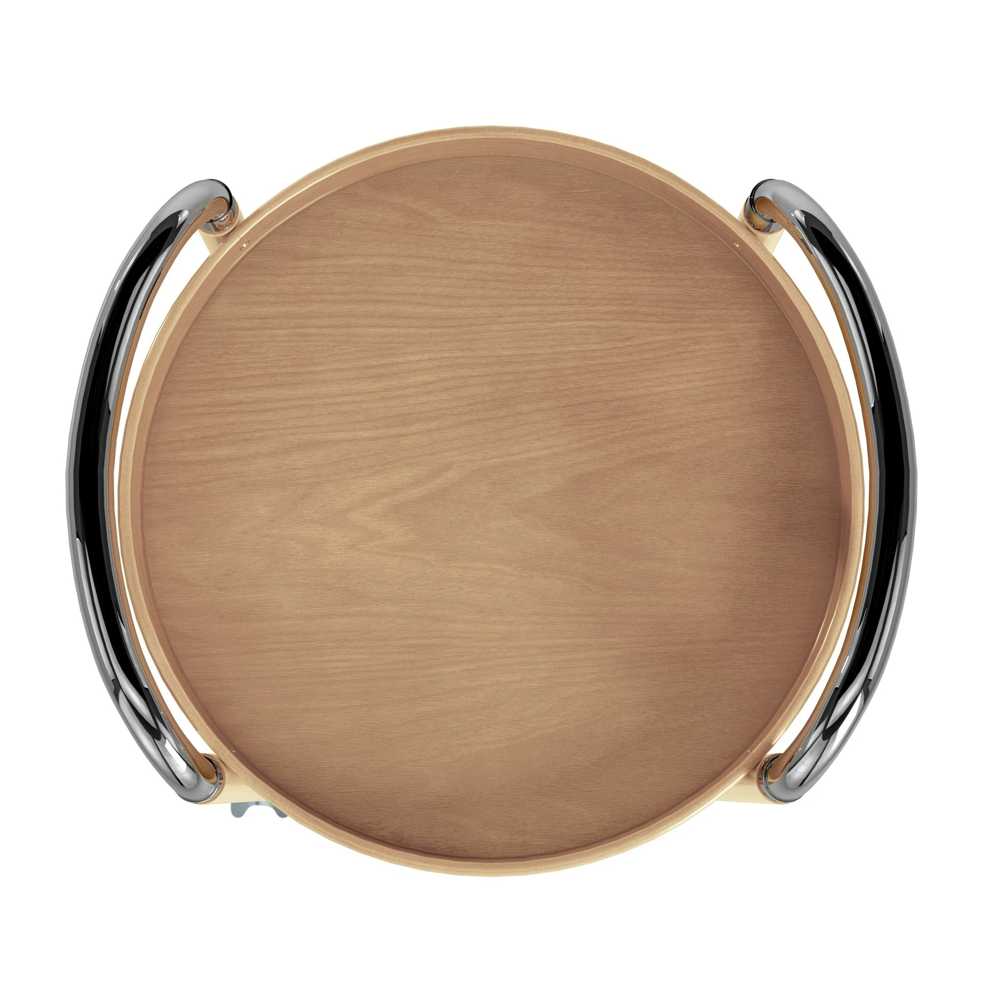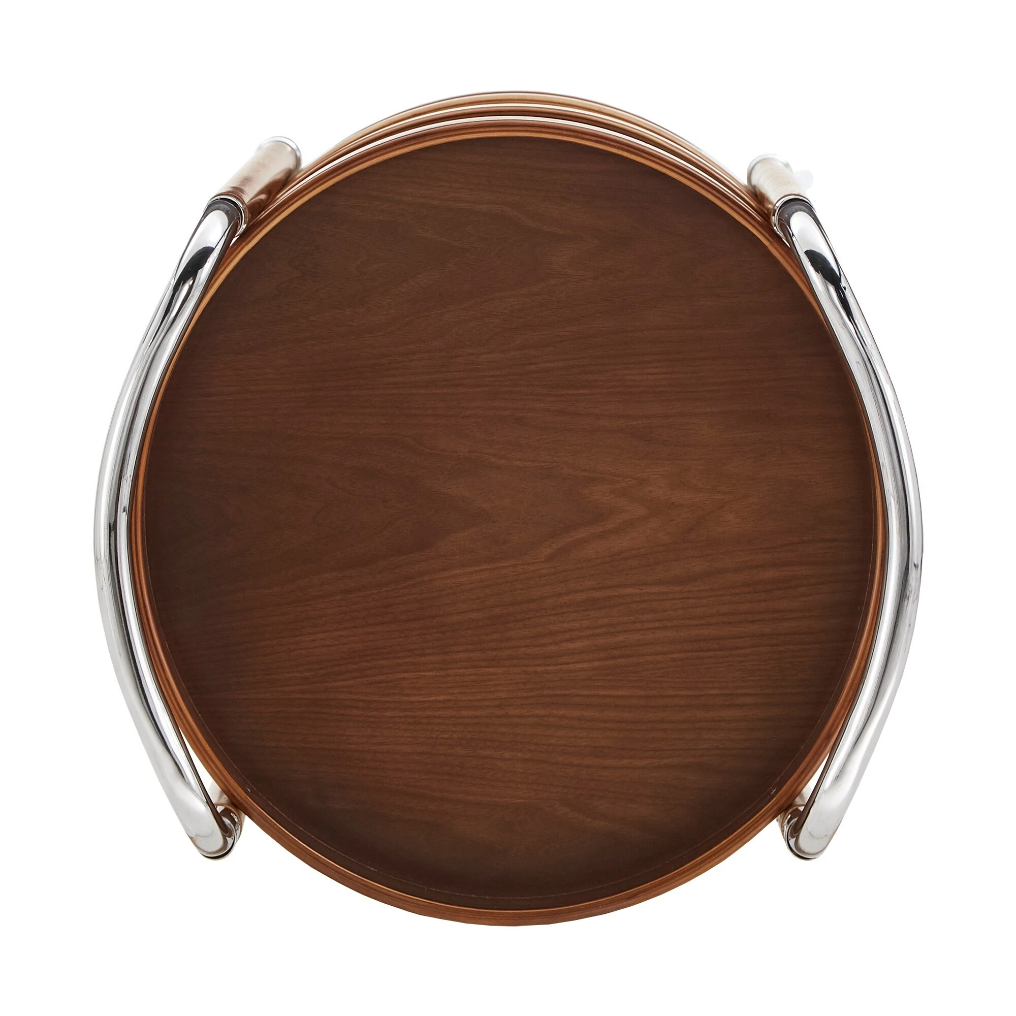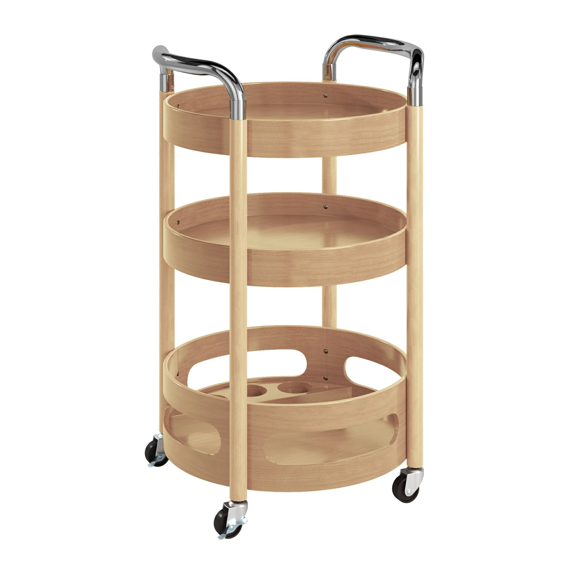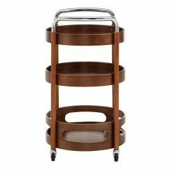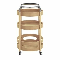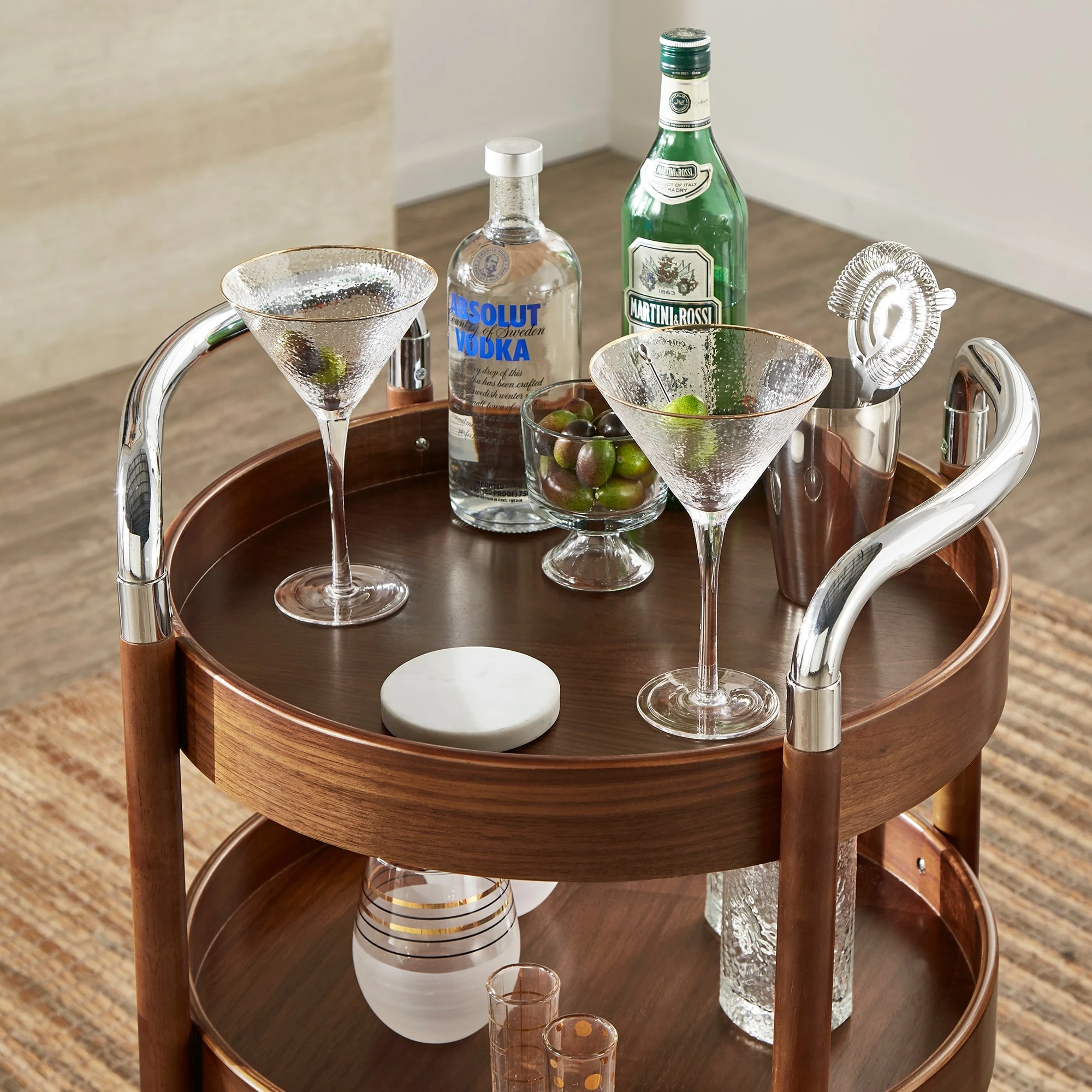 Bring home a fresh aesthetic with the Haylee Round Bar Cart from iNSPIRE Q® Modern! New-age curved chrome handles add a bold contrast to this luxe solid wood cart. Three wide tiered round shelves allow you to store all of your bar essentials in a convenient and easy to organize way. This spacious bar cart has the capability to hold glassware, bottles, and other bar essentials with ease. Tall mixers, wide ice buckets, and bottles fit best on the bottom shelf, while the upper two shelves can accommodate glassware, garnishing, or other smaller items! With simple styling, this bar cart is perfect for those who enjoy a minimalist look and feel.