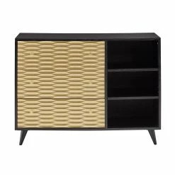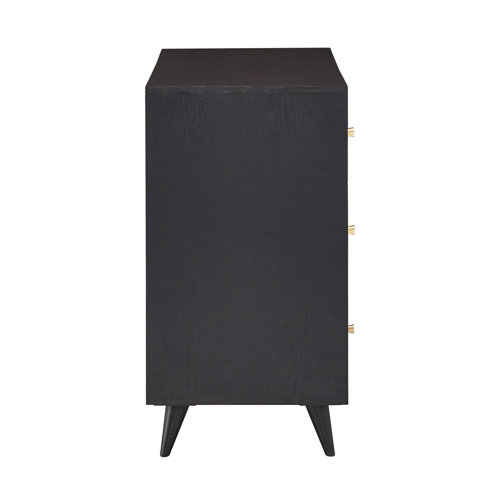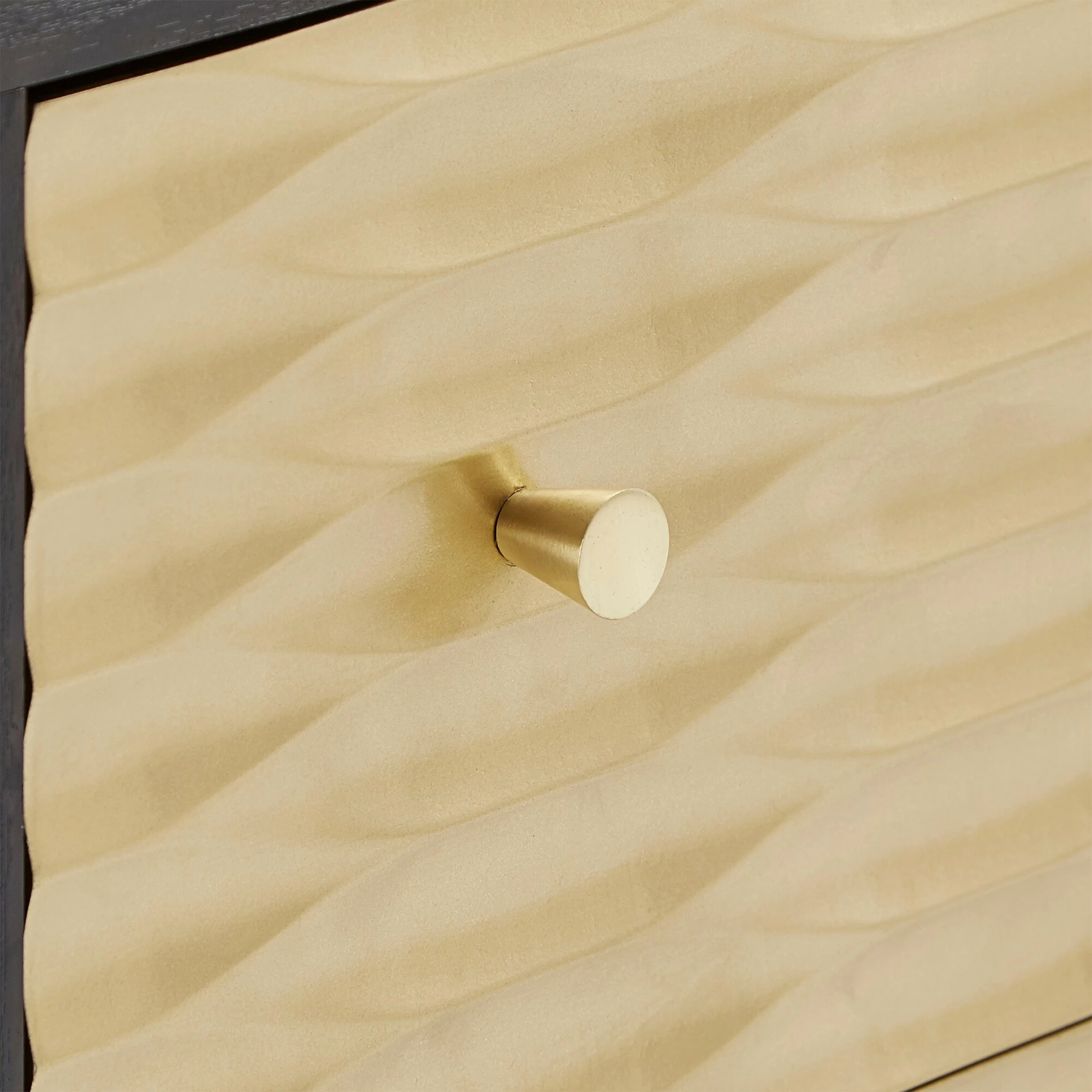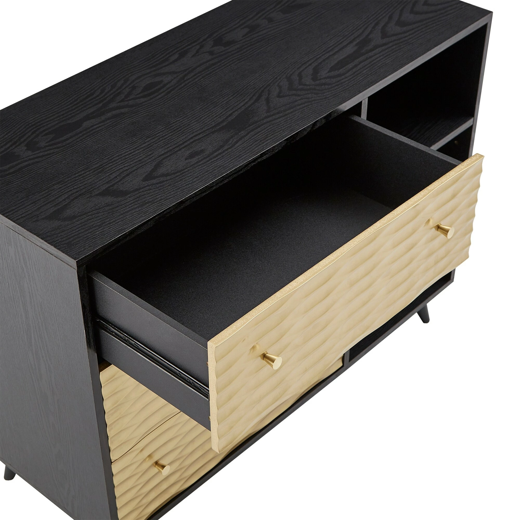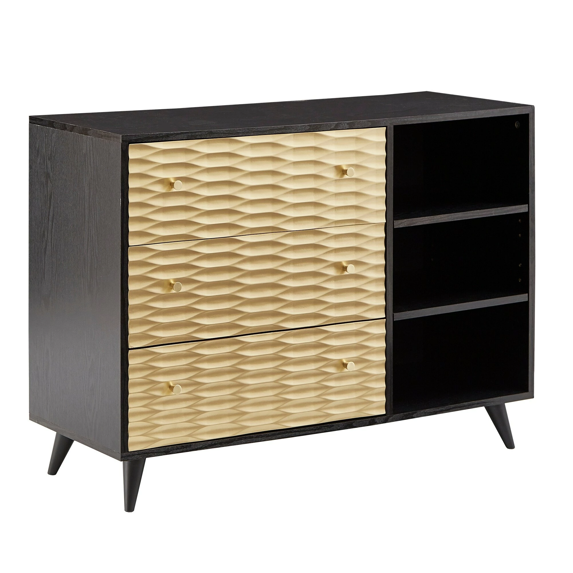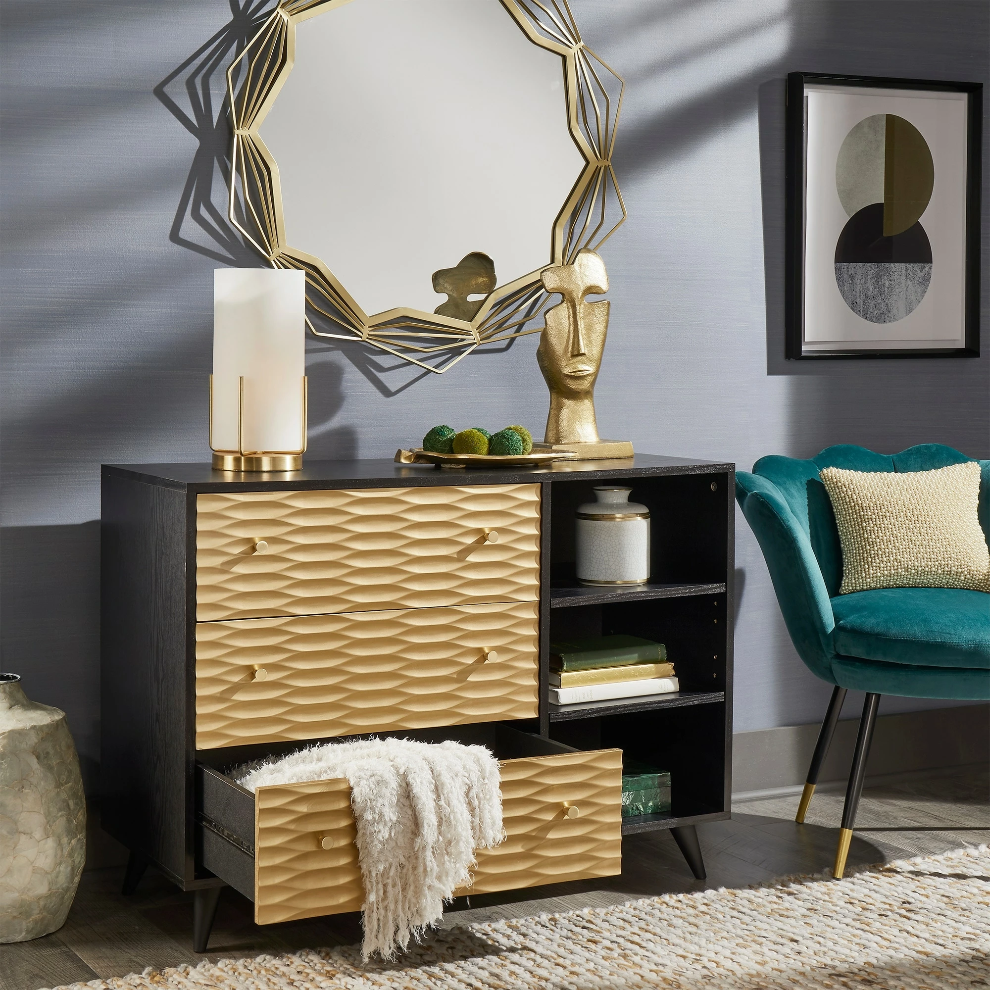 Add a touch of class to your space with the Icarus Two-Tone 3-Drawer Accent Chest by iNSPIRE Q Bold. Showcasing eye-catching style, this stunning piece features a two-tone finish, with a black frame and a gold drawer front. The drawers provide concealed storage, while three shelves offer a spot to display home décor. Founded on splayed feet, this chest looks great in any bedroom or living room.