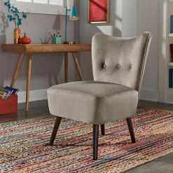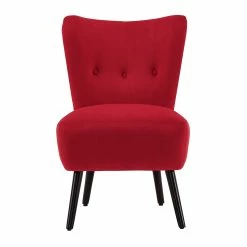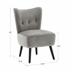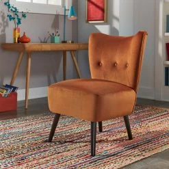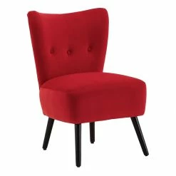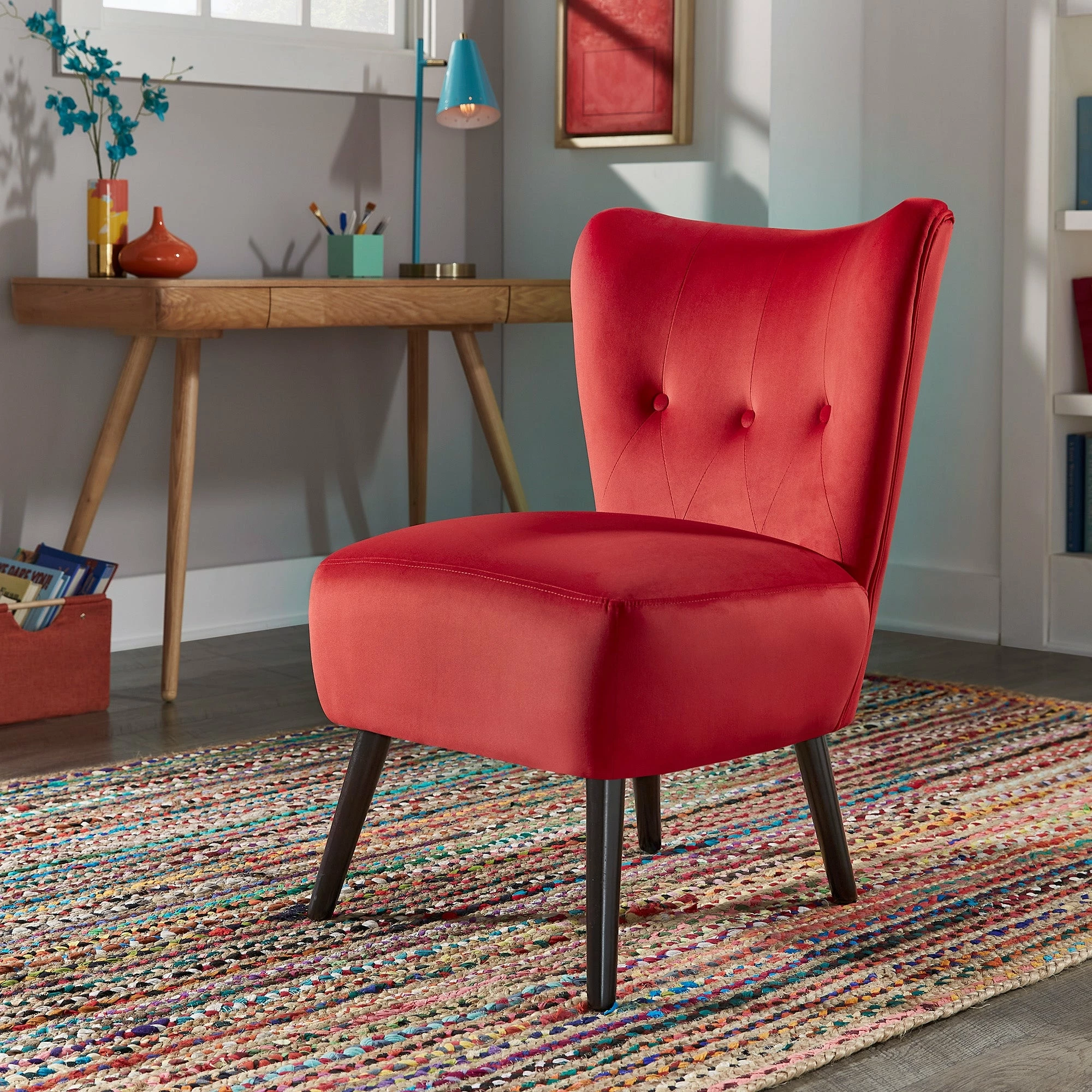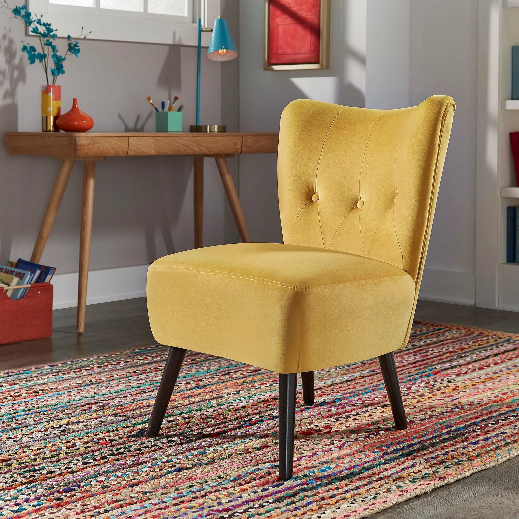 With this retro-inspired accent chair, you don’t have to give up style for comfort. The Imani 22.5″ Wide Tufted Velvet Accent Chair provides a funky and comfortable environment for you to relax in. A button-tufted camelback, the soft and bright color velvet cloth, and dark brown finished wood legs round this piece out with eye-catching mid-century-inspired touches. The high-density foam filling with a solid and plywood wood frame provides comfort and support. This accent chair is perfect for smaller rooms or bedrooms.