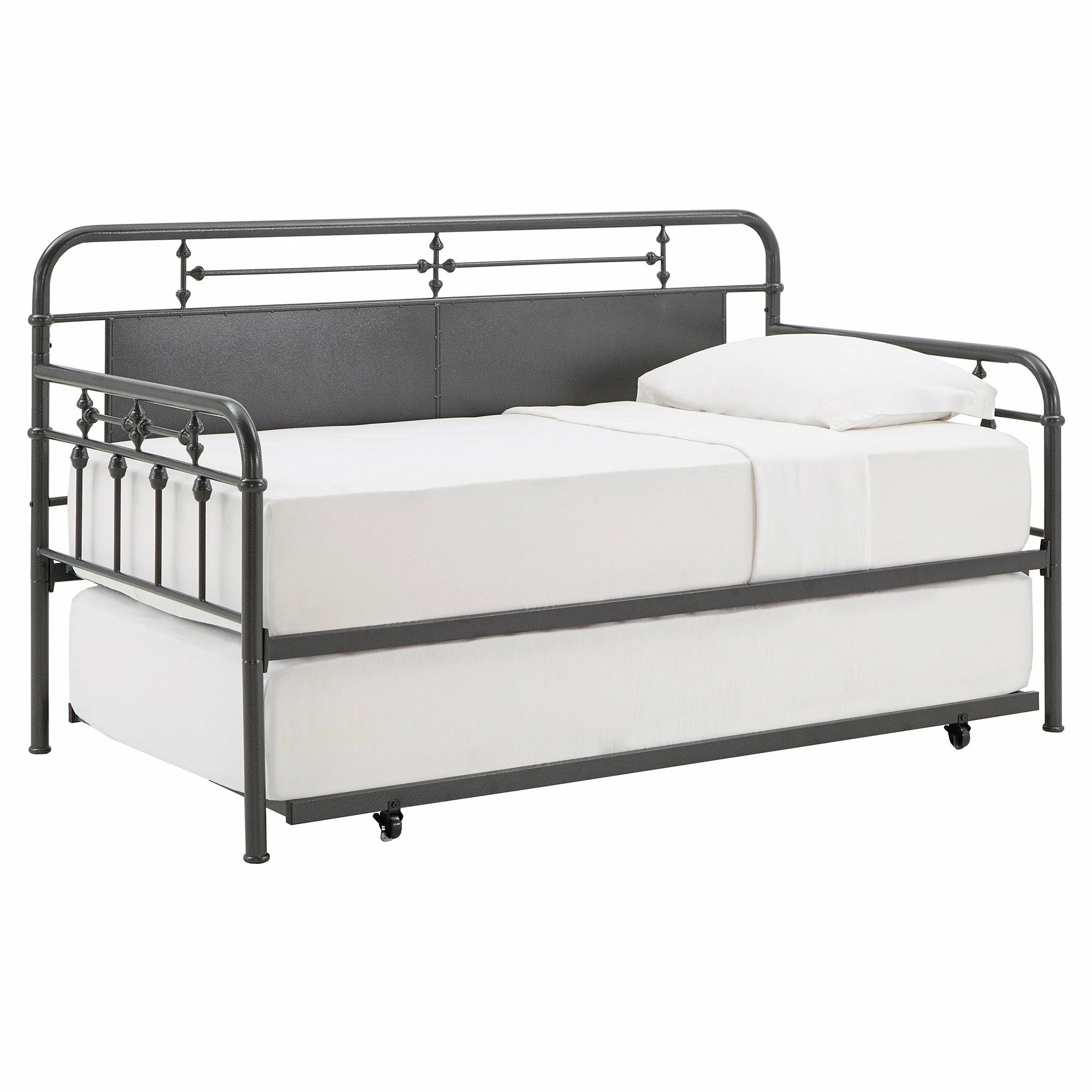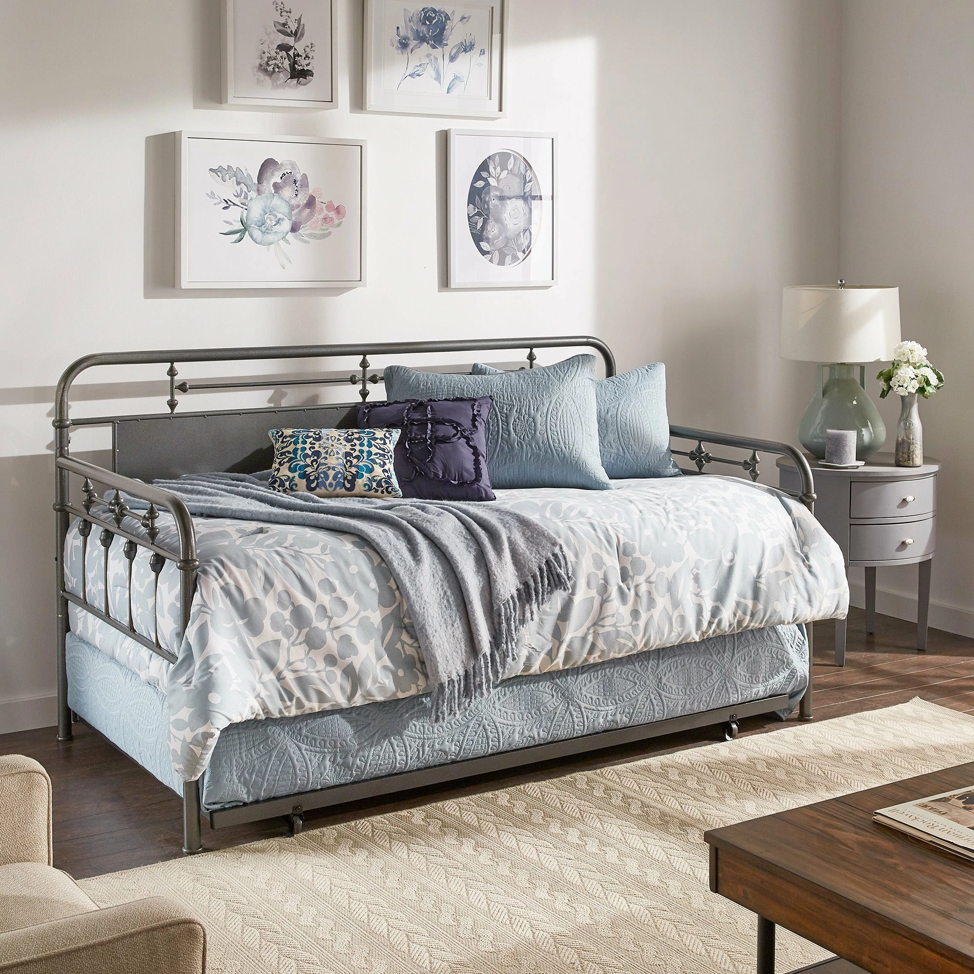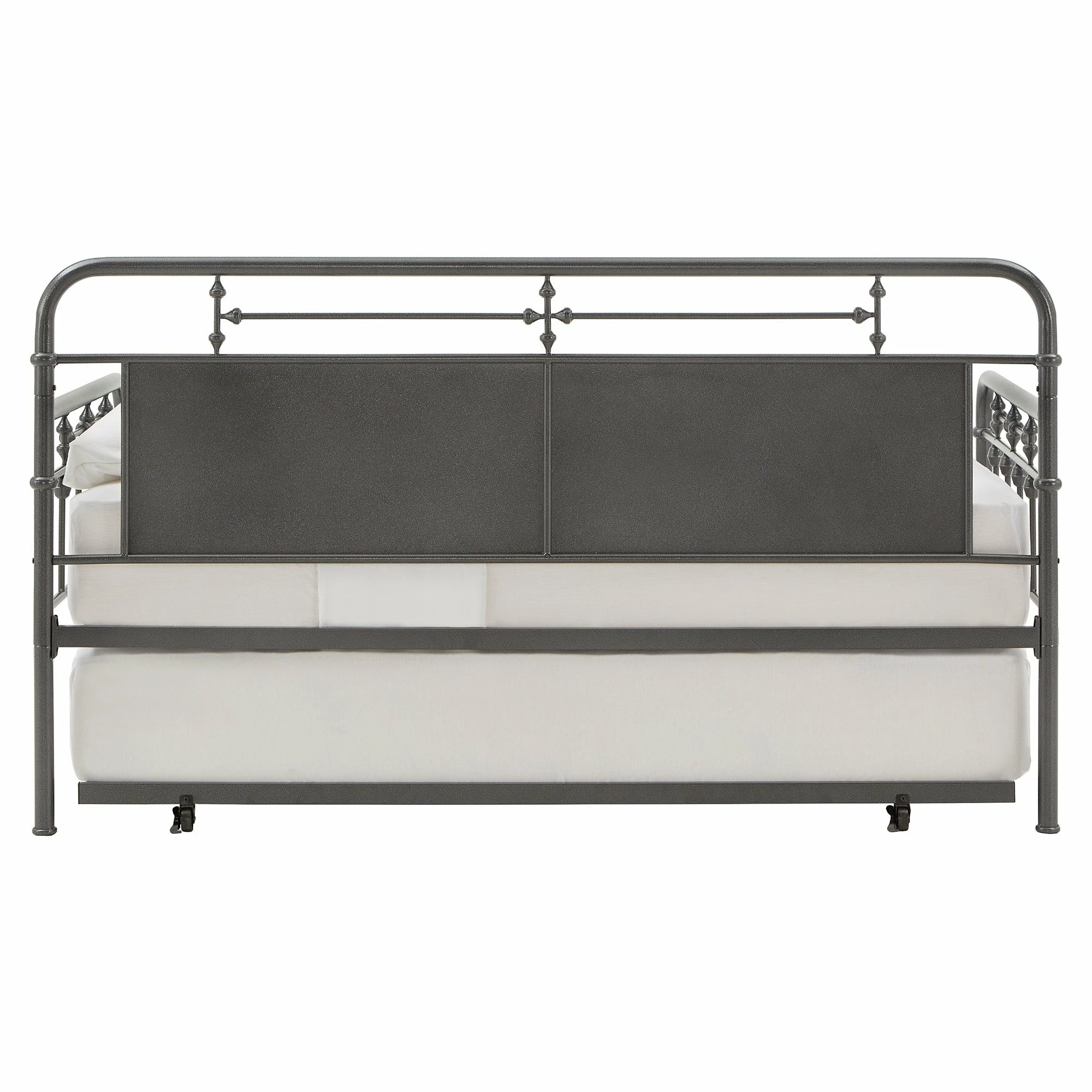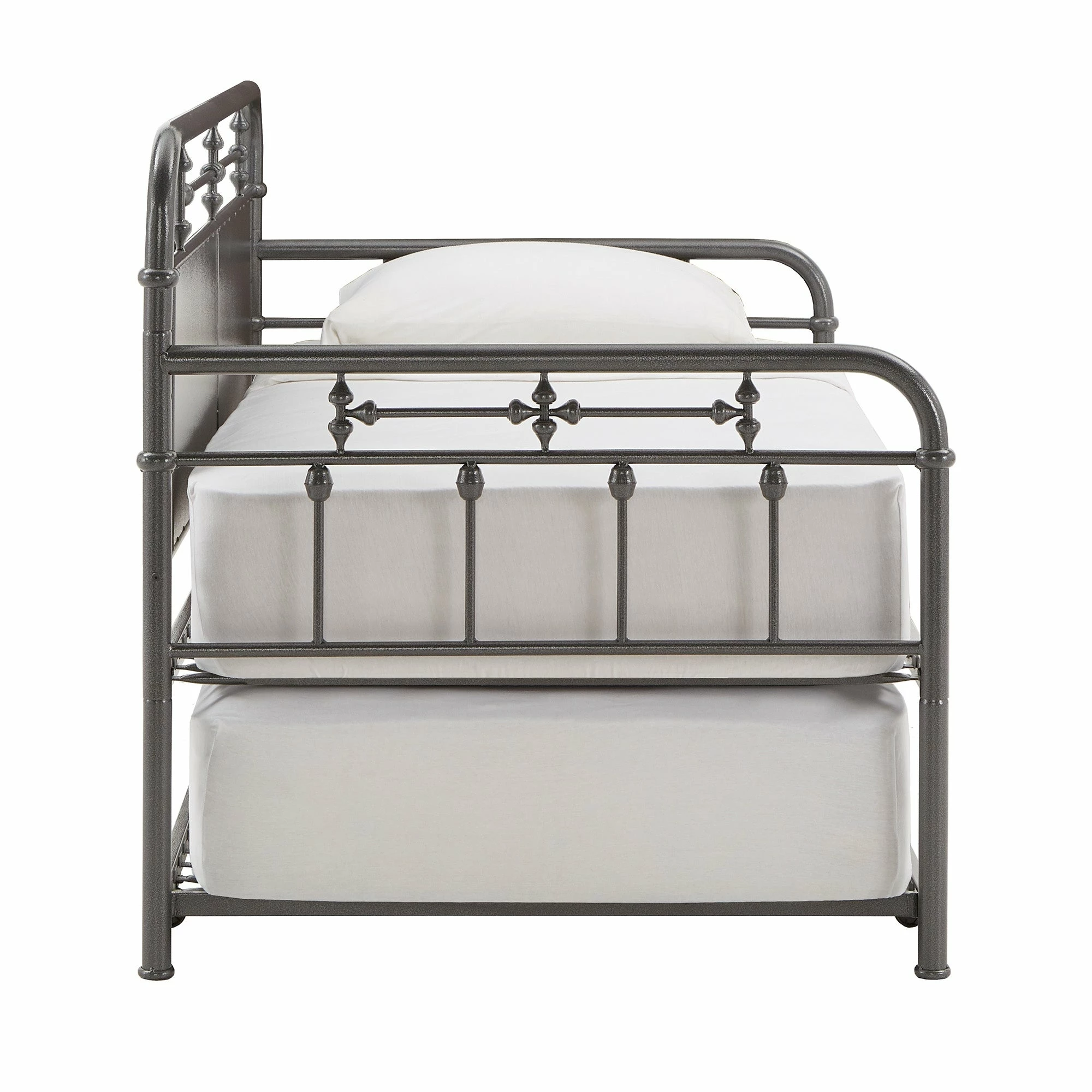 Add some traditional styling to any room of your home with the Imogen Metal Spindle Daybed with Trundle by iNSPIRE Q Classic. Perfect for a multitude of aesthetics, this beautiful daybed features a mottled silver finish and spindle accent joints. A pull-out trundle on caster wheels provides additional sleeping space, so you will always have plenty of room for all your guests.