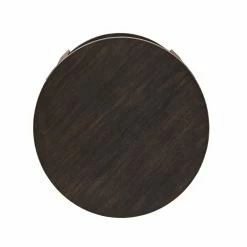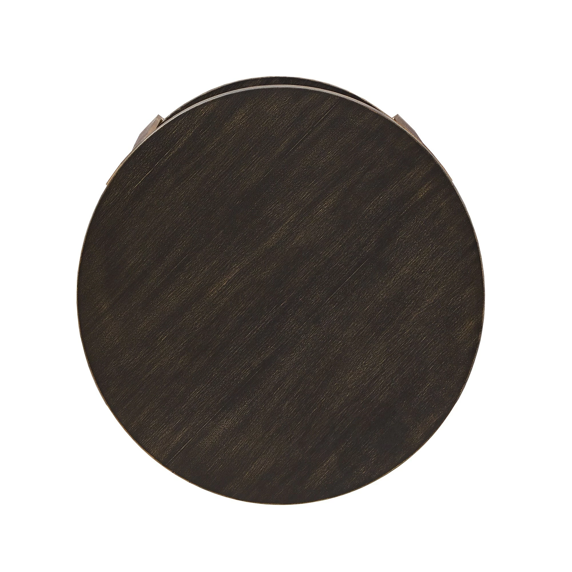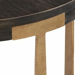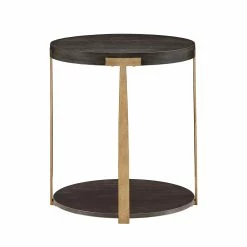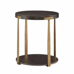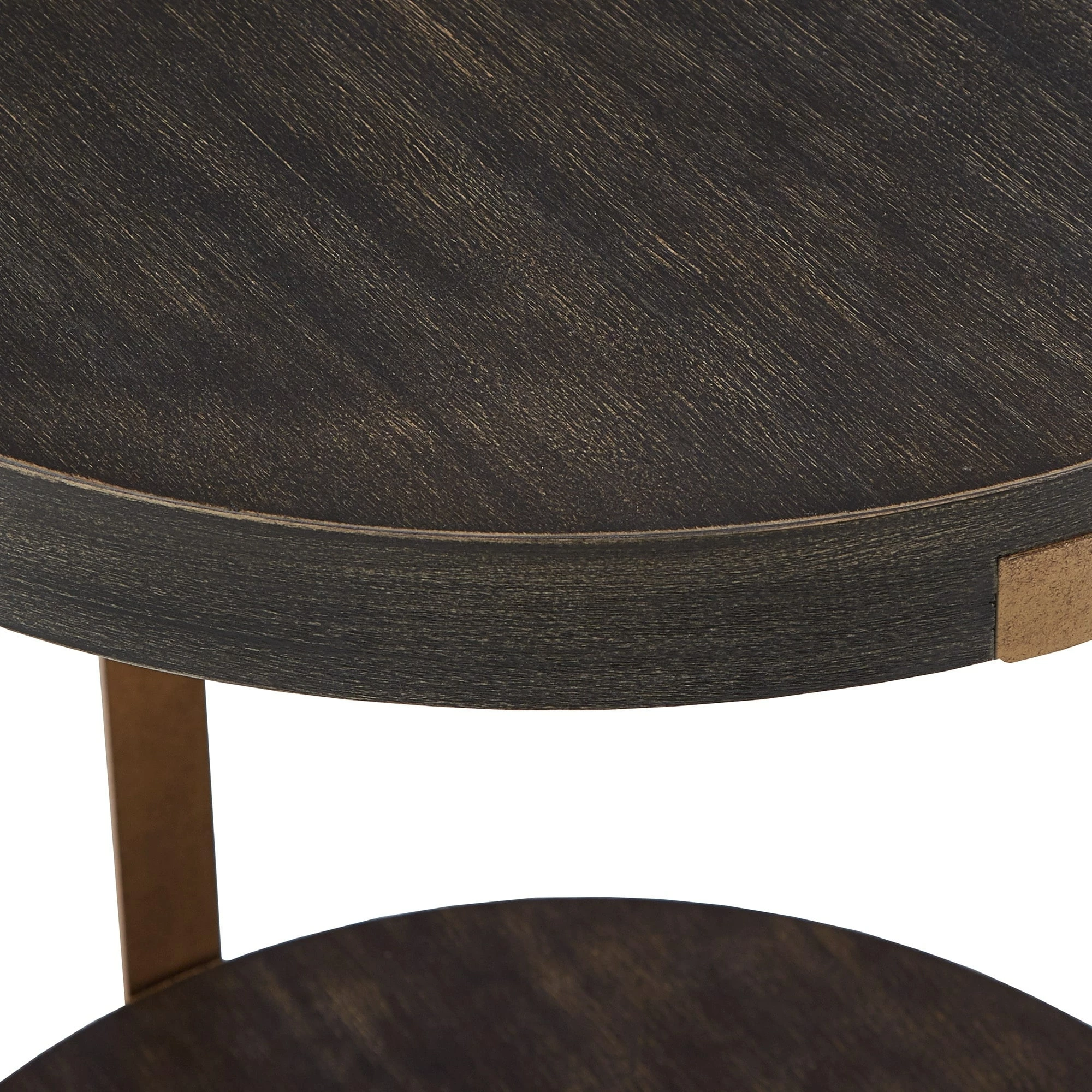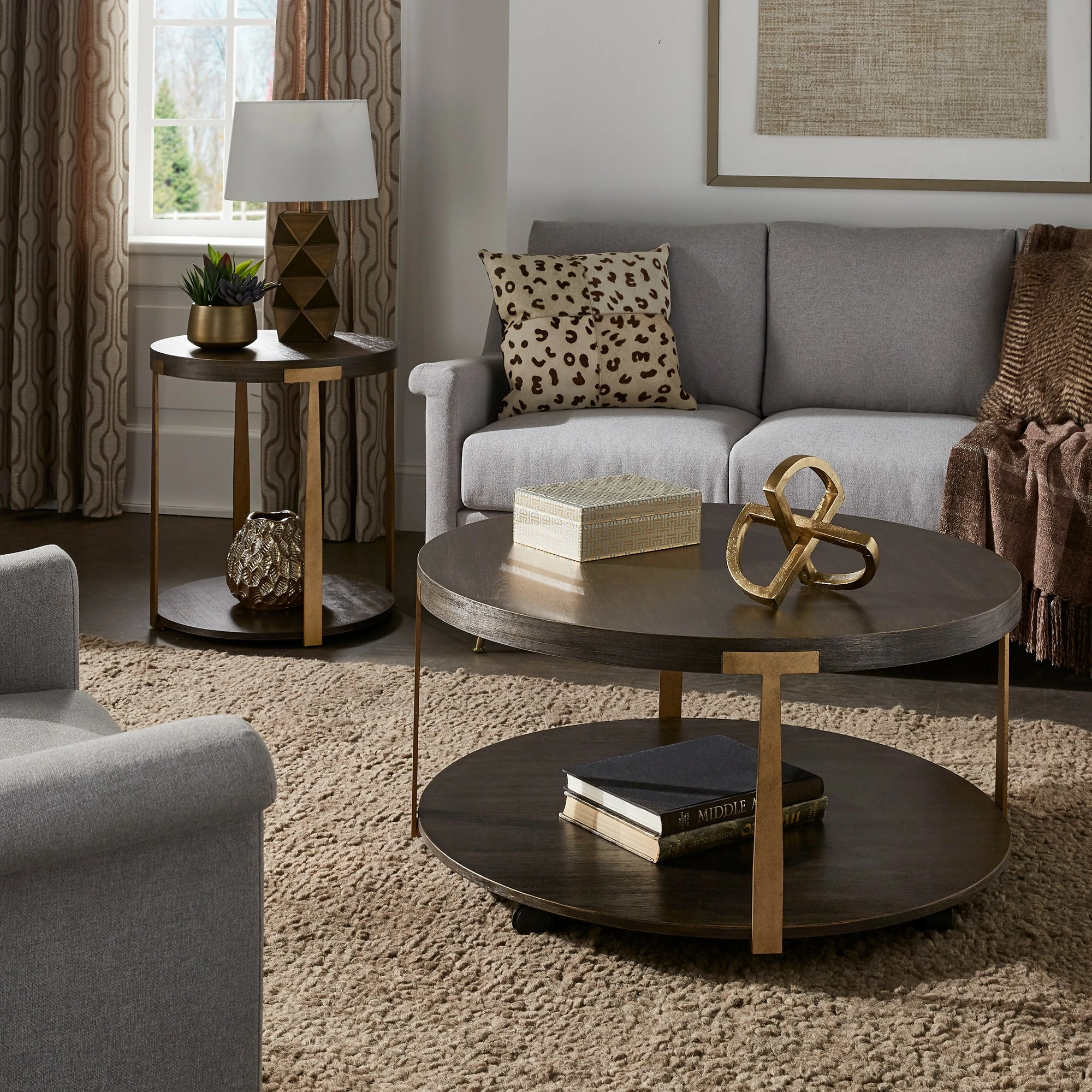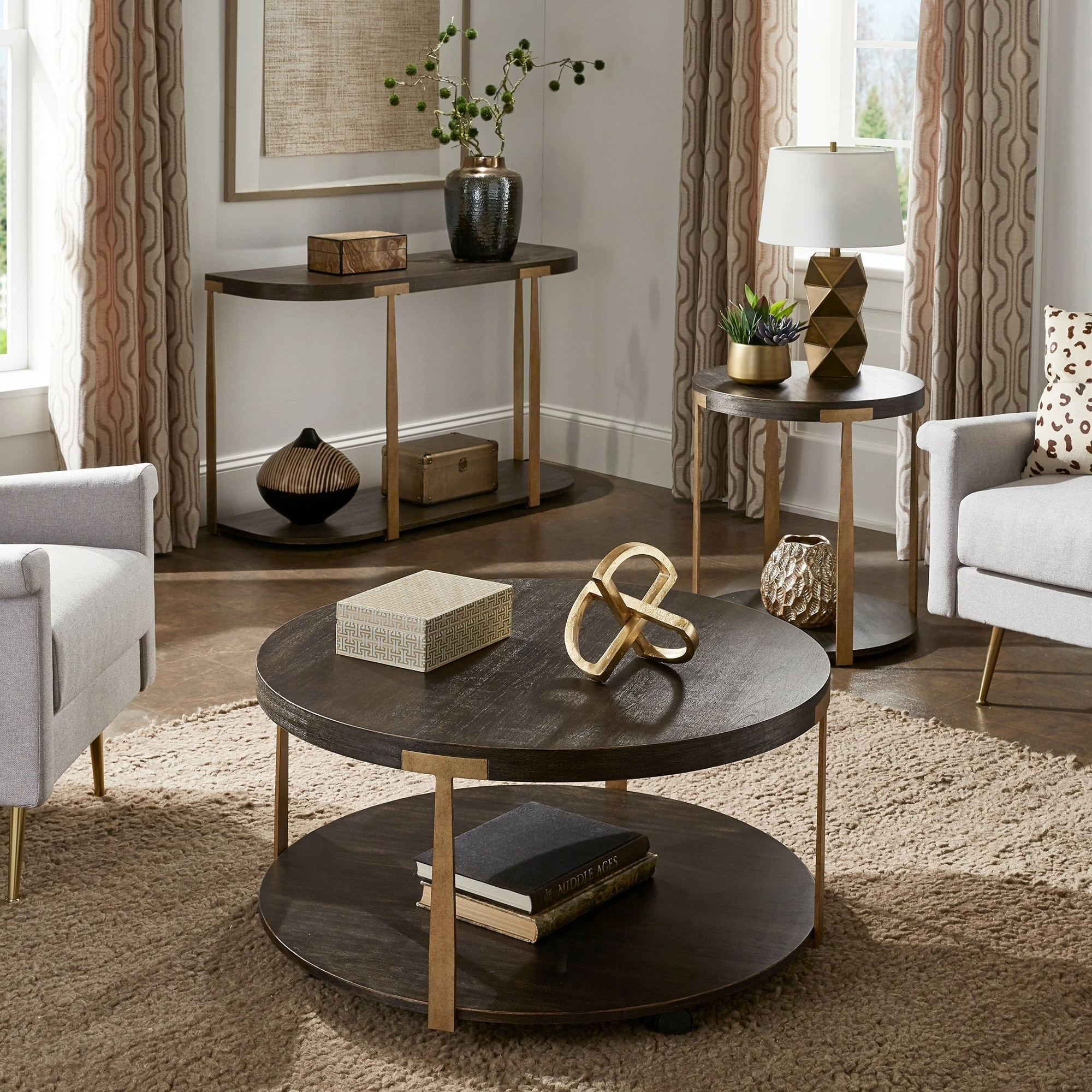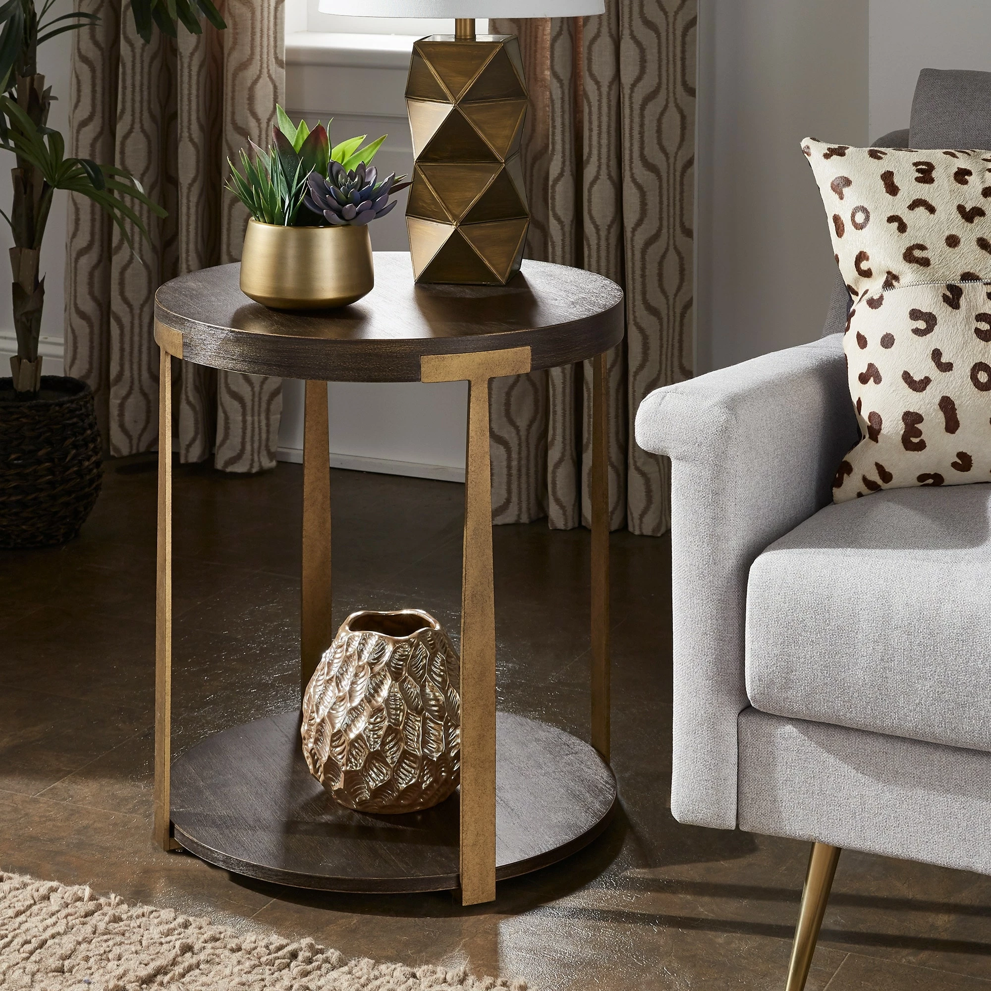 Lend some modern sophistication to your living space with the Jensen Wood and Metal T-Brace Tables by iNSPIRE Q Artisan. A traditional design with a contemporary update, this table features an espresso wood finish and antique brass finished T-brace frame. Set down drinks, remotes, and other everyday items on the round table top, while the lower shelf puts your home décor on full display.