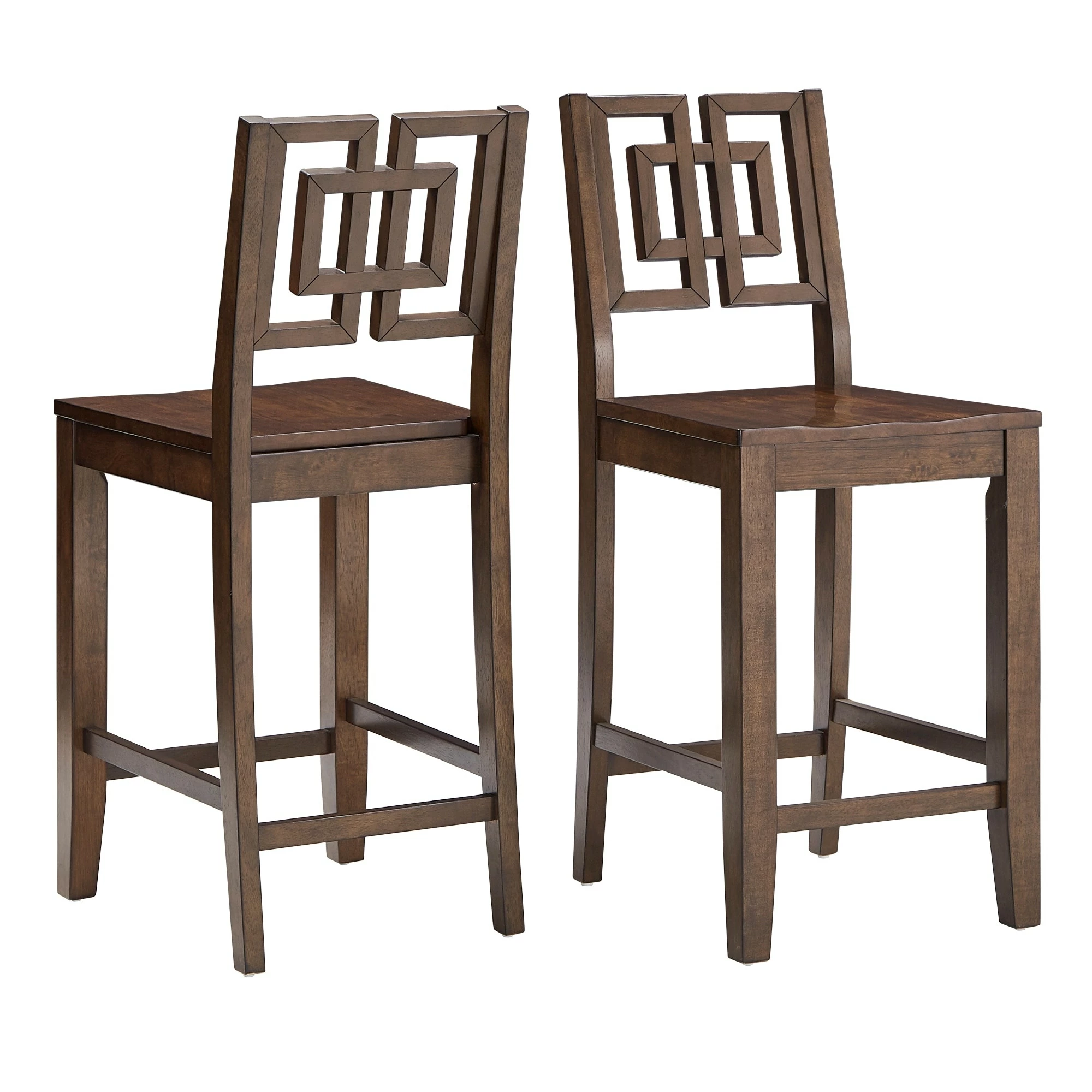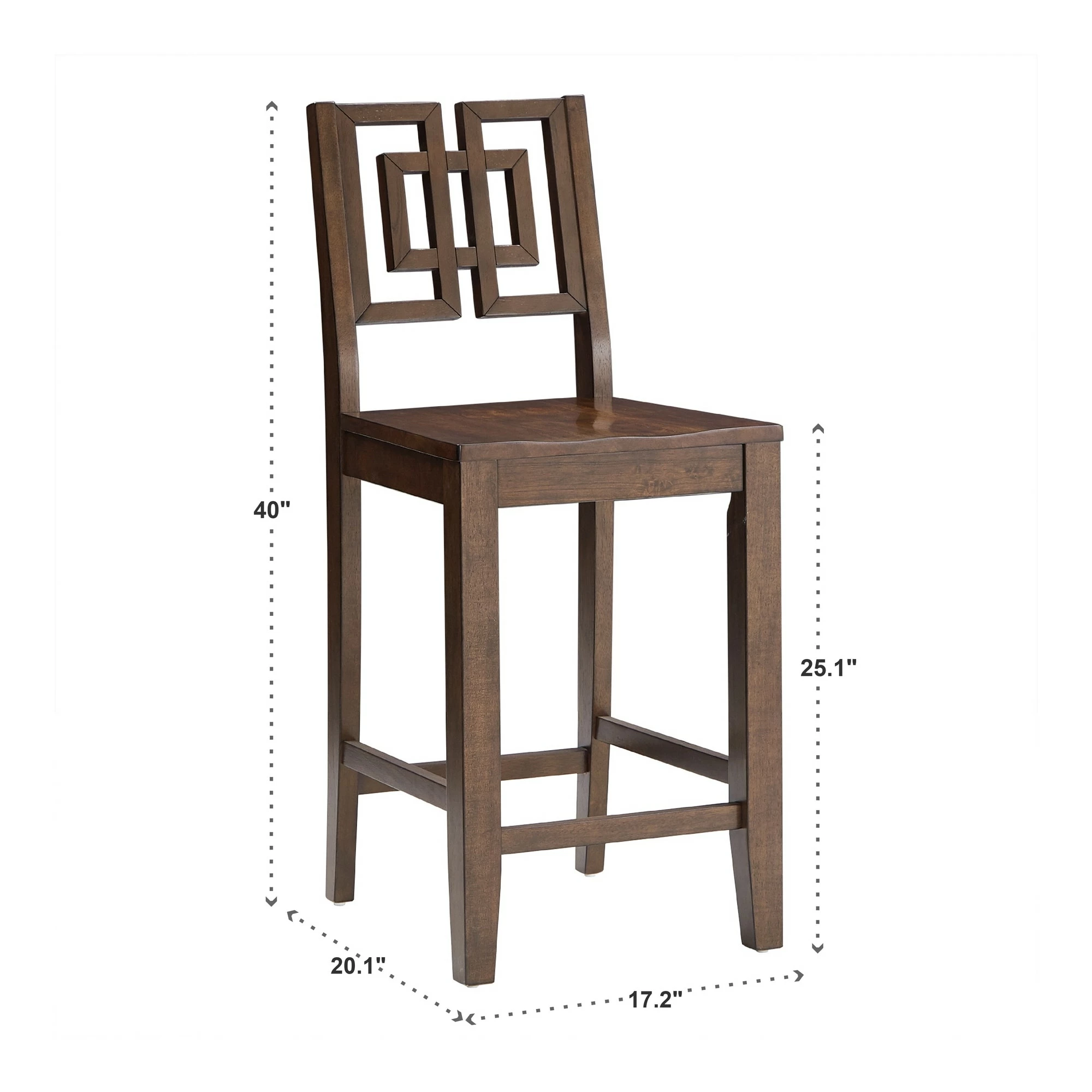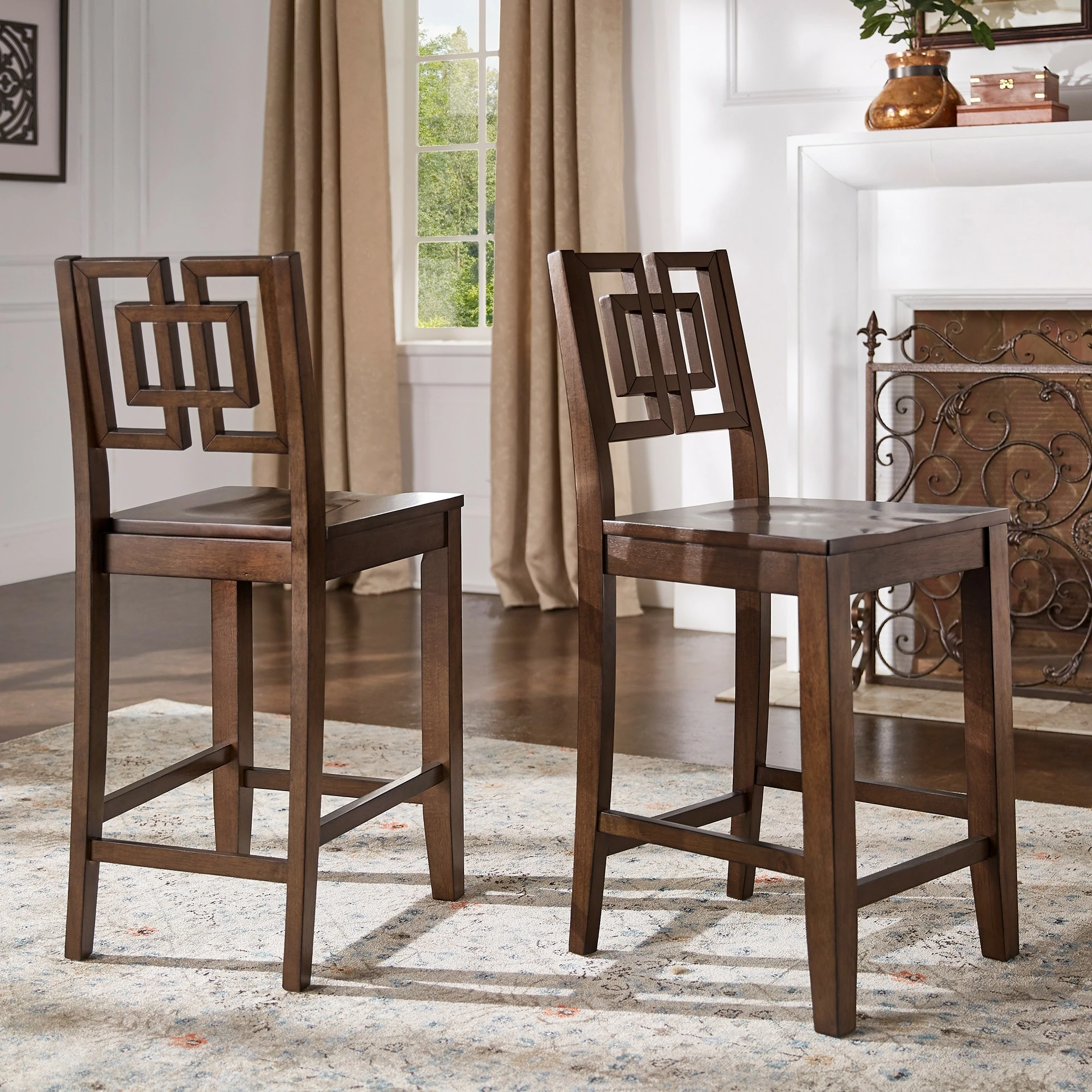 Showcase timeless style in your kitchen with the Kai Ornate Back Counter Height Chairs (Set of 2) by iNSPIRE Q Classic. Coming in a dark oak finish, these beautiful chairs feature a visible wood grain and an ornate-styled chair back perfect for any modern farmhouse. The sturdy wooden construction promises lasting strength while the contoured seat and built-in footrests ensures comfort as you dine.