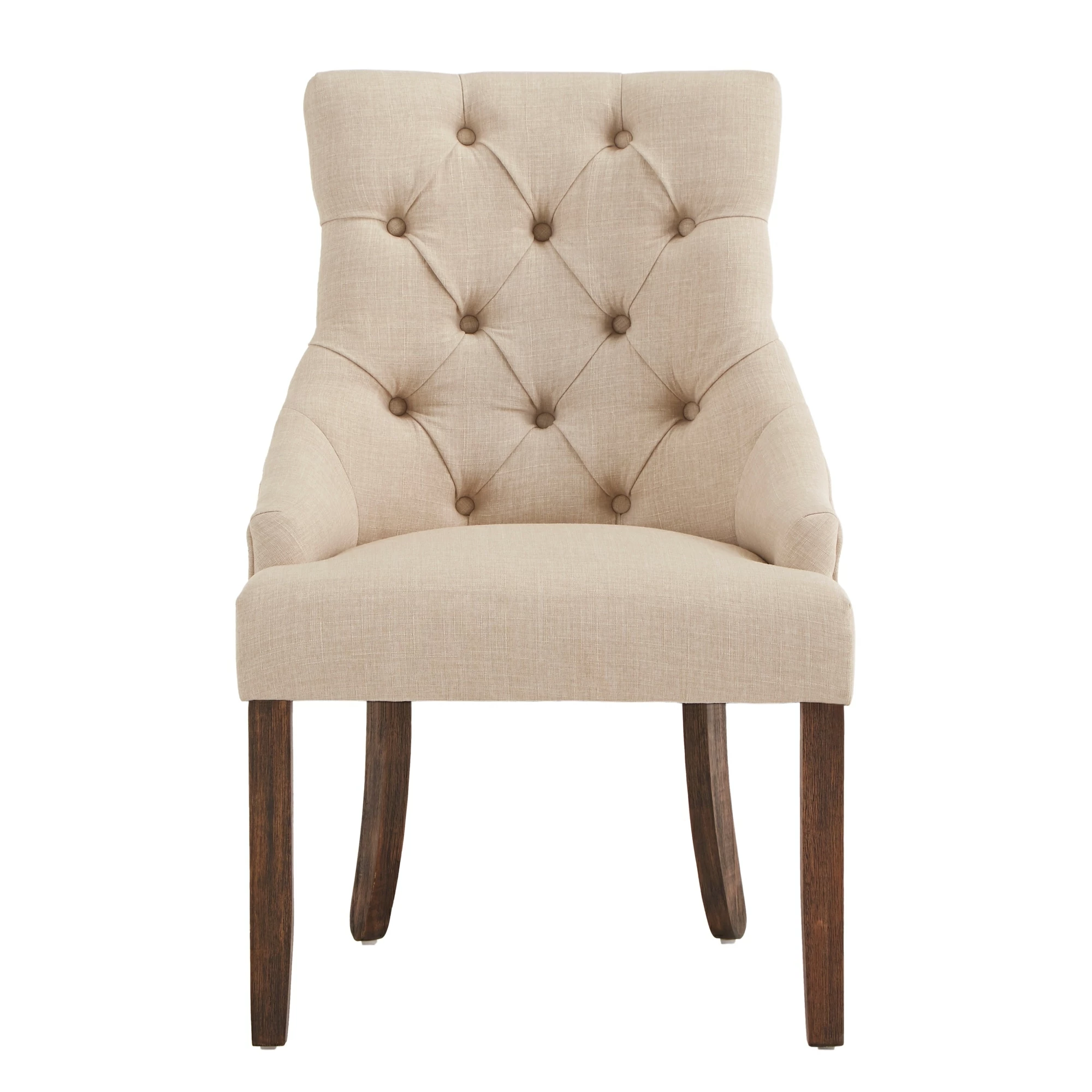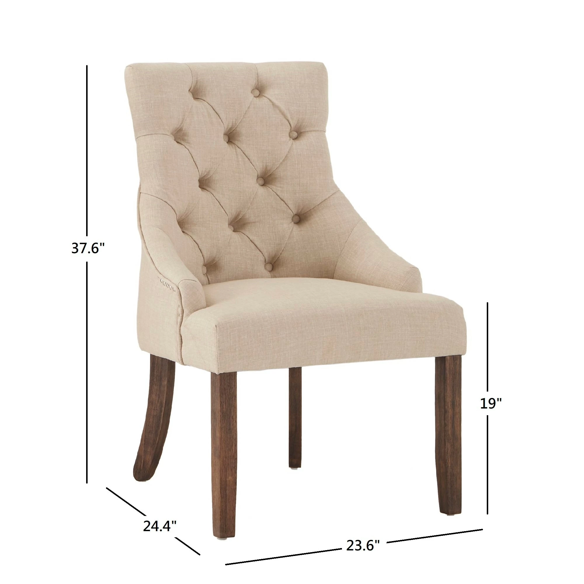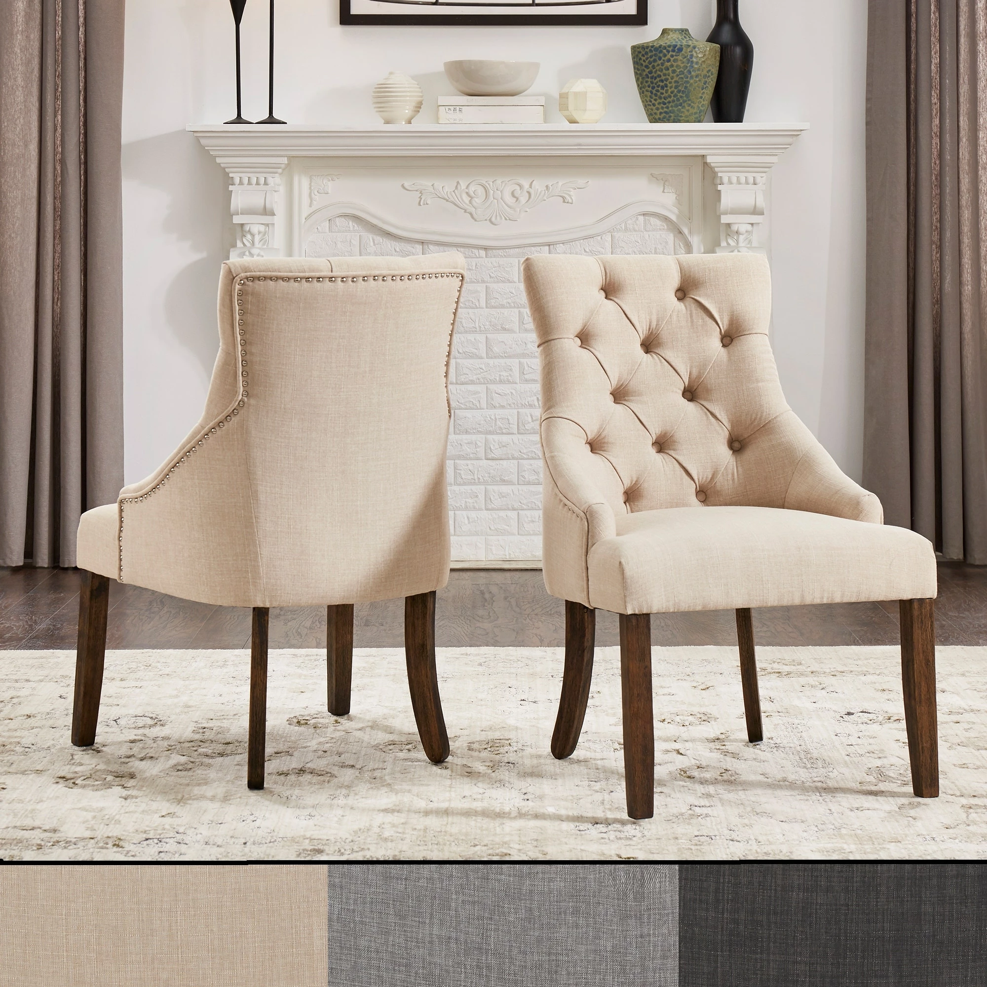 Sit in regal comfort with the traditional Kimpton Linen Curved Back Tufted Dining Chair by iNSPIRE Q® Artisan. This accent chair features lightly distressed chair legs for a rustic touch, and sloped arms and a slight curved wing-back for elegance. This chair fits perfectly with styles from traditional and transitional to rustic and modern farmhouse. Choose between beige, grey, and dark grey linen upholstery options to compliment your decor.