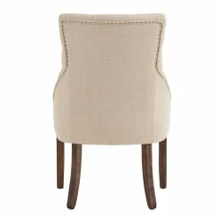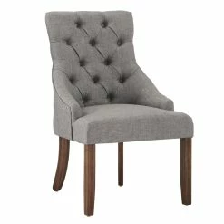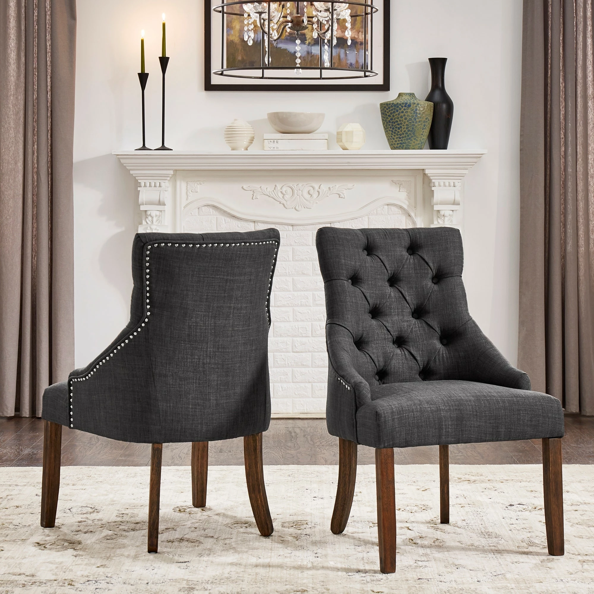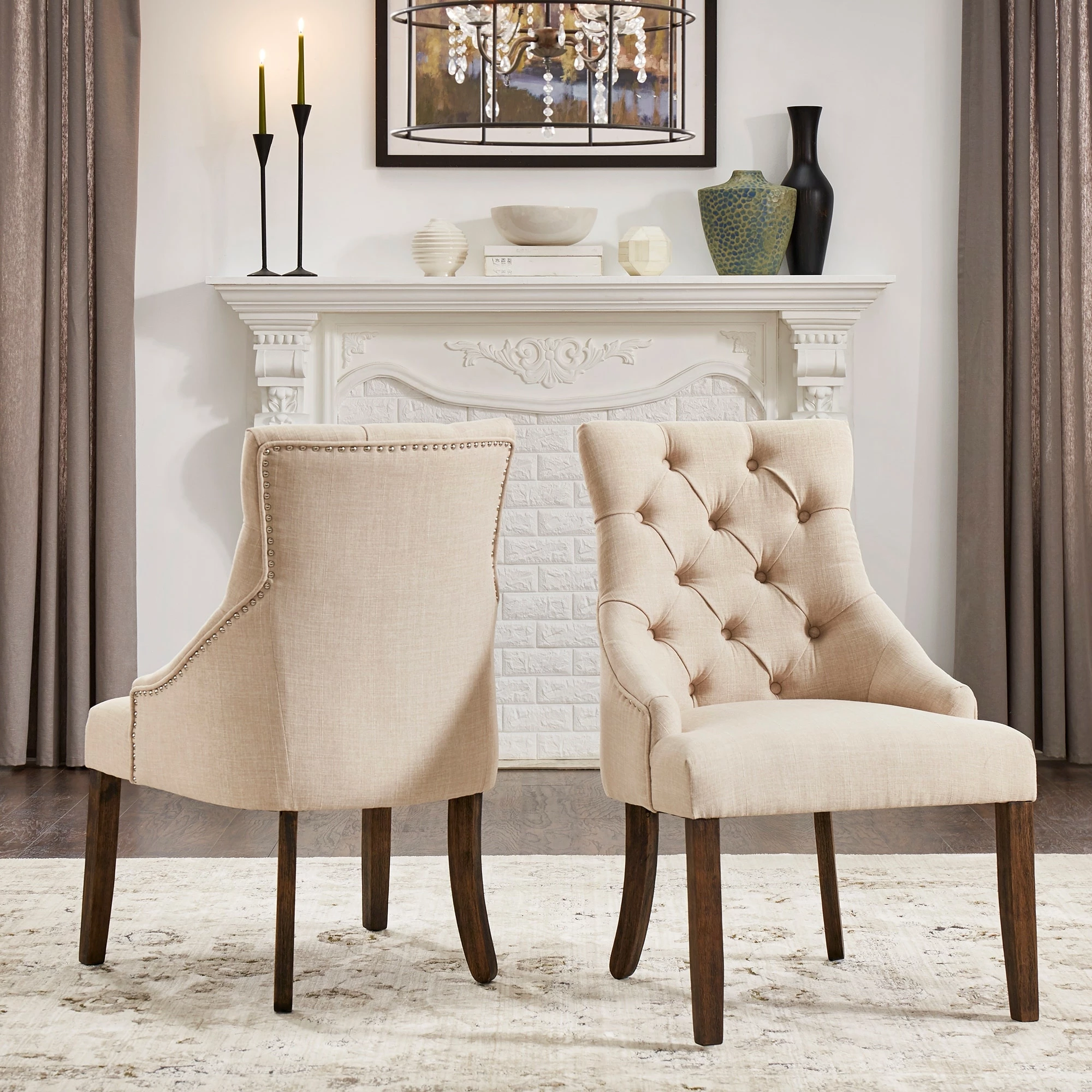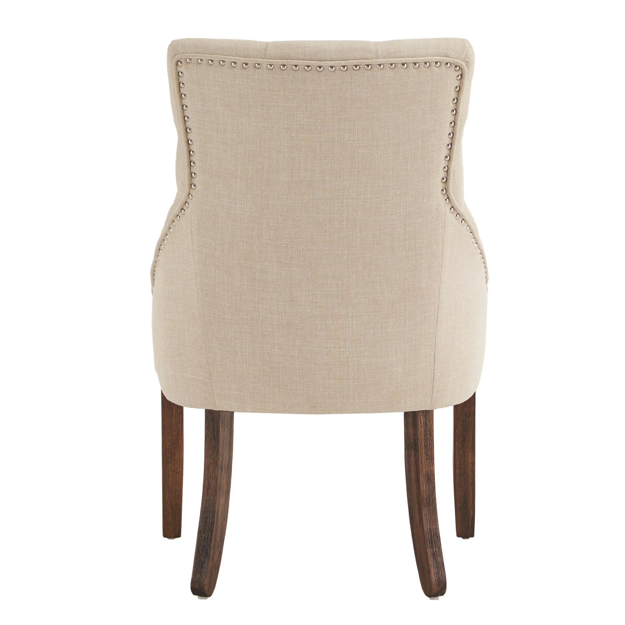 Sit in regal comfort with the traditional Kimpton Linen Curved Back Tufted Dining Chair by iNSPIRE Q® Artisan. This accent chair features lightly distressed chair legs for a rustic touch, and sloped arms and a slight curved wing-back for elegance. This chair fits perfectly with styles from traditional and transitional to rustic and modern farmhouse. Choose between beige, grey, and dark grey linen upholstery options to compliment your decor.