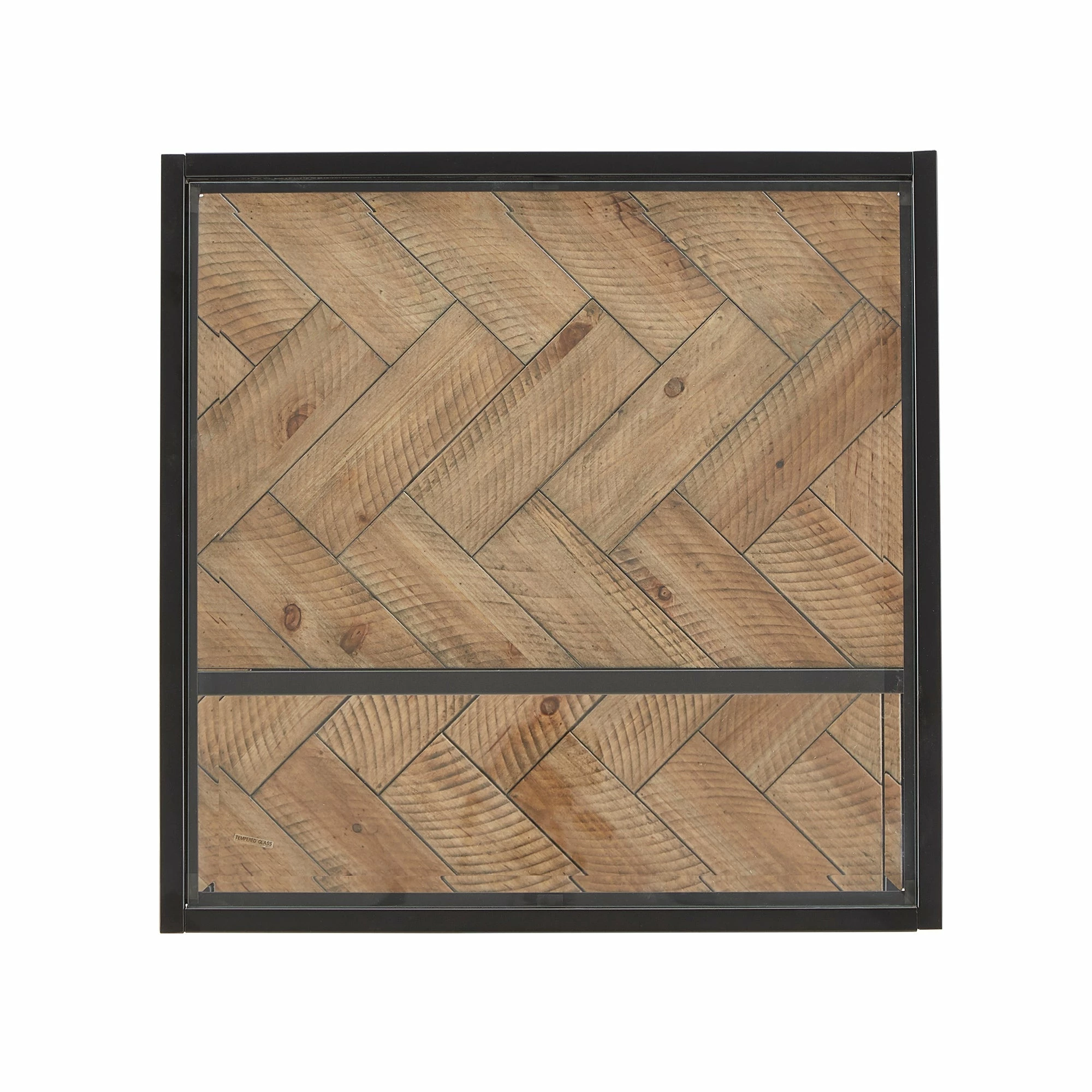 - Constructed with tempered glass, metal, fir flake parquet, and MDF