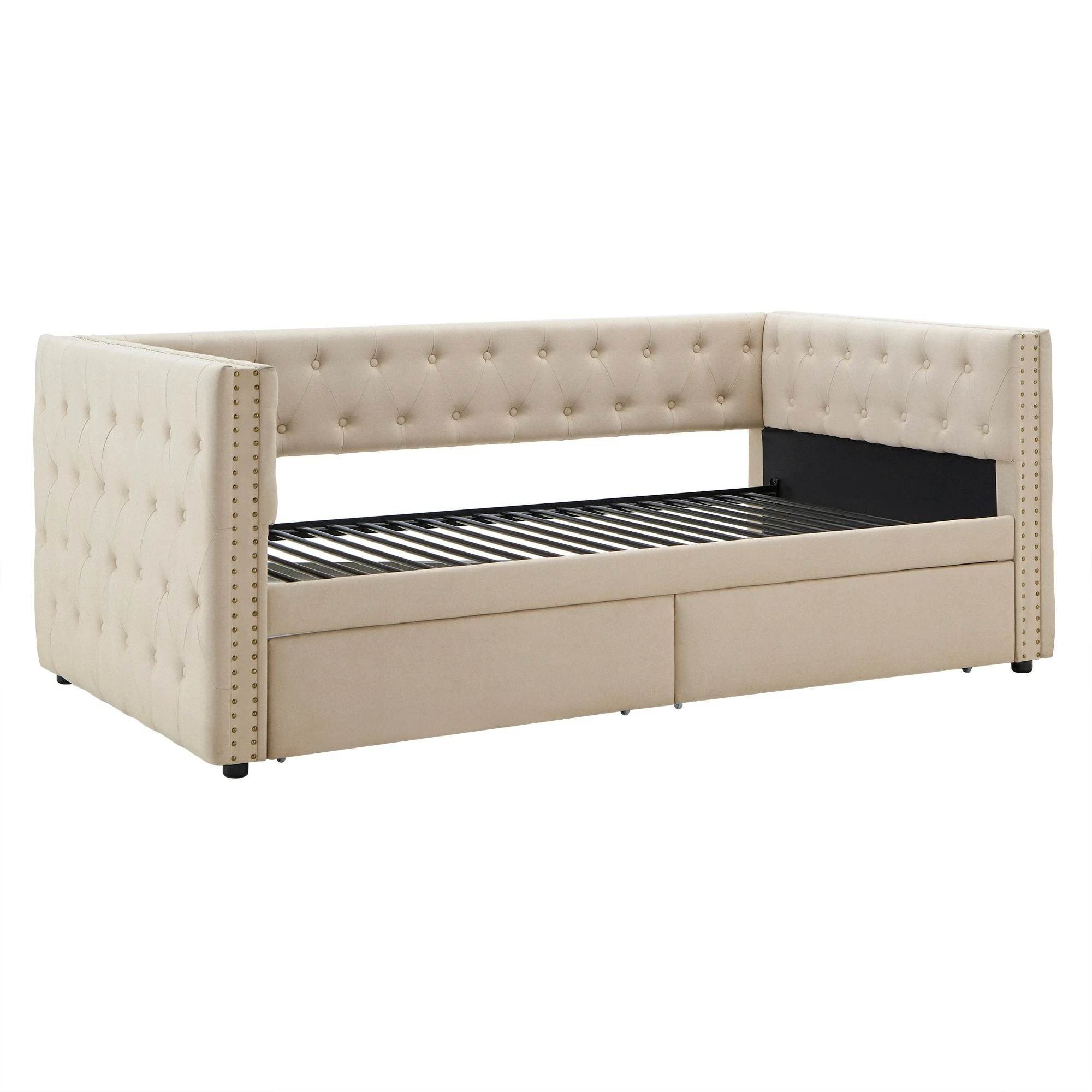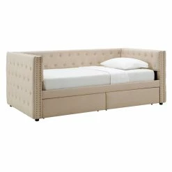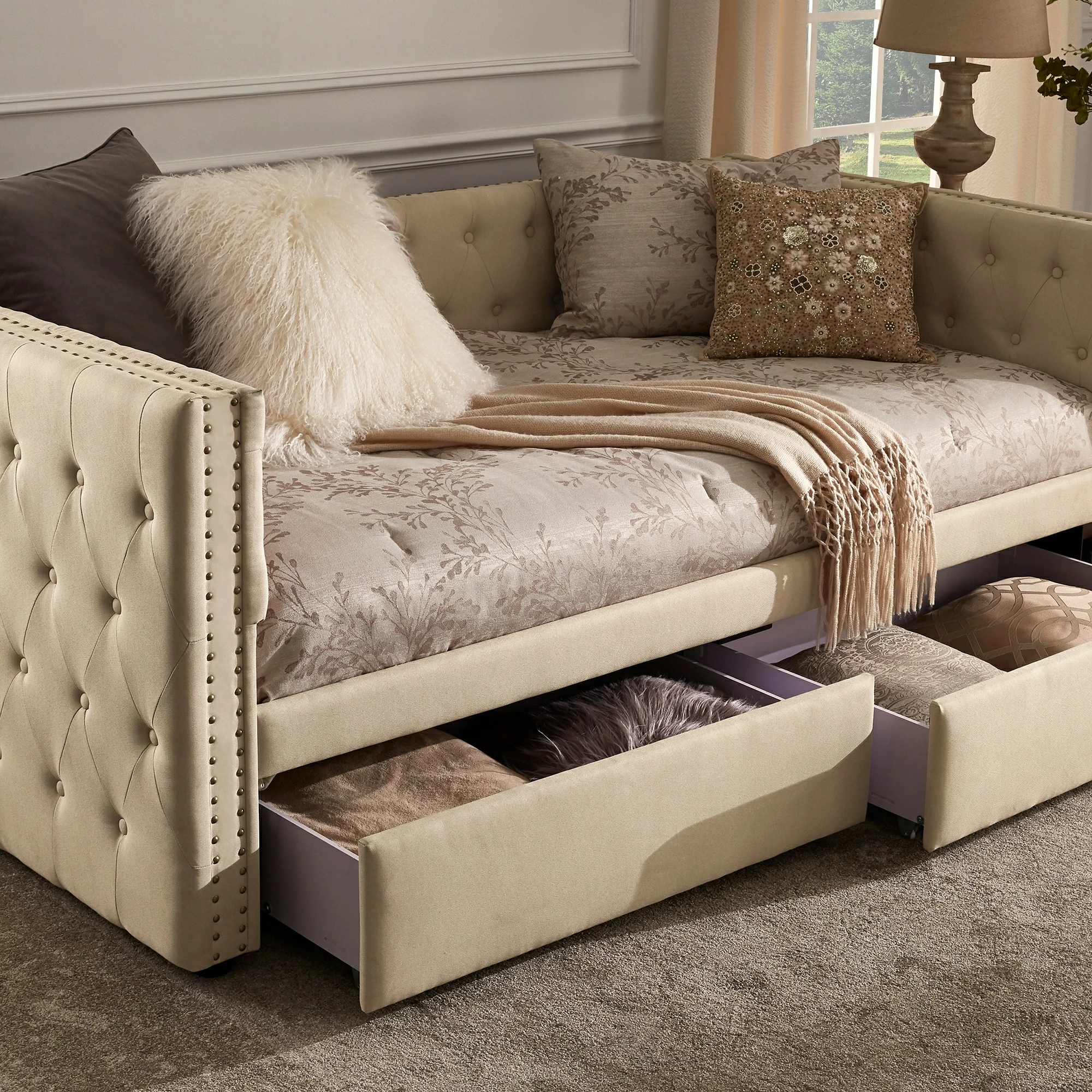 This versatile fashionable daybed gives you the extra space you need for your guests while providing an elegant and durable seating option for day-to-day use. Its neutral color complements any decor, and the nail-head detailing and quality construction ensure that this tufted daybed will stay fashionable and functional for years to come. Two large drawers provide an amazing amount of storage space. They are placed on the ground and have wheels, so they don’t pressure the frame if they get heavy.