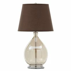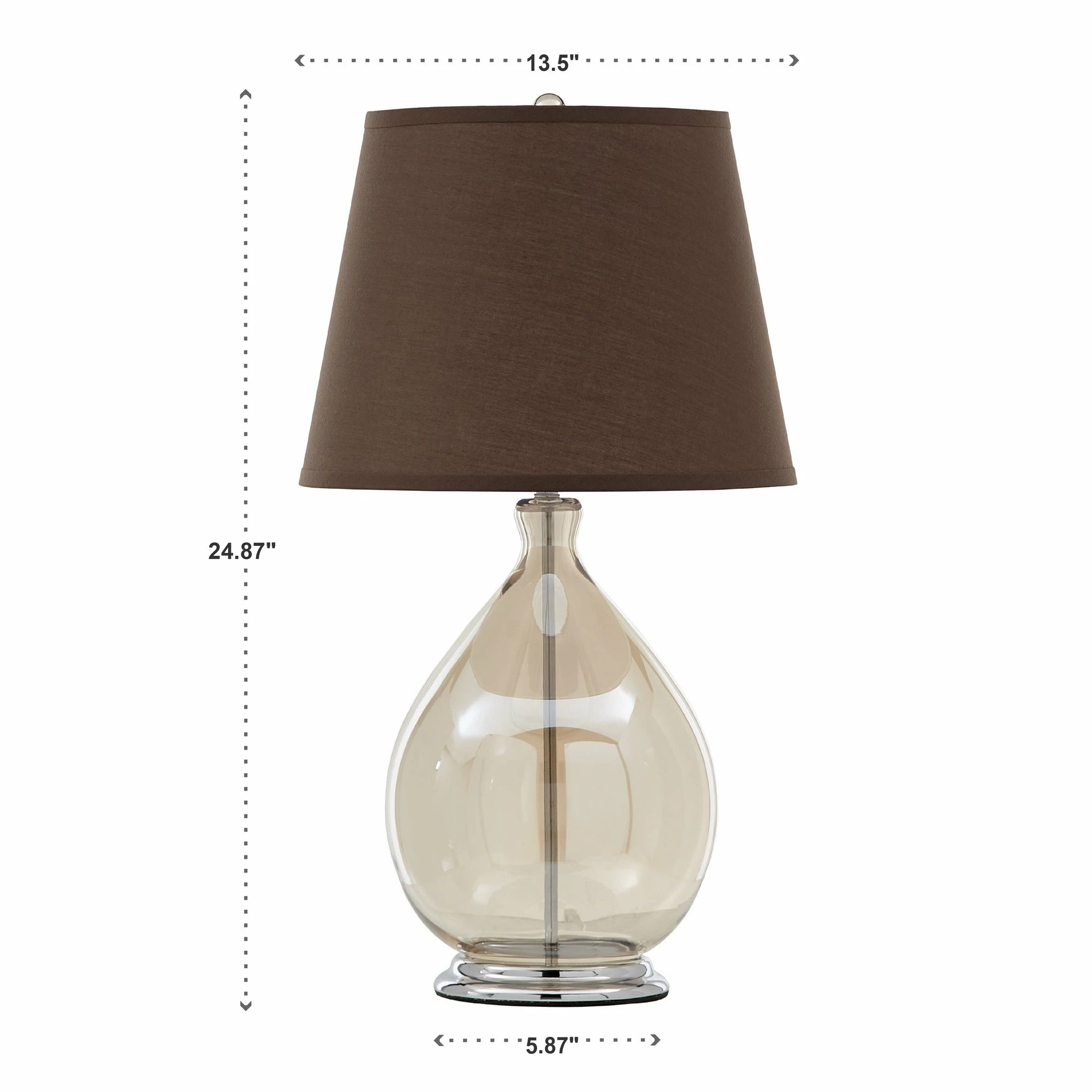 This Glass Table Lamp is a perfect addition to your space. With its plated nickel base and chic glass body, this lamp is sure to add a touch of luxury to any room. The tinted glass paired with an amber brown shade makes this lamp a must-have for any modern home. Whether used as a light source for your reading needs or as a beautiful accent, this lamp is sure to make a statement.