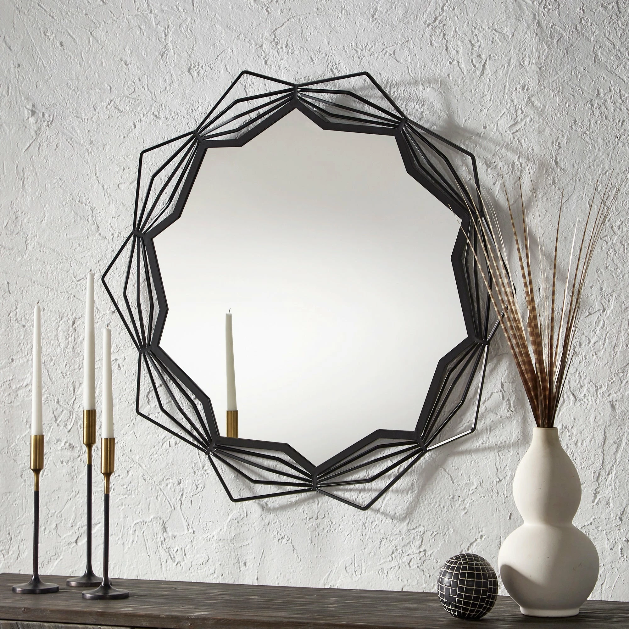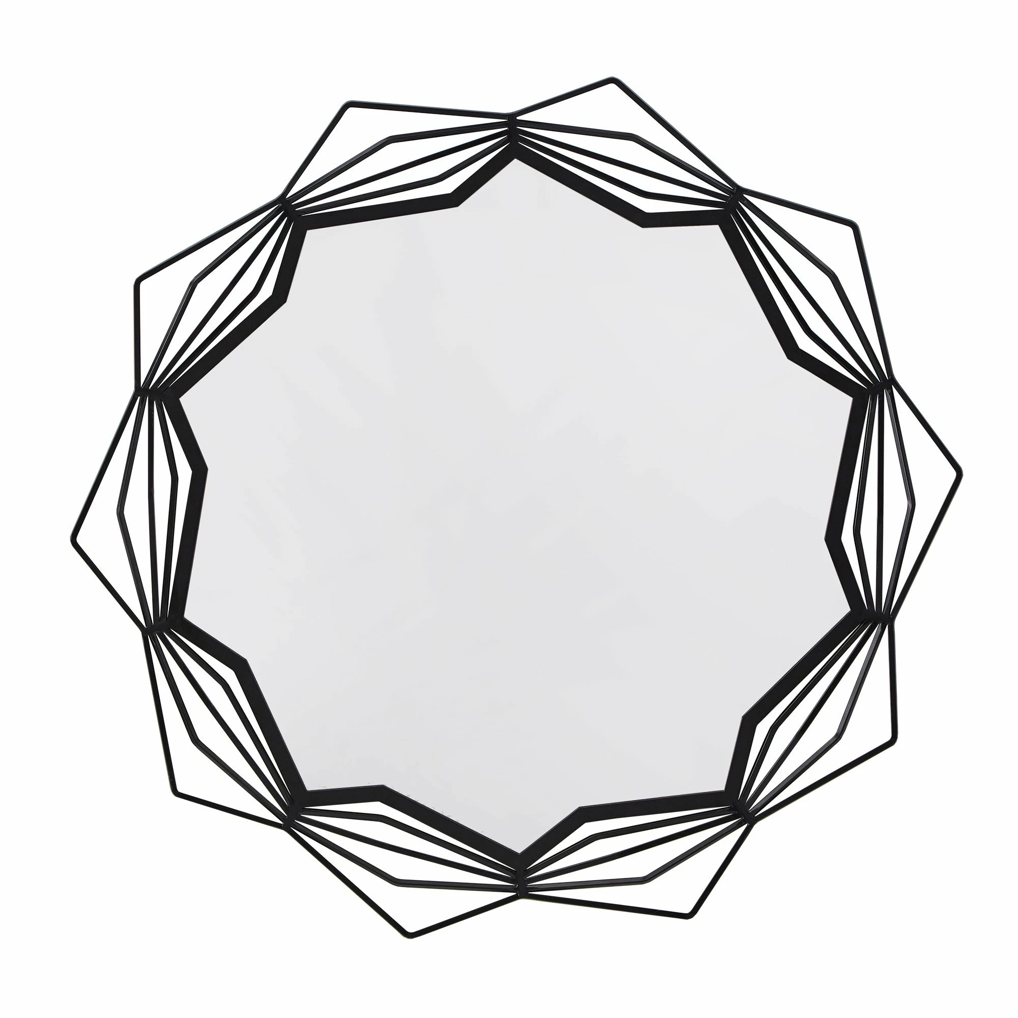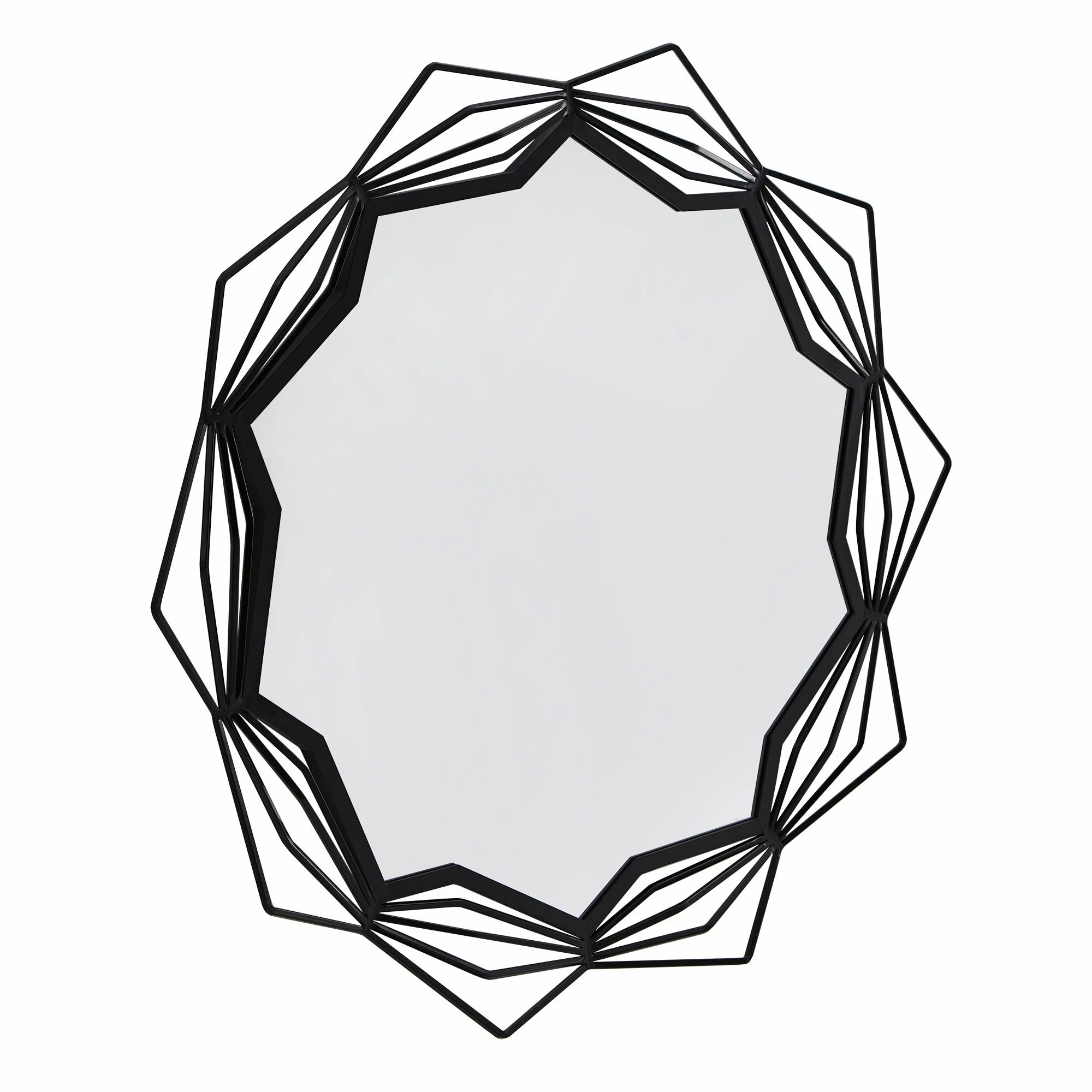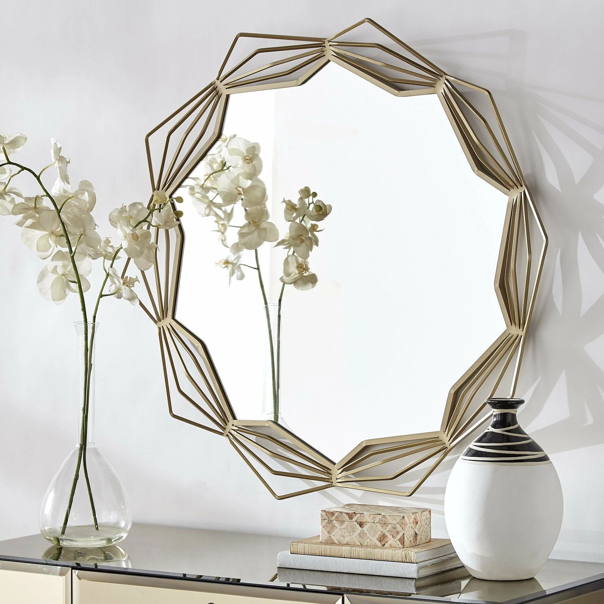 Beyond ordinary, this Lodo Wall Mirror with Star Geometric Metal Frame by iNSPIRE Q Modern, adds major style points to any room in your home. The unique geometrically shaped frame creates a star shaped boarder, while the gold finish metal material adds sharp detail to this dainty styled piece.