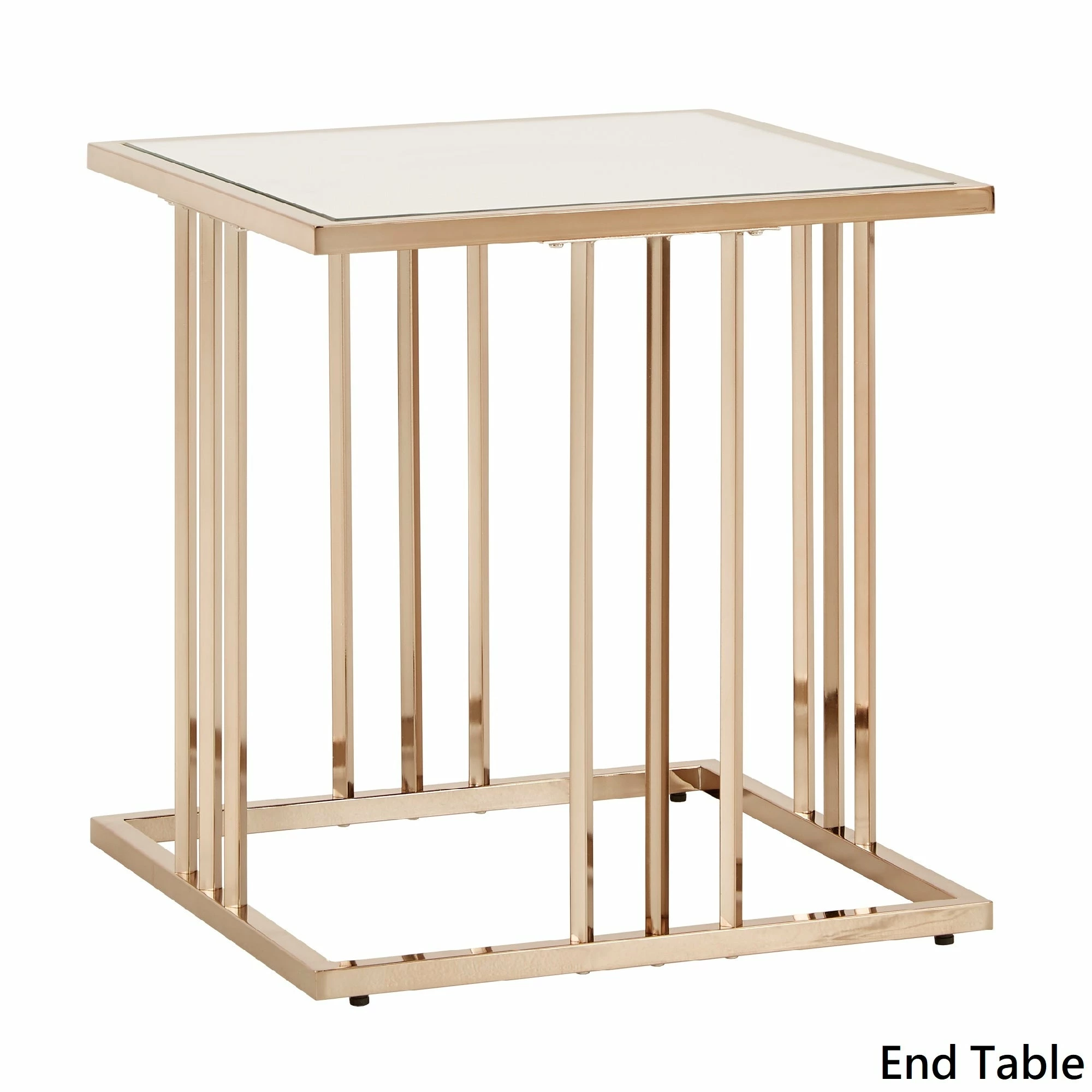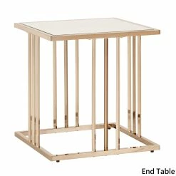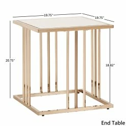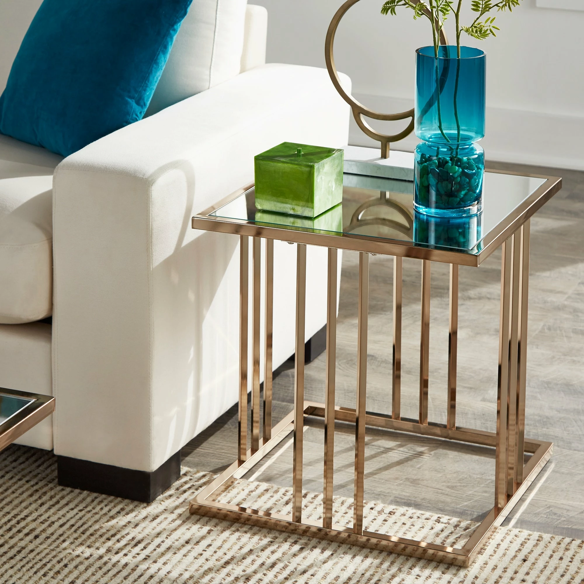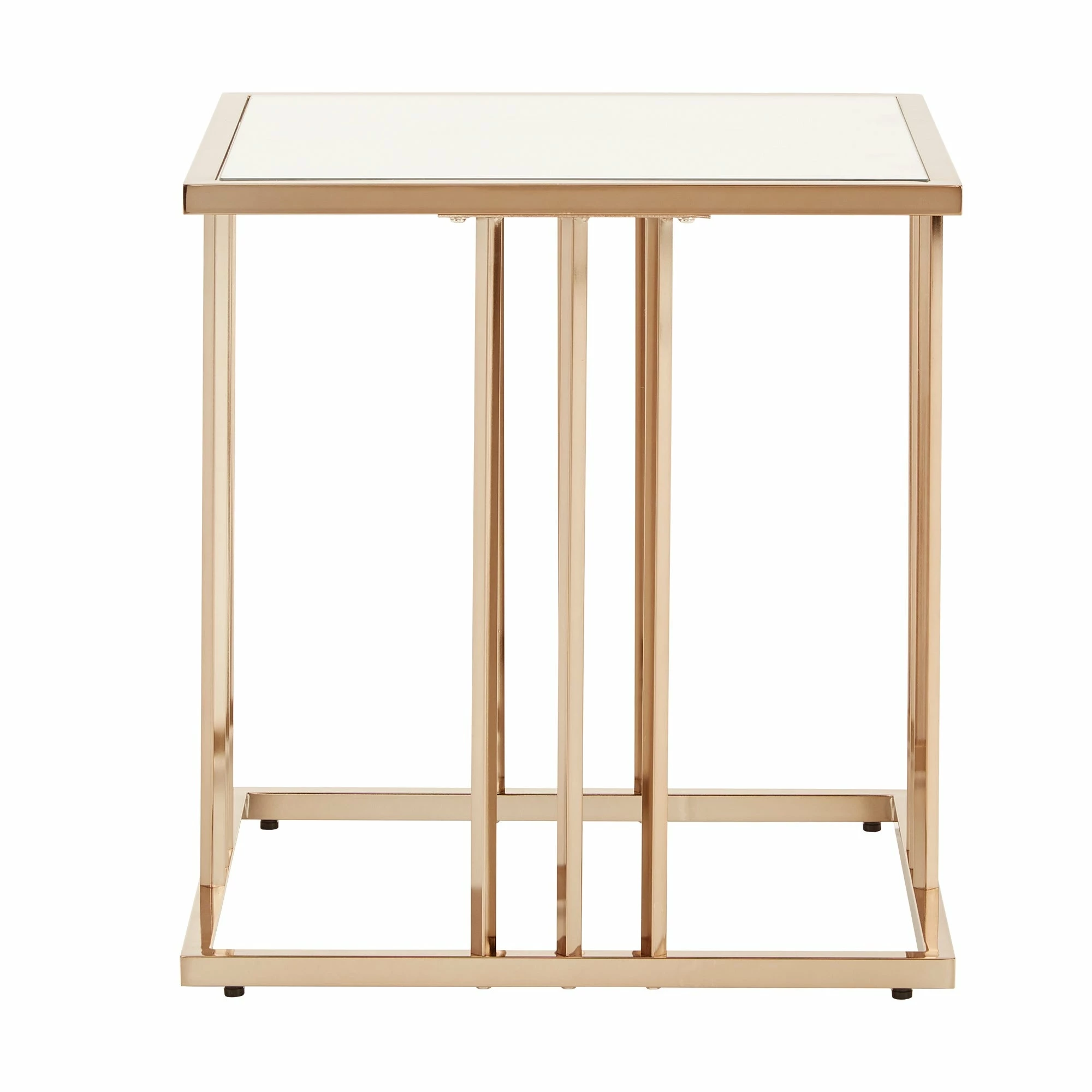 The perfect addition to an upscale, themed space, the iNSPIRE Q Maddison champagne gold finish end table brings serious luxury to any room in your home. A beautiful mirrored table top is connected to the bold metal base with a shiny, champagne gold frame that features three parallel bars on each table side. Place this collection in your home for a sophisticated, glam style that’s sure to make a statement.