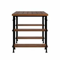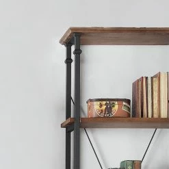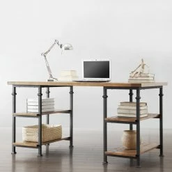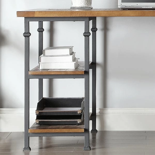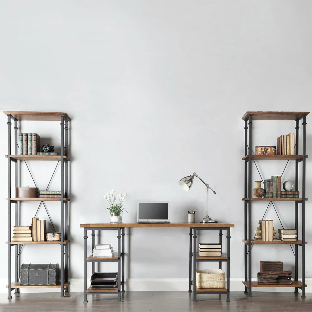 Load up your home office space with plenty of storage and display options with this three-piece set. A rustic-styled desk features open shelving on either side for easy access, and two coordinating bookcases balance the look of your office space with additional shelving. Black sand finished metal framing keeps these pieces stable and strong.