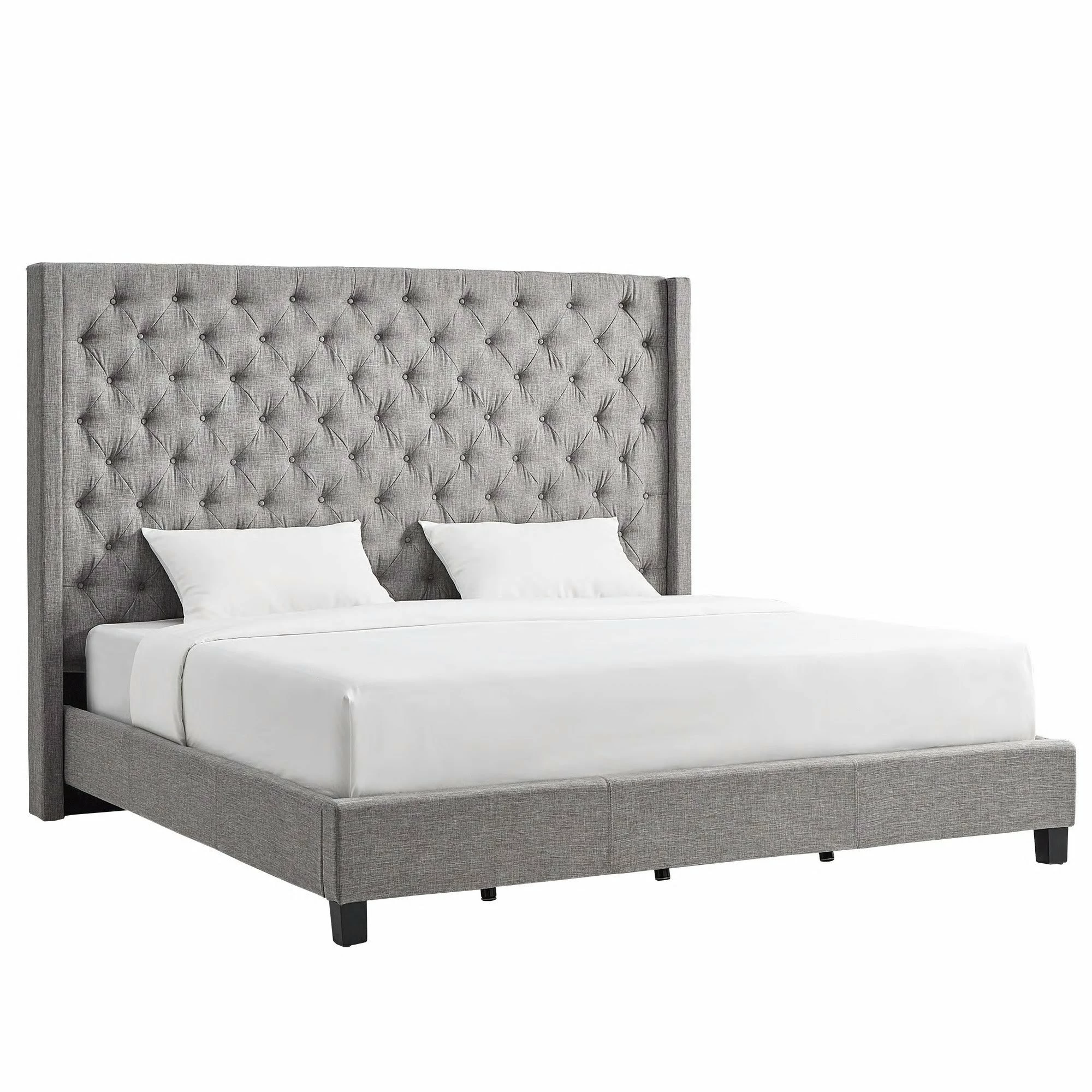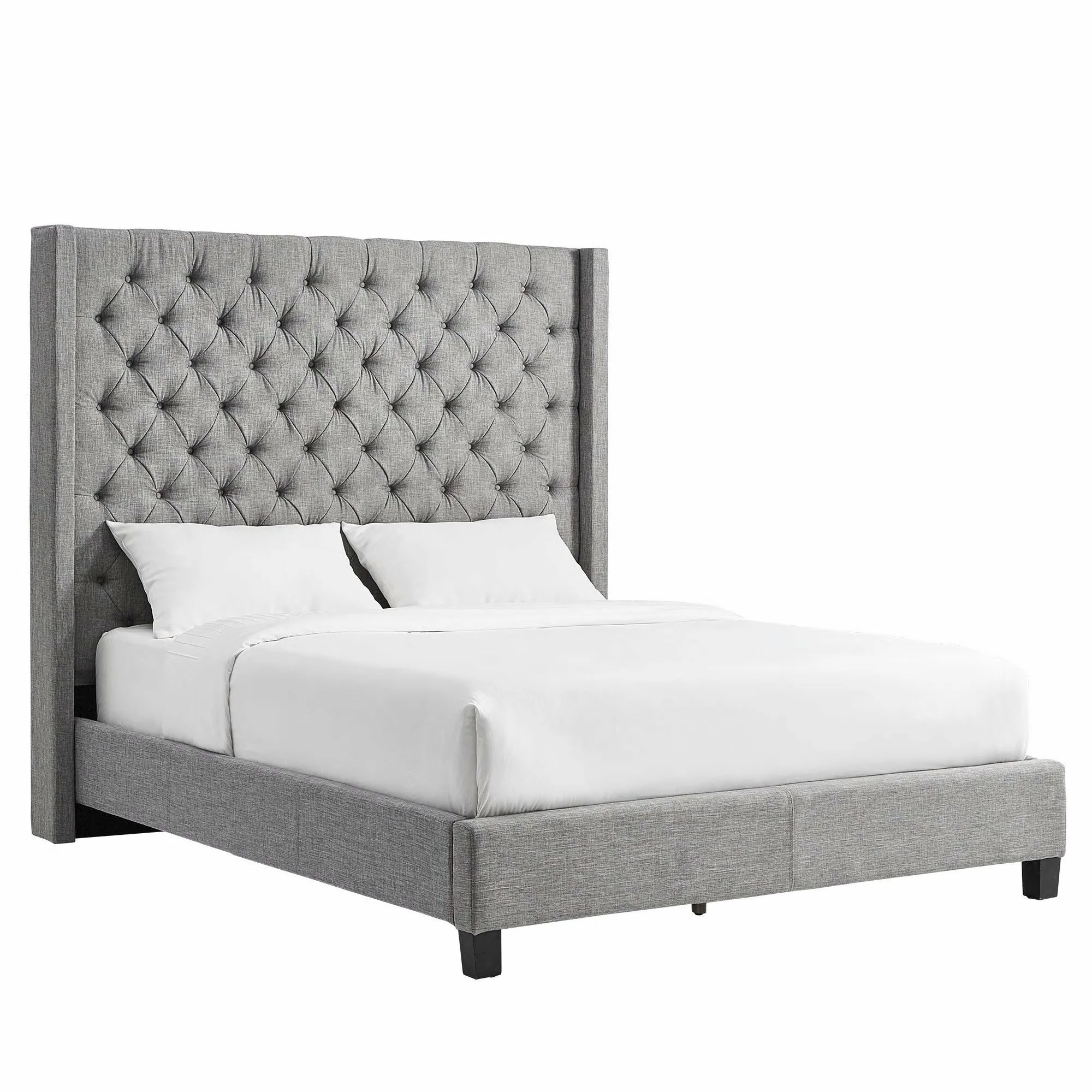 Supreme elegance gets a regal and robust showcase with the posh grandeur of this platform bed. The striking silhouette of a sleek and austere headboard complete with button tufting and a wingback design is sure to infuse your bedroom with wonderful grace. The sturdy frame is finished with espresso finish legs for a beautiful combination of function and style you are sure to enjoy.