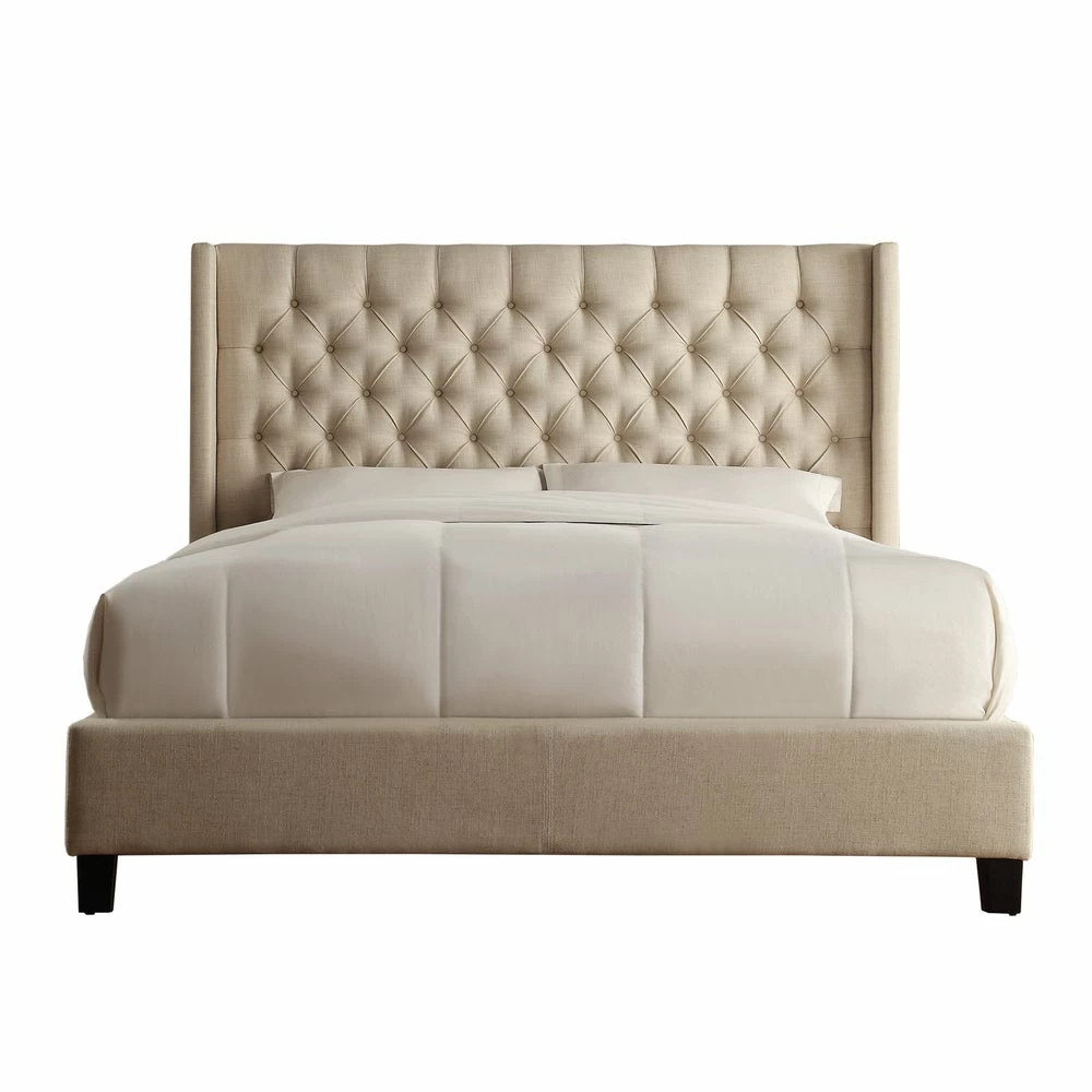 Relax on your personal cloud with the Naples Collection bed. The headboard features a button-tufted and wingback shape that will make this the centerpiece of your room. The beige linen upholstery covering the headboard and rails is the perfect backdrop for linens that show your personal style. The sturdy poplar frame is anchored by espresso finish legs for a beautiful combination of function and style.
