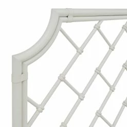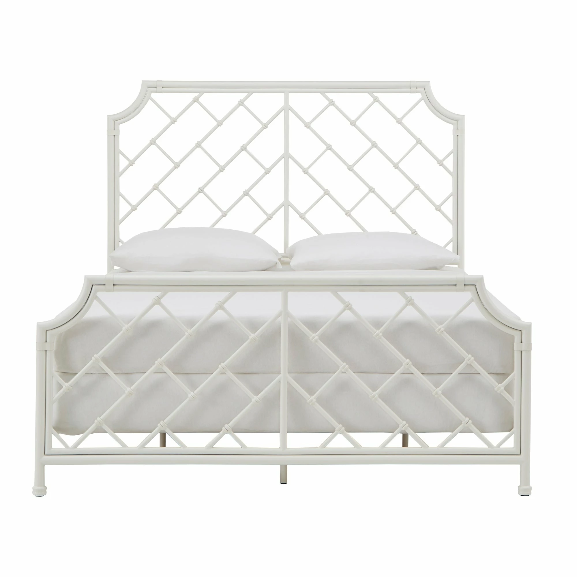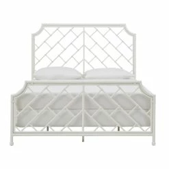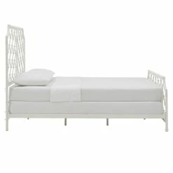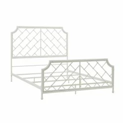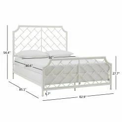 A snowy white finish brightly highlights the sturdy metal frame of the Nelle bed by iNSPIRE Q. A mosaic of angled rectangles is knotted and fully welded along the scalloped headboard and footboard to give this bed its intricate visual detailing–perfect for a traditional setting, but far from boring. The farmhouse-style bedroom furniture is complete with slats thoughtfully connected using sturdy U-shaped cleats and finished with middle support legs so you can snooze in reliable comfort.