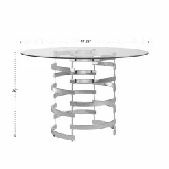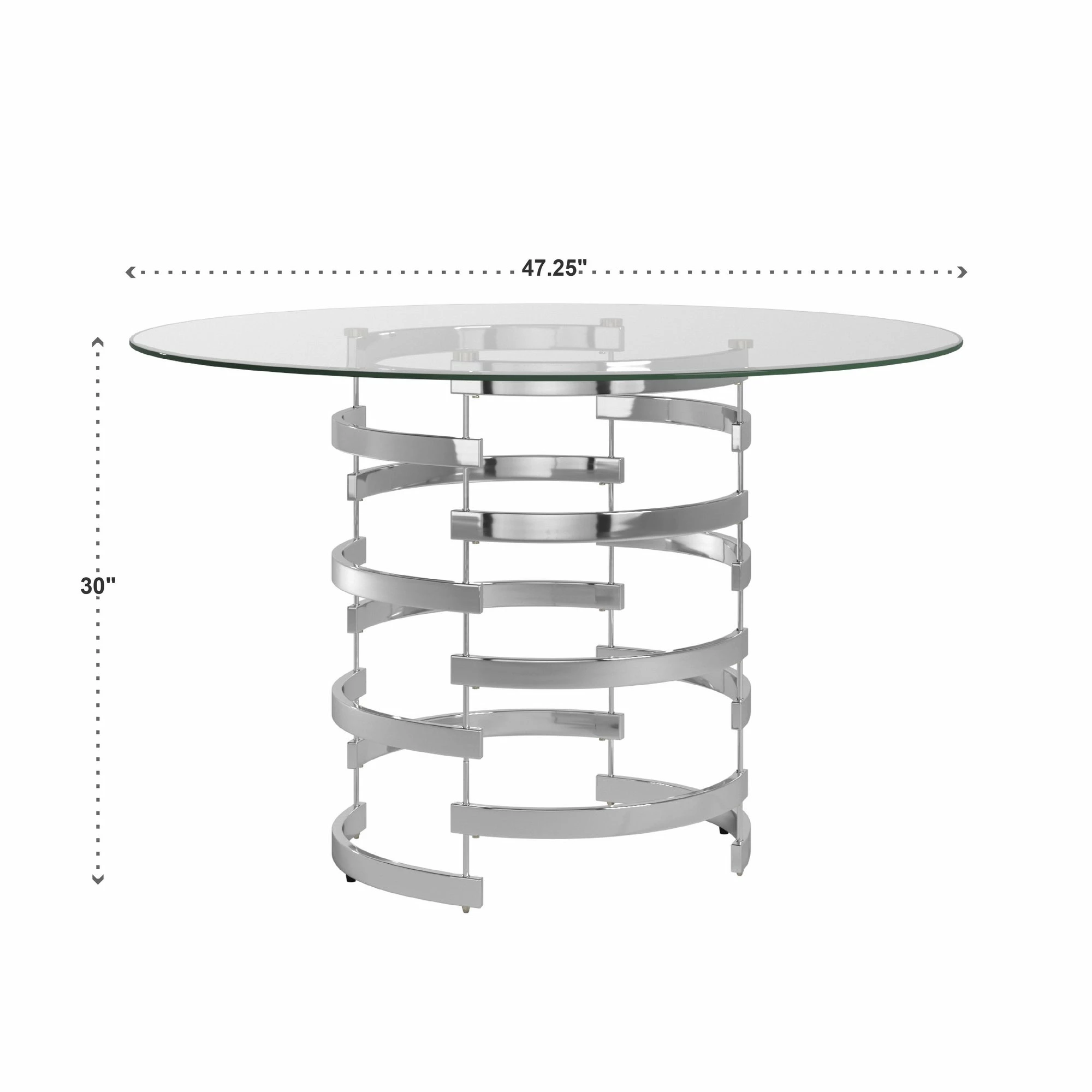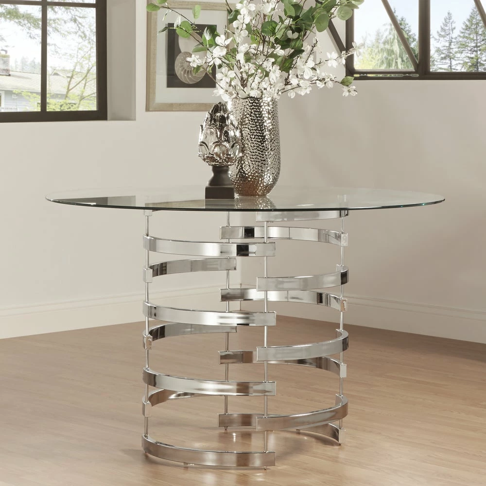 Accent the modern decor of your dining room with this Nova dining table from iNSPIRE Q® Bold. The round glass top complements the circular iron base for an elegant and luxurious look that enhances your contemporary decor scheme. The shiny chrome finish adds to the visual appeal of the table, while the compact design is perfect for decorating small living areas.