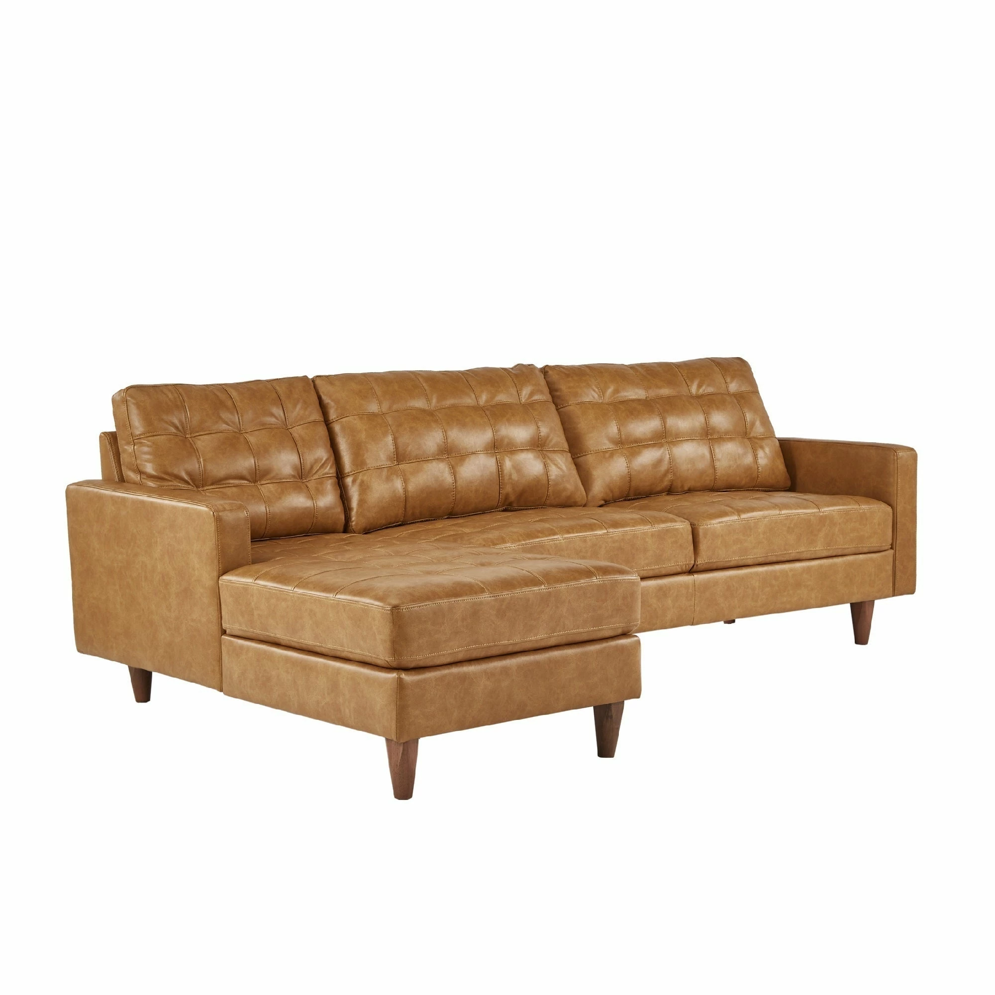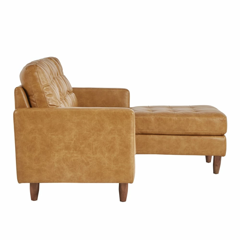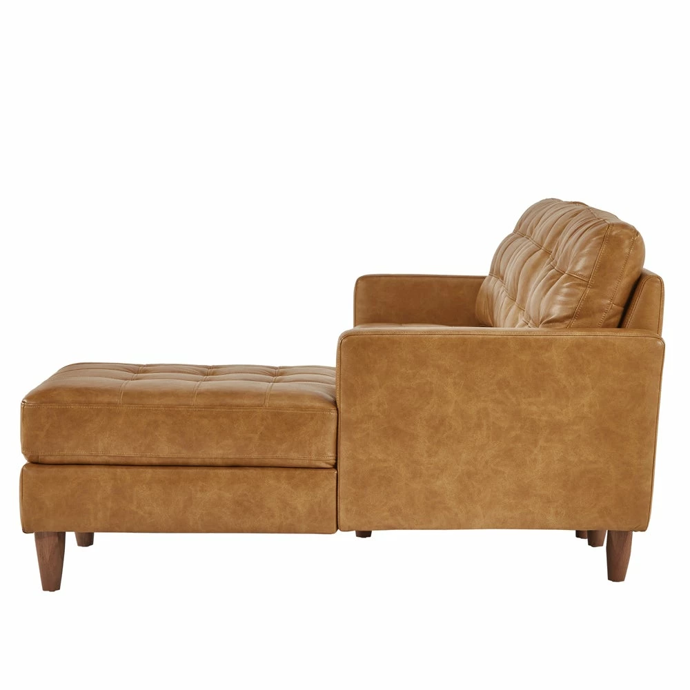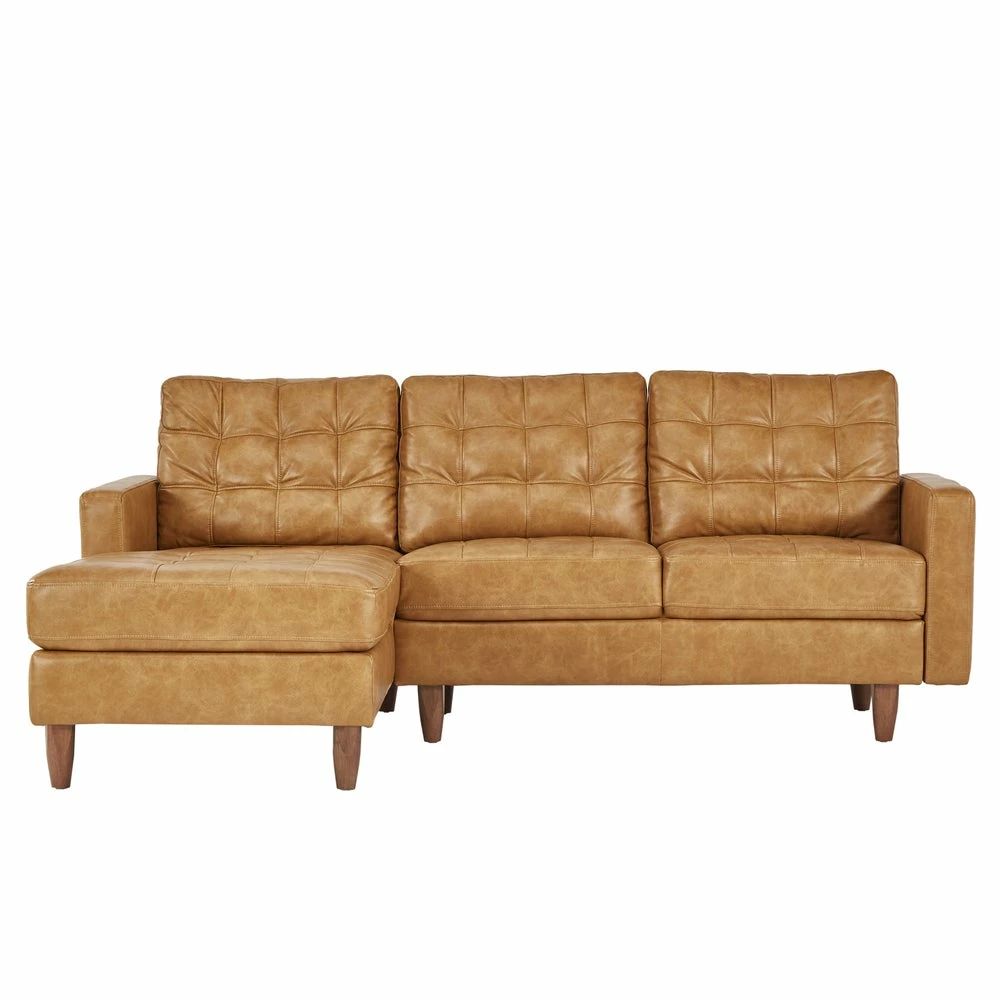 Enhance your living space with the chic and comfortable Odin Caramel Leather Gel Sofa Sectional with Chaise by iNSPIRE Q® Modern. The simple contours, luxurious leather gel upholstery, and warm caramel color convey stunning contemporary style. Featuring walnut finish tapered legs inspired by mid-century aesthetics for a bold pop of style. The subtle quilted tufting creates a plush, comfortable look and completes the unique modern design. Select a left or right facing chaise and kick back and relax in style. Available in three or four seat versions.