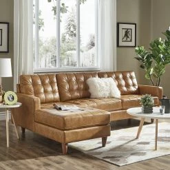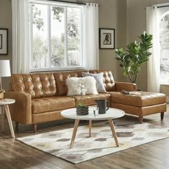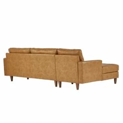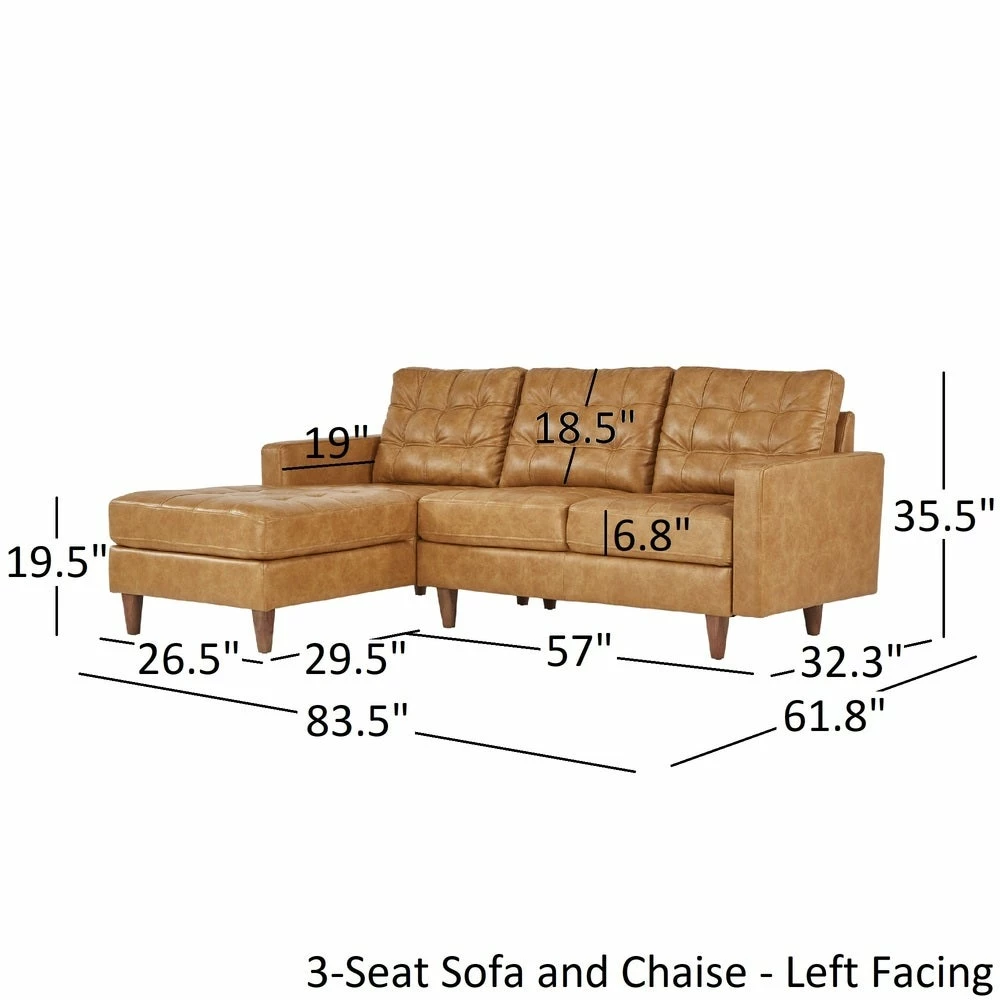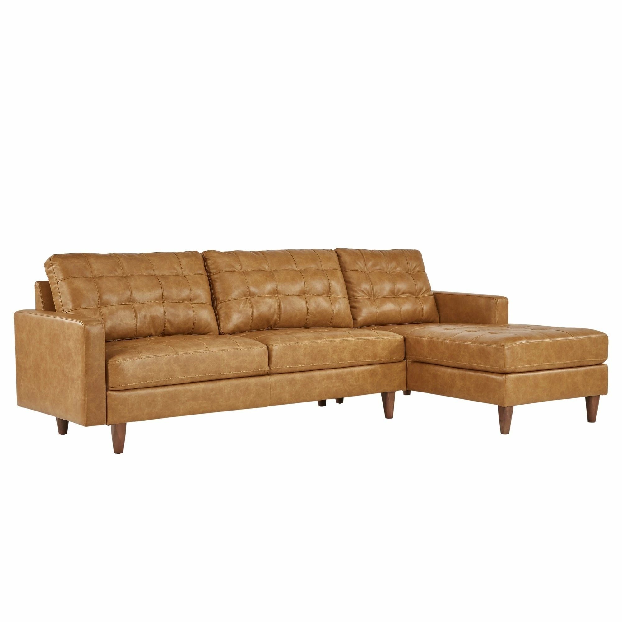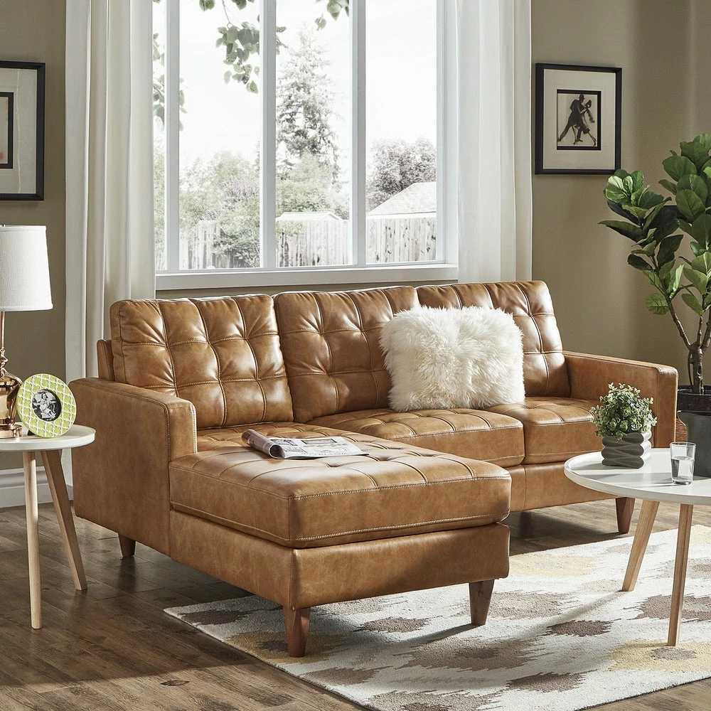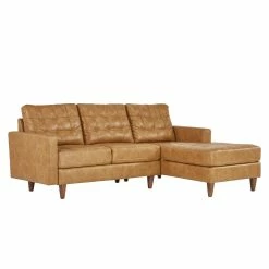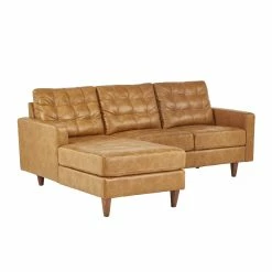 Enhance your living space with the chic and comfortable Odin Caramel Leather Gel Sofa Sectional with Chaise by iNSPIRE Q® Modern. The simple contours, luxurious leather gel upholstery, and warm caramel color convey stunning contemporary style. Featuring walnut finish tapered legs inspired by mid-century aesthetics for a bold pop of style. The subtle quilted tufting creates a plush, comfortable look and completes the unique modern design. Select a left or right facing chaise and kick back and relax in style. Available in three or four seat versions.
