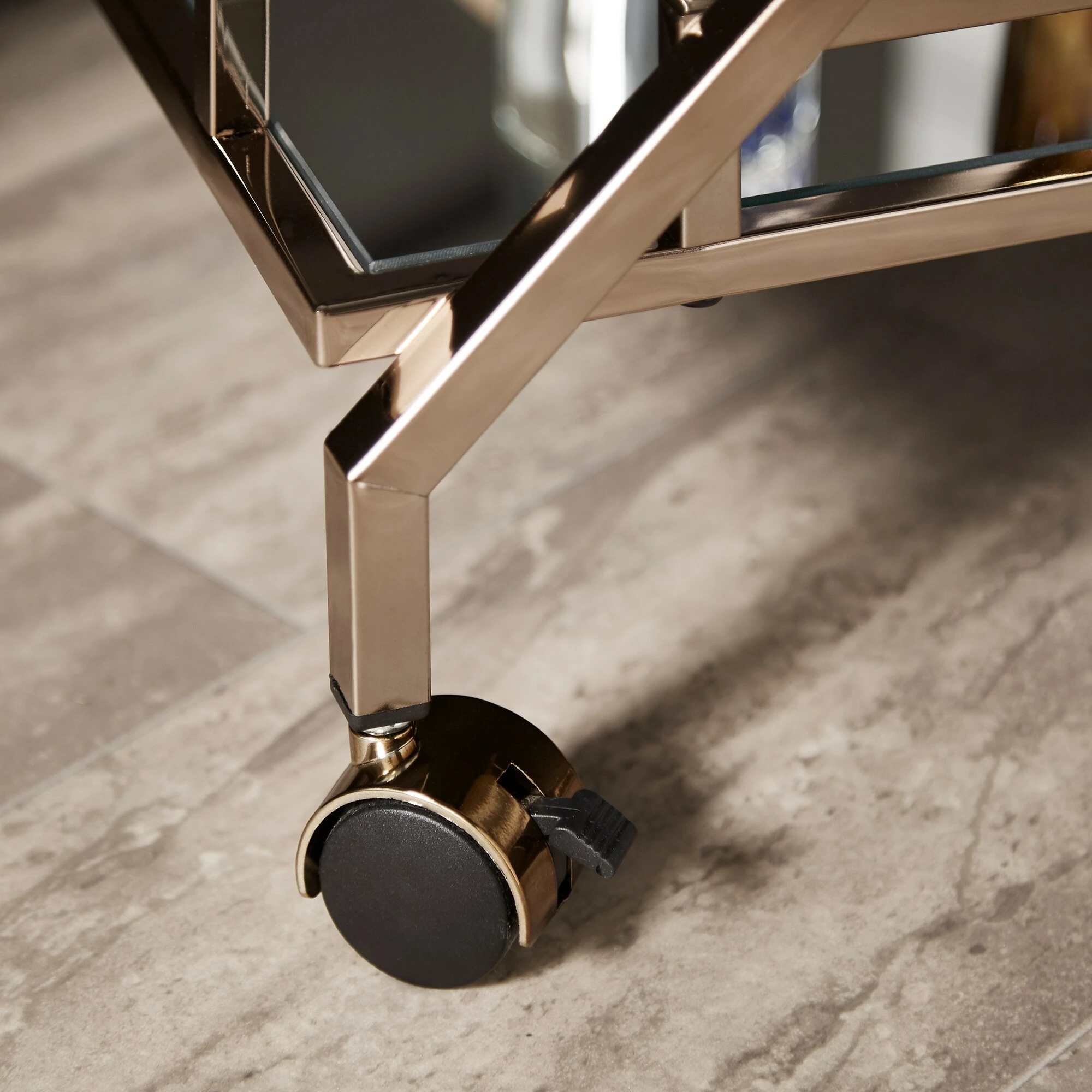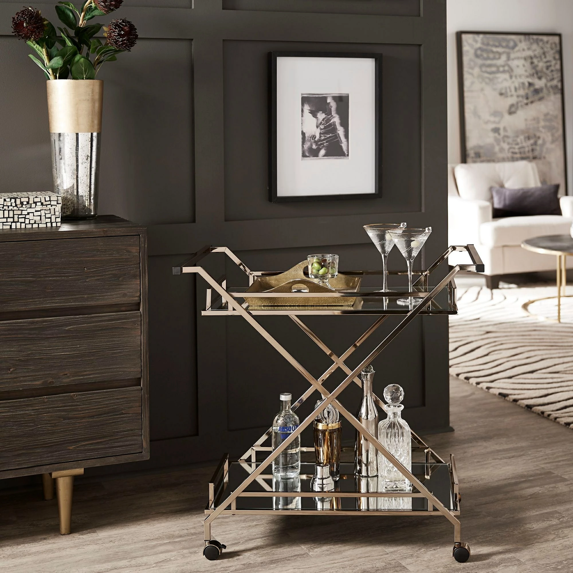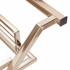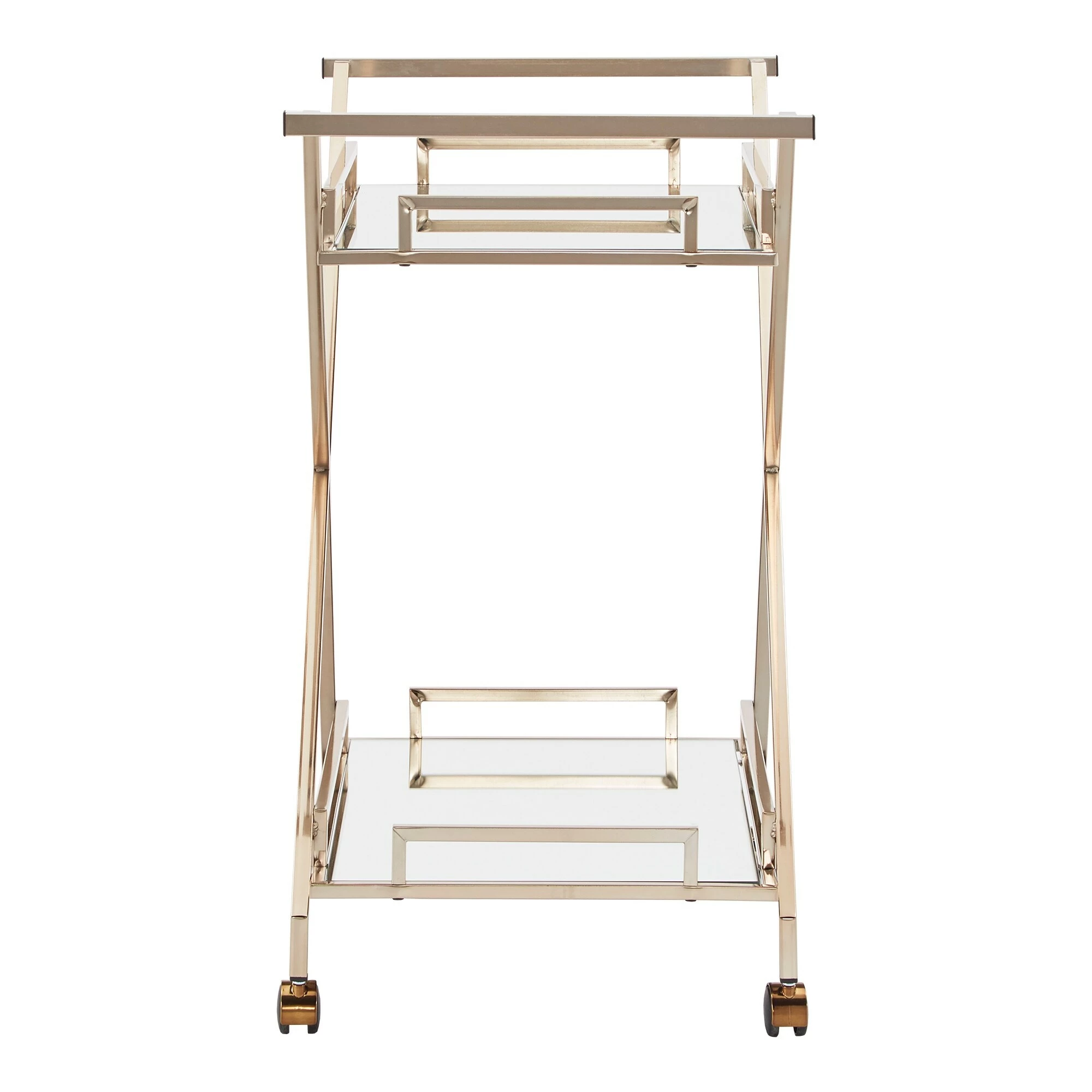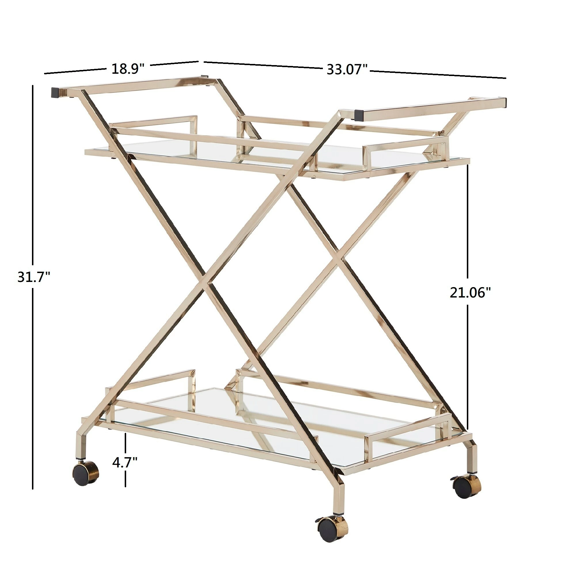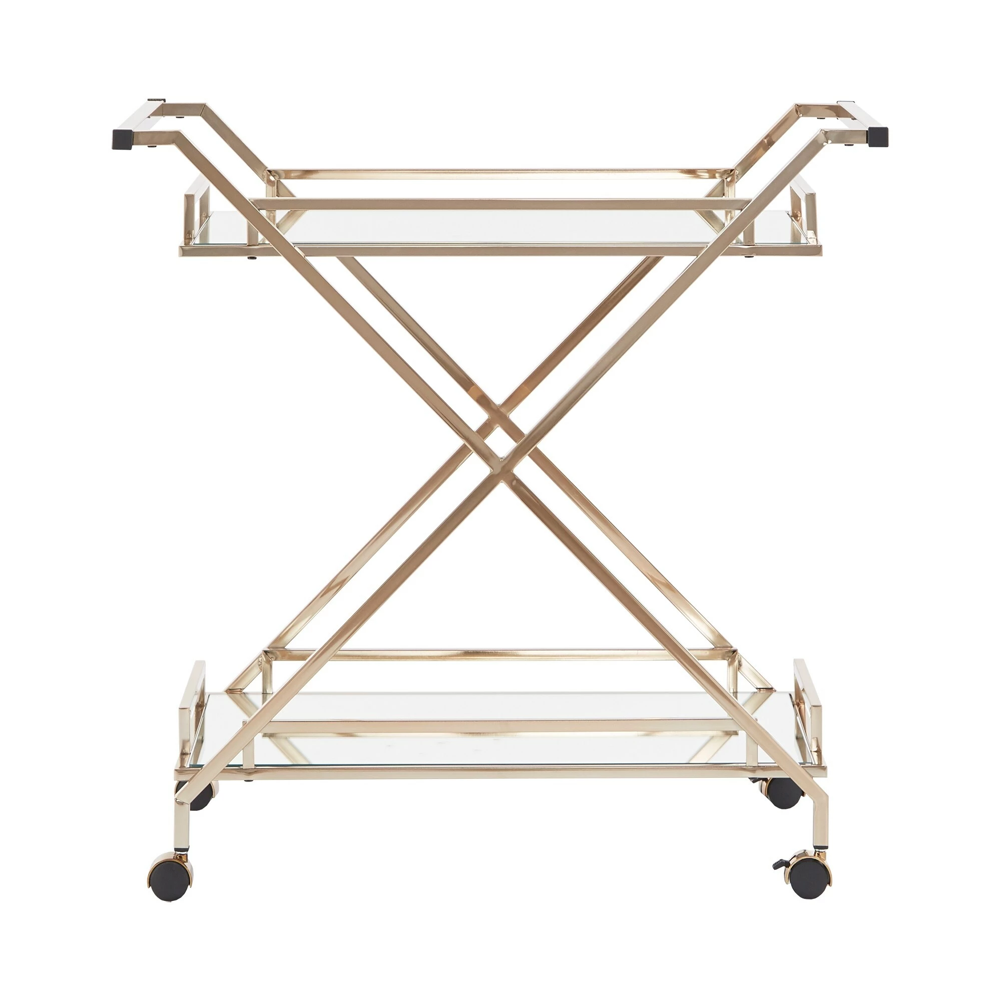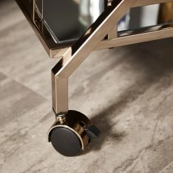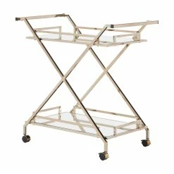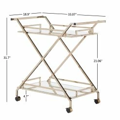 A timeless and eclectic vibe is set for your home bar space with the iNSPIRE Q Palisade champagne gold bar cart. With a mirrored top and bottom shelf, along with a champagne gold metal finish frame, this cart provides a glamorous and styled spot to display barware and cocktail essentials. With handles on both sides of the cart and caster wheels, this cart easily moves from room to room so you can serve guests just about anywhere in your home.