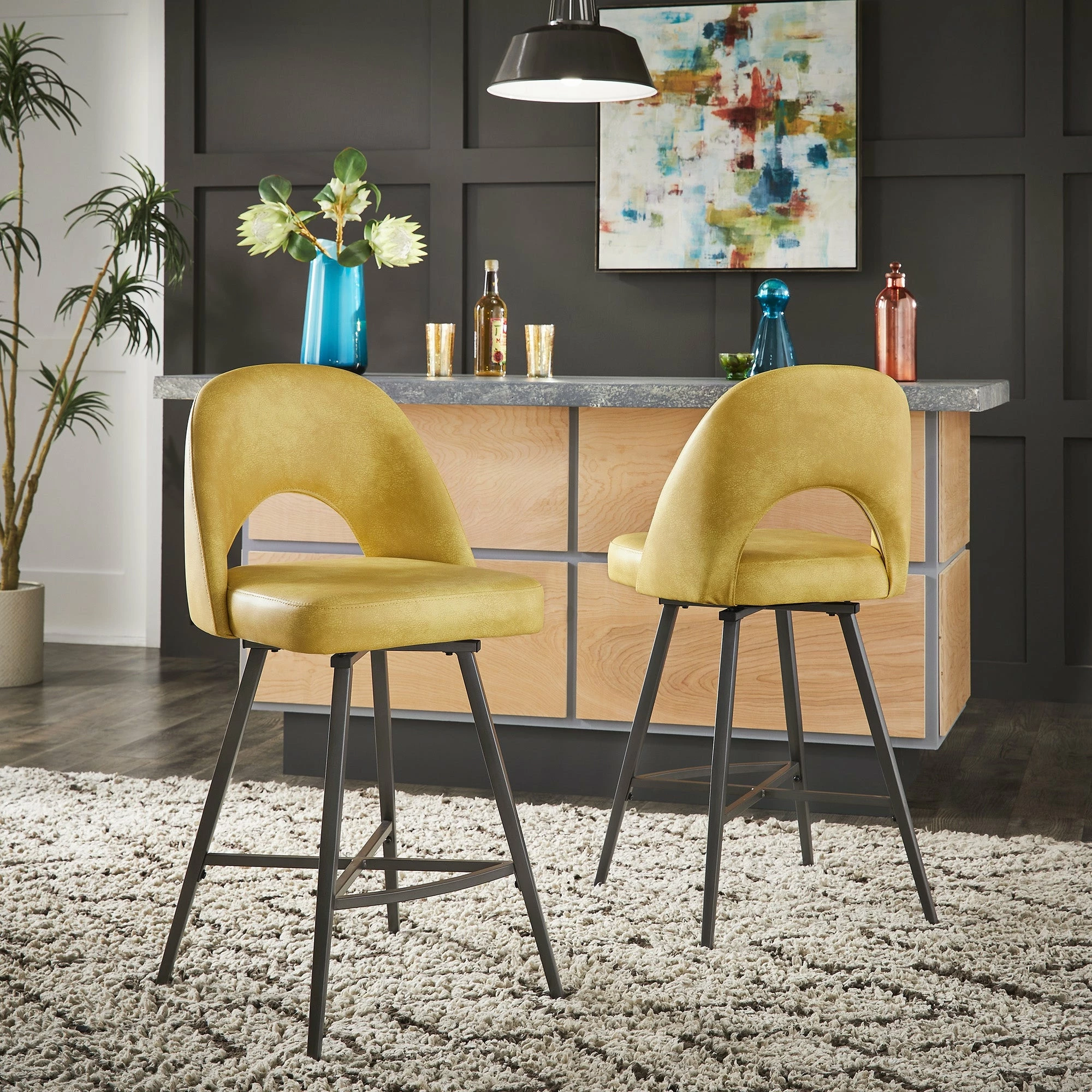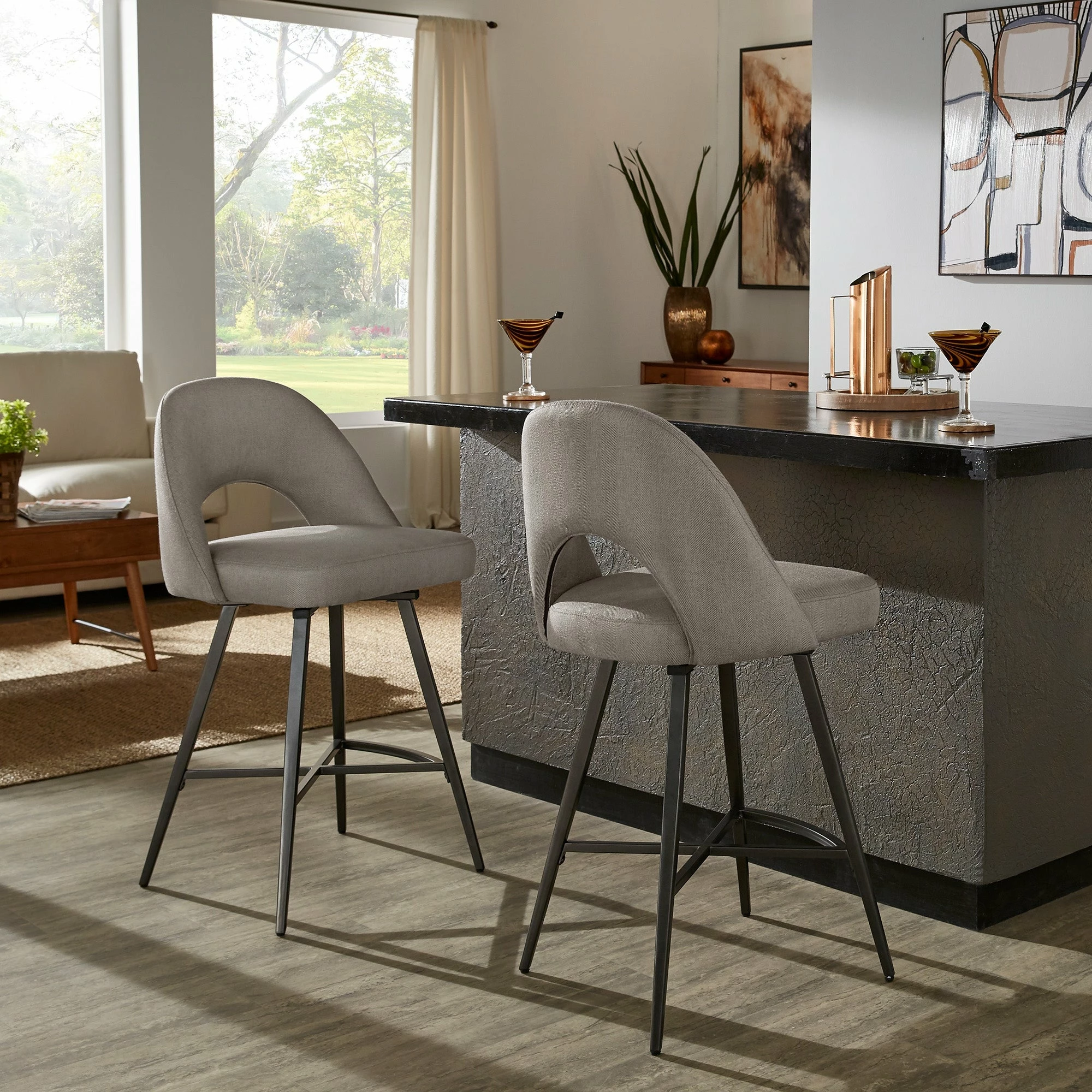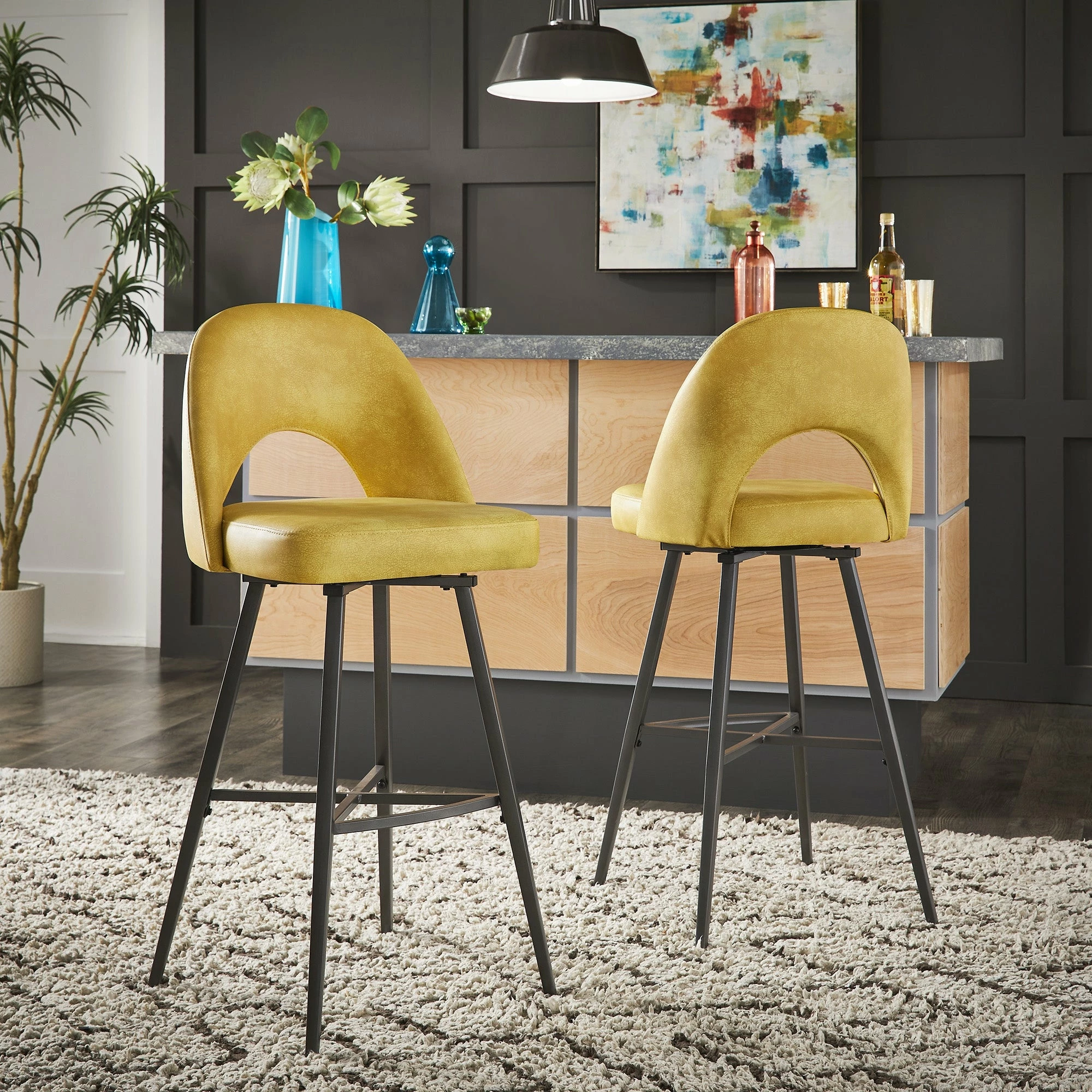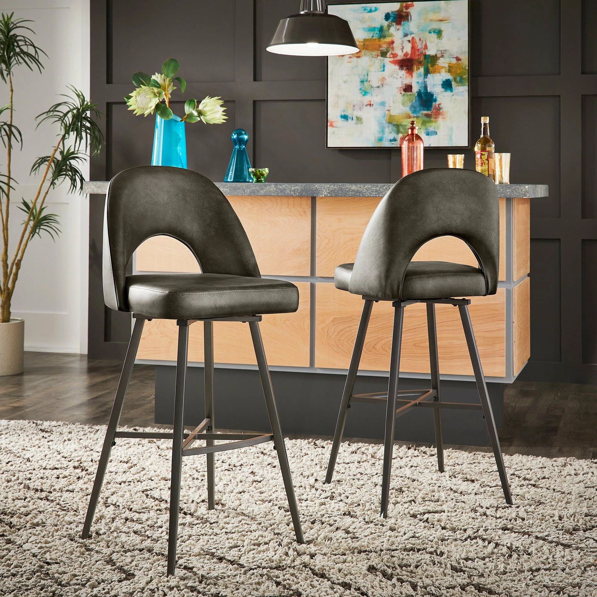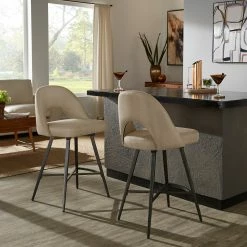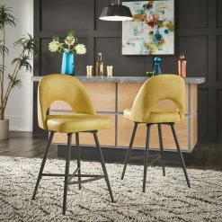 Add some statement-making, contemporary style to your kitchen or bar area with the iNSPIRE Q Presley Metal Fabric Swivel Bar Stools (Set of 2). This set displays classic, retro style with half-circle cutouts and thin yet sturdy black metal legs. Dine casually and comfortably, thanks to soft fabric upholstery, plush foam cushioning, and a convenient swivel feature for easy maneuverability.