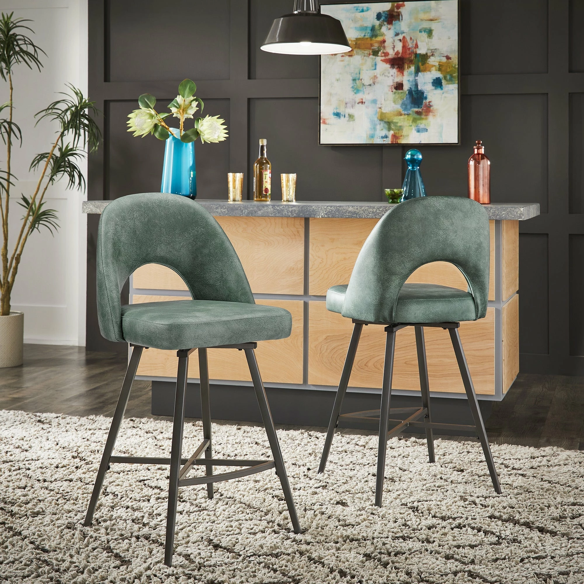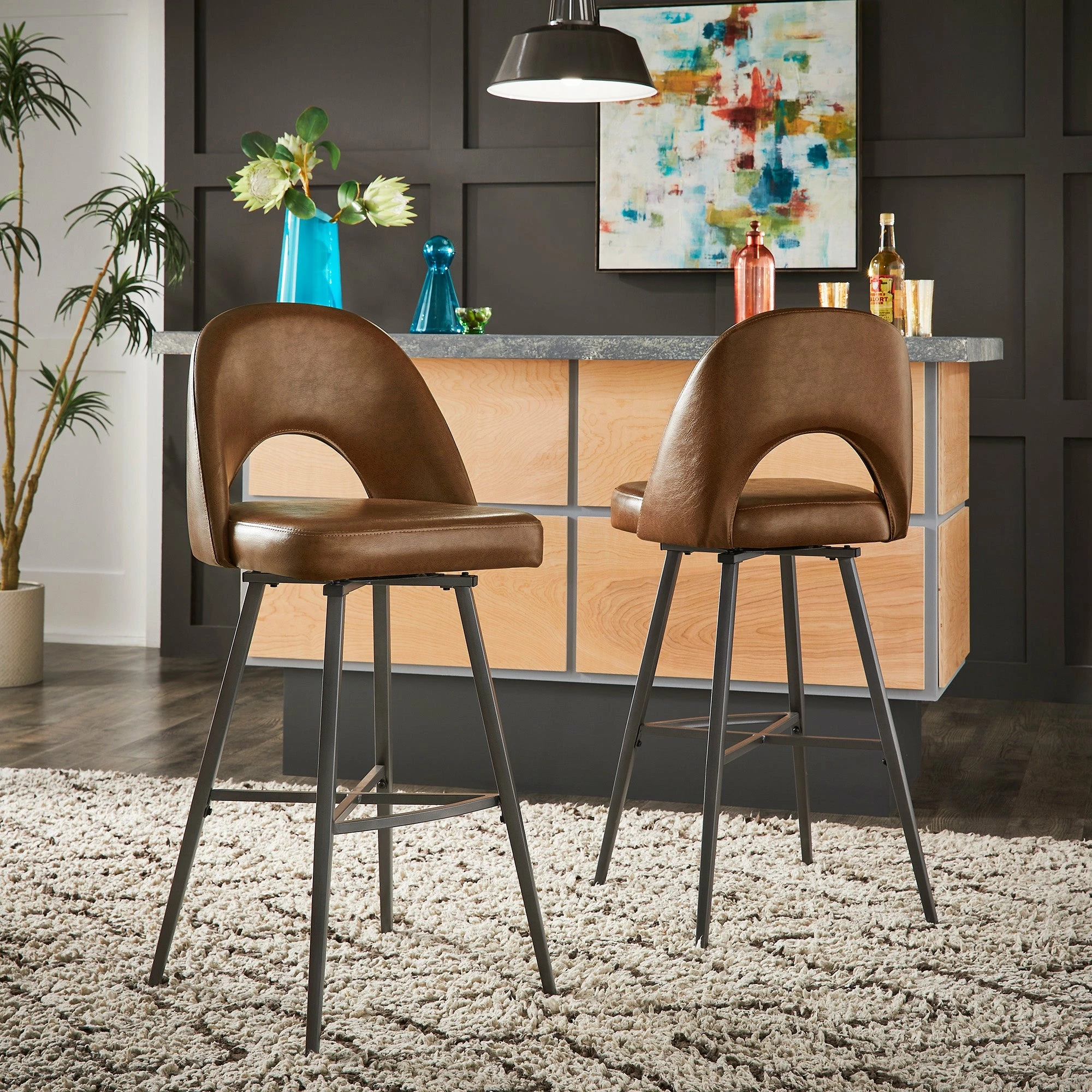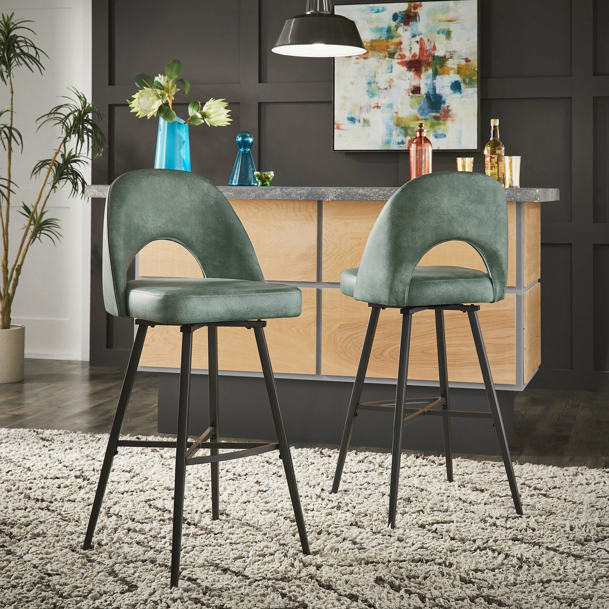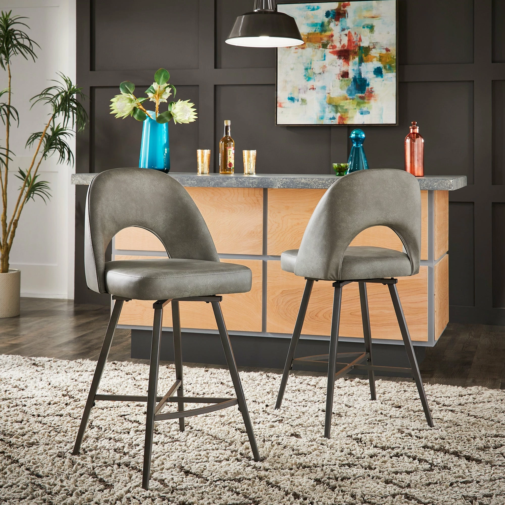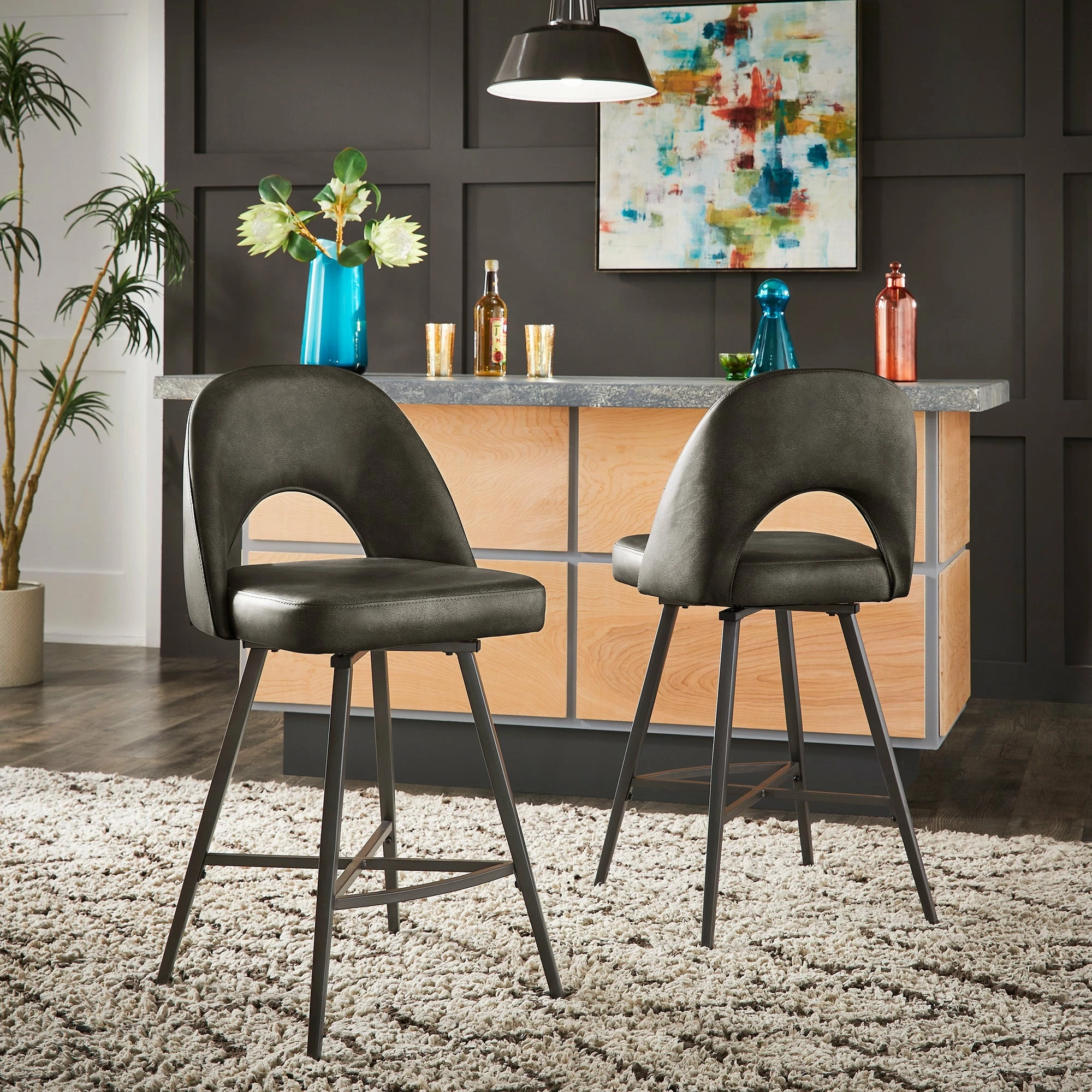 Add some statement-making, contemporary style to your kitchen or bar area with the iNSPIRE Q Presley Metal Fabric Swivel Bar Stools (Set of 2). This set displays classic, retro style with half-circle cutouts and thin yet sturdy black metal legs. Dine casually and comfortably, thanks to soft fabric upholstery, plush foam cushioning, and a convenient swivel feature for easy maneuverability.
