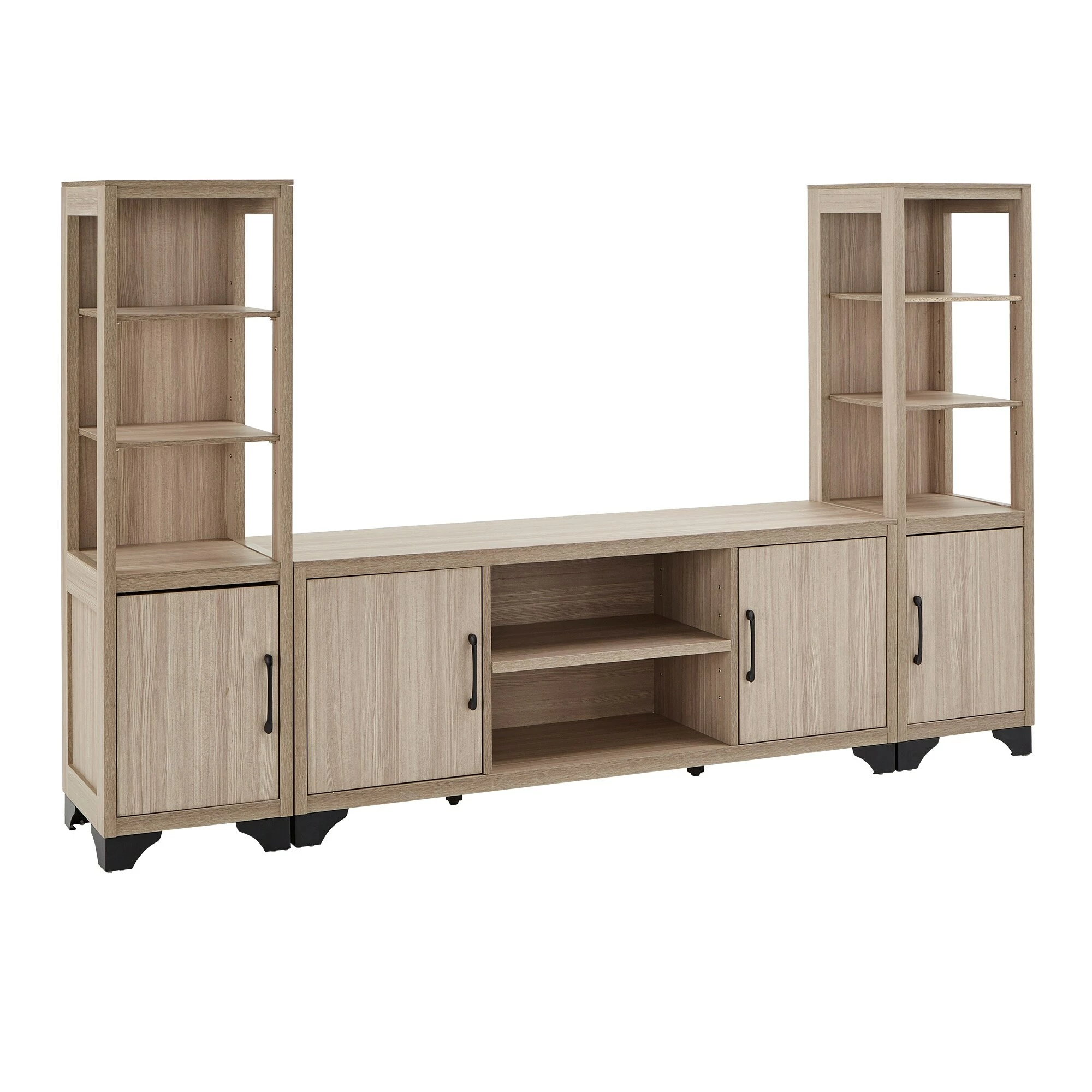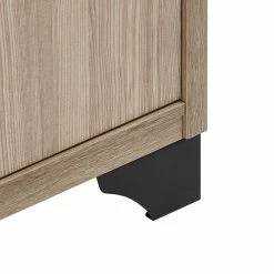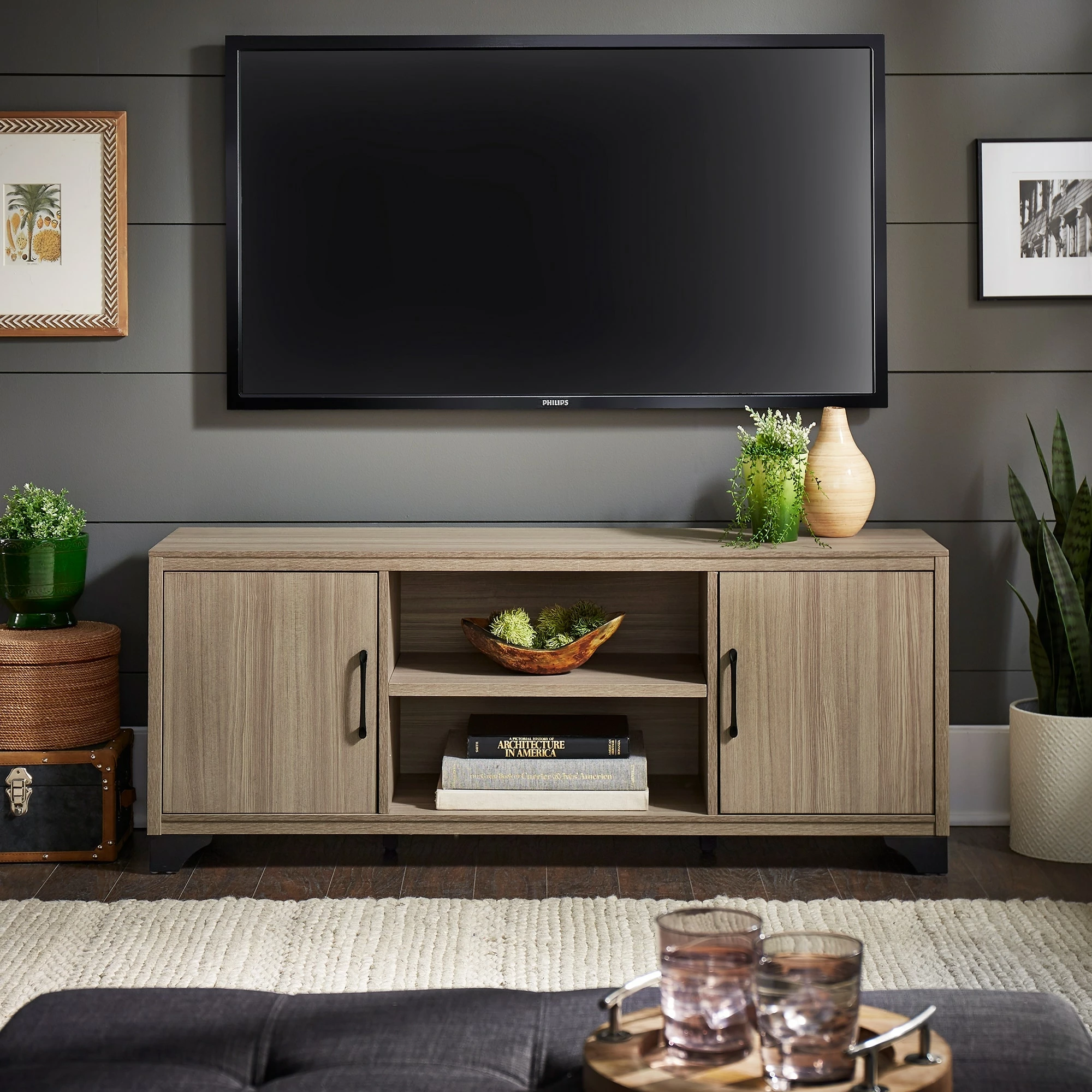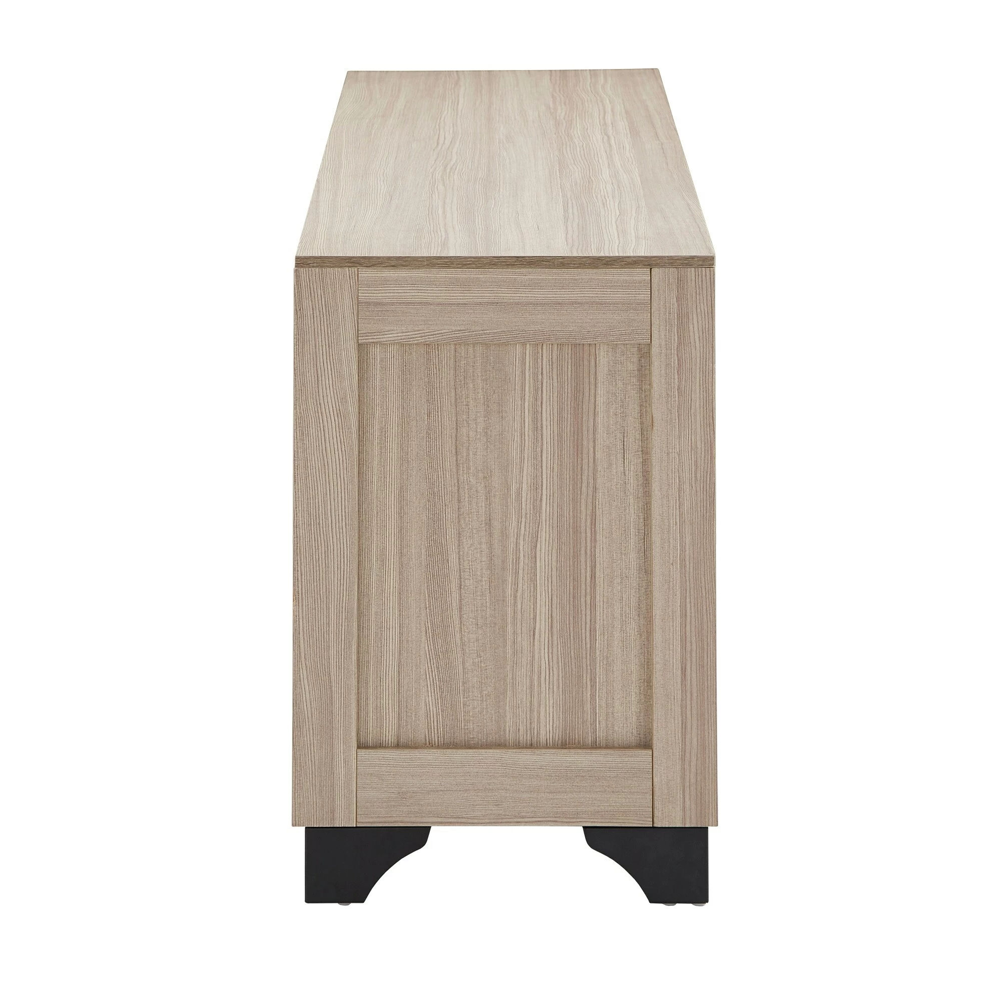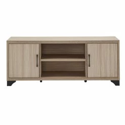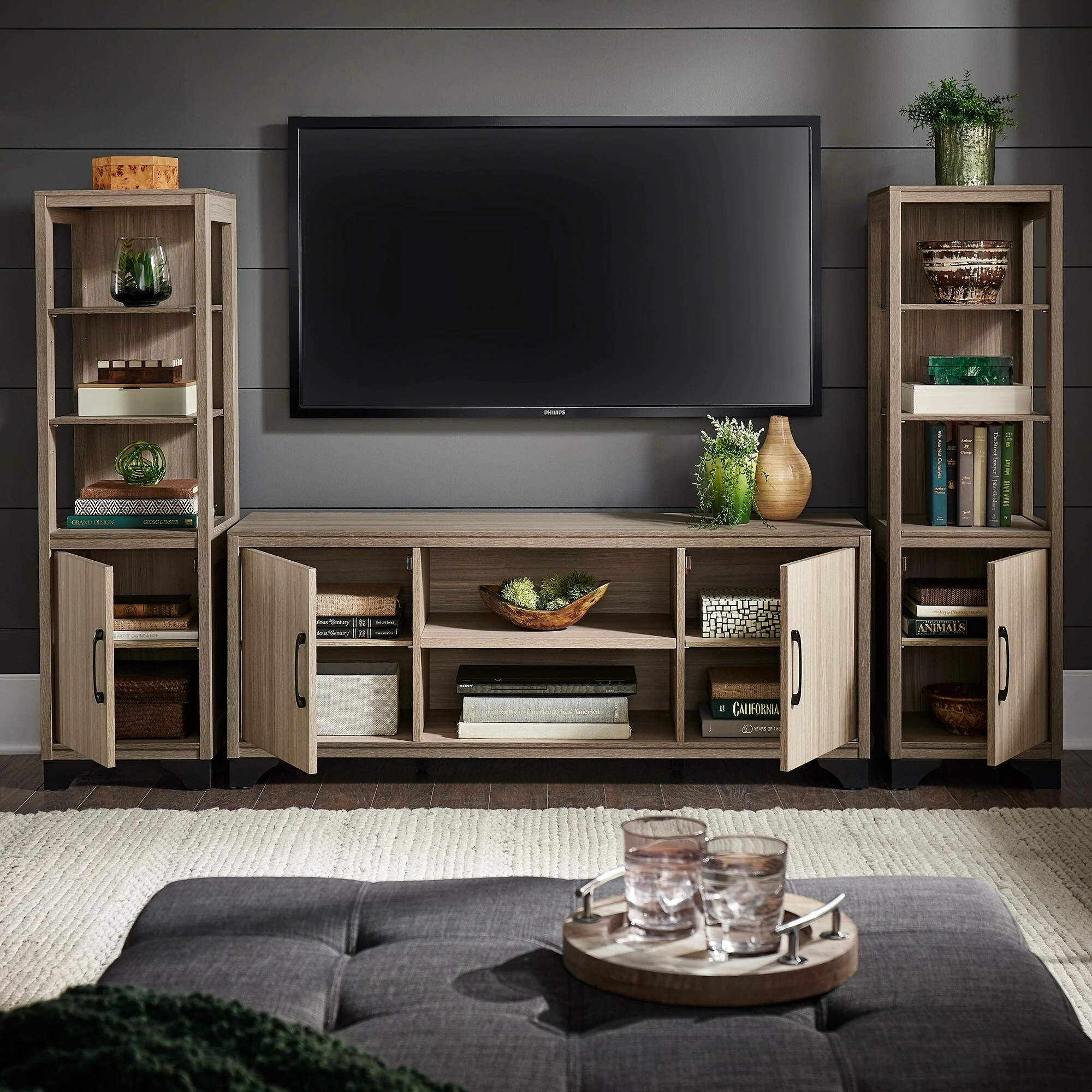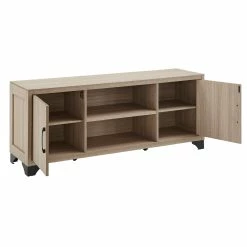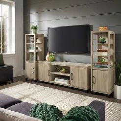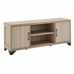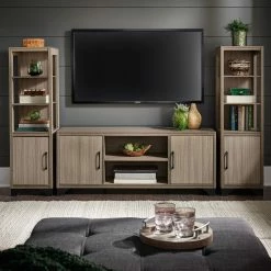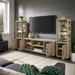 This farmhouse-inspired entertainment center is practical, simple, and has a rustic charm. This TV stand features two cabinets with doors and adjustable height shelves for tucking away DVDs, game consoles, and more. The center open with an adjustable height shelve is a perfect place for your audio amplifier, wifi modem, and cable box. The unique design of the cutout on the center adjustable-height shelf allows the cable to run through in between. The cutout hole at the back stops wires from taking over and ventilation. Four corner legs with two support legs provide stability to the whole unit. You can also buy two matching accent cabinets as a set to complete the design. The cabinet is only 55.28″ tall, so it is functional but not overpowering your living room. Each cabinet has two adjustable/removable shelves and one cabinet door revealing one-shelf storage. This entertainment center makes it easy to organize your urban functional living room.