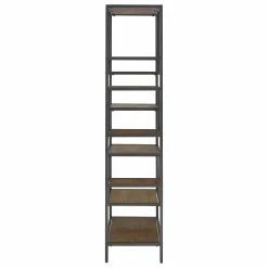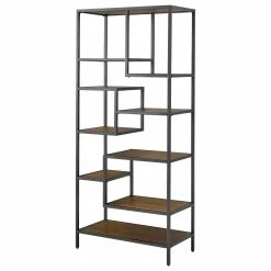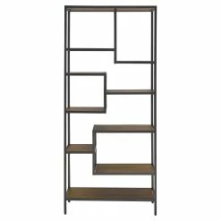 Providing your space with visually puzzling beauty, the iNSPIRE Q Rogers cherry finish 32″W bookcase provides your home décor items with a styled place to sit. With a unique shape, this bookcase features various sized cherry finish shelves that are arranged in an asymmetrical design that offers styled display space for your most prized possessions. With a contrasting black metal frame this piece looks great in modern settings.