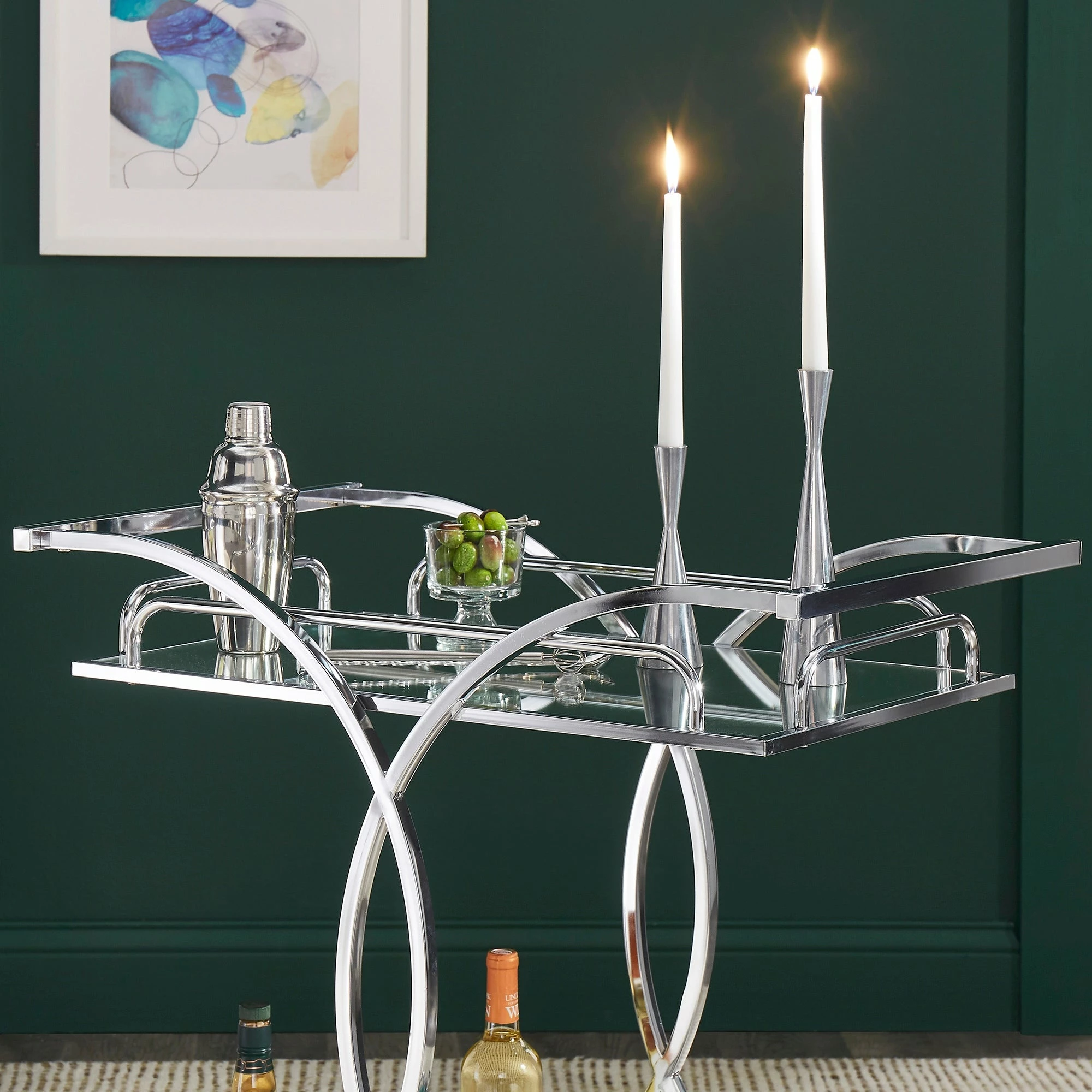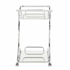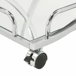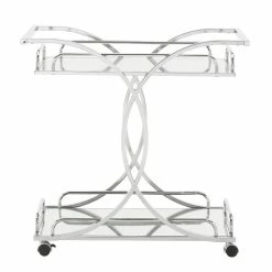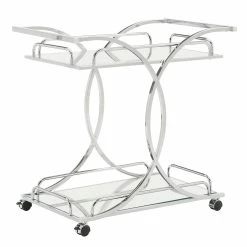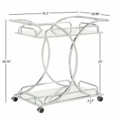 Displaying an eclectic, 1920s fashion, the iNSPIRE Q Rosewood Chrome Finish Bar Cart with Curving Legs is perfect for entertaining. A beautiful tempered mirrored top and bottom shelf offer the perfect spot to keep and display glassware and other cocktail accessories. The chrome finish curving metal frame displays a unique and modern design that’s sure to dress up your space, while caster wheels allow easy mobility so you can serve guests in any room in the home.