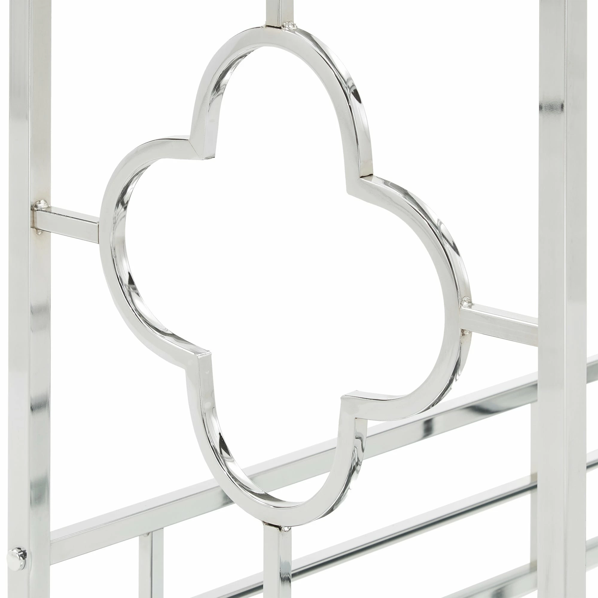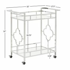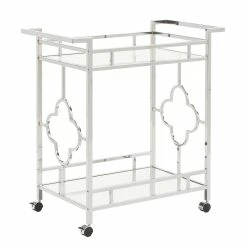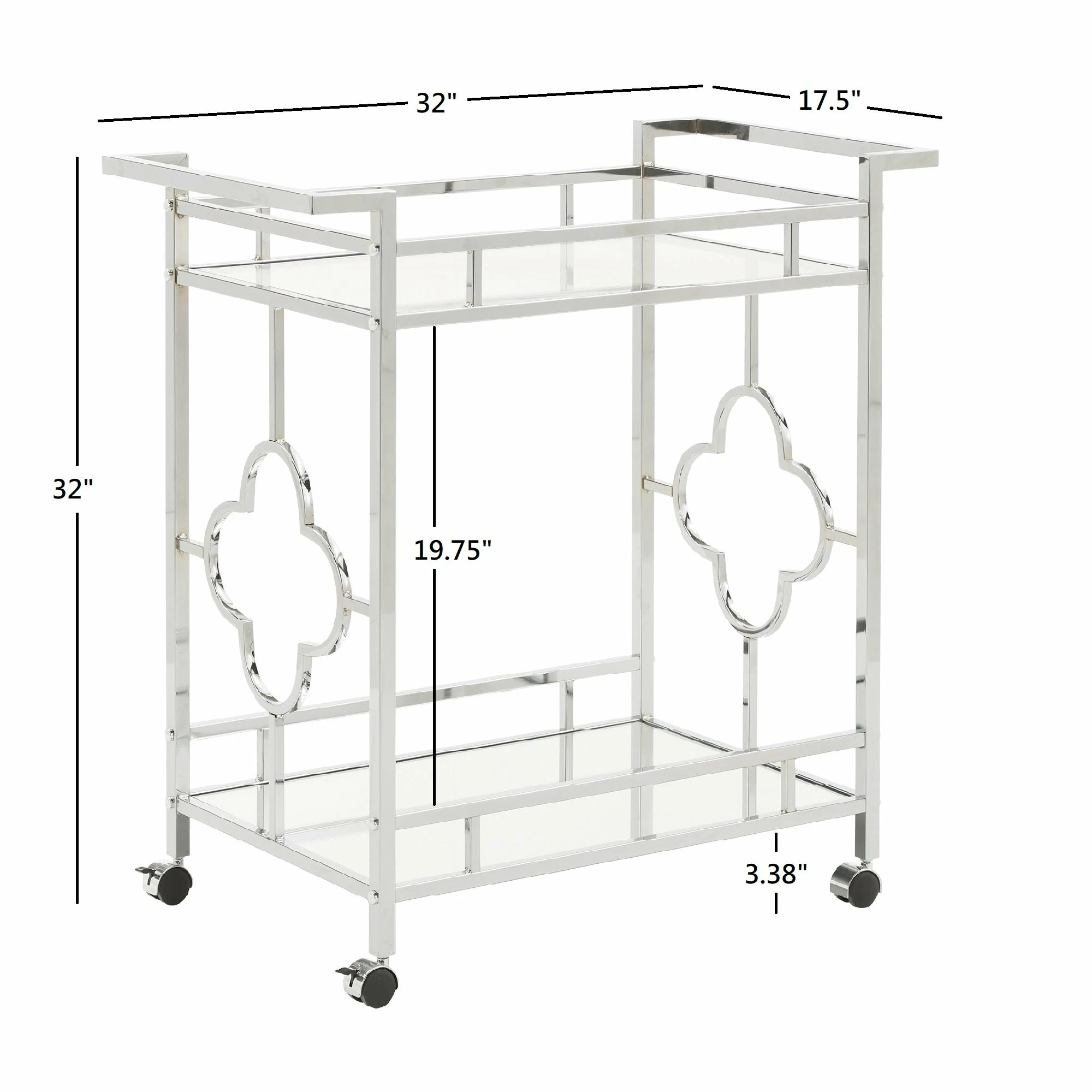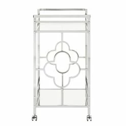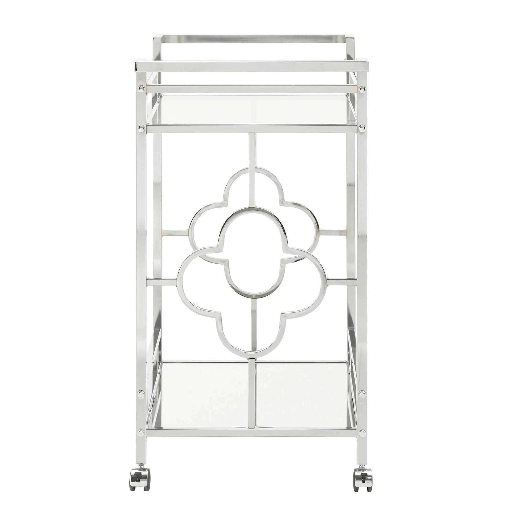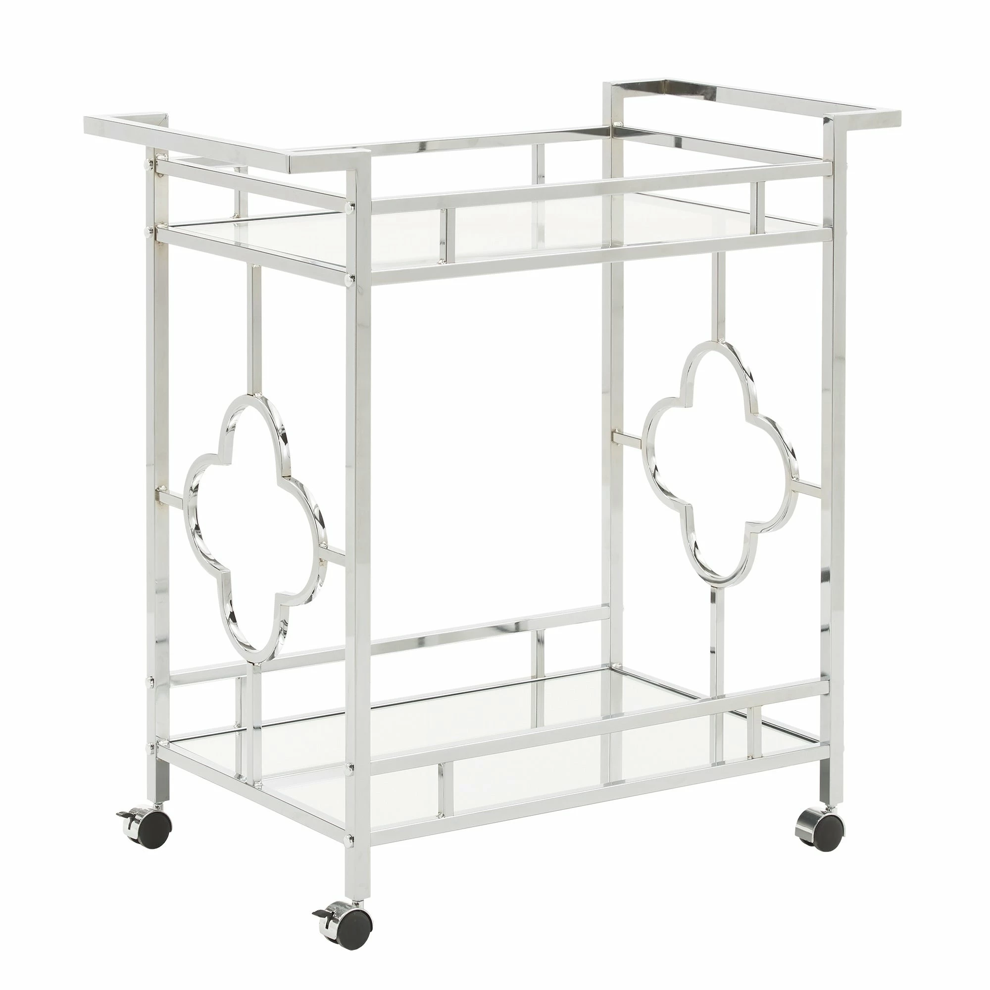 Make a statement with this elegant chrome finish bar cart! A sophisticated rounded quatrefoil pattern surrounds each edge of the cart to add an intentional standout statement within your home. This cart is conveniently fitted with locking caster wheels to keep your cart in place, wherever you may place it within your space! Two glam mirrored shelves allow you to get the party started, and keep items organized in a stylish way.