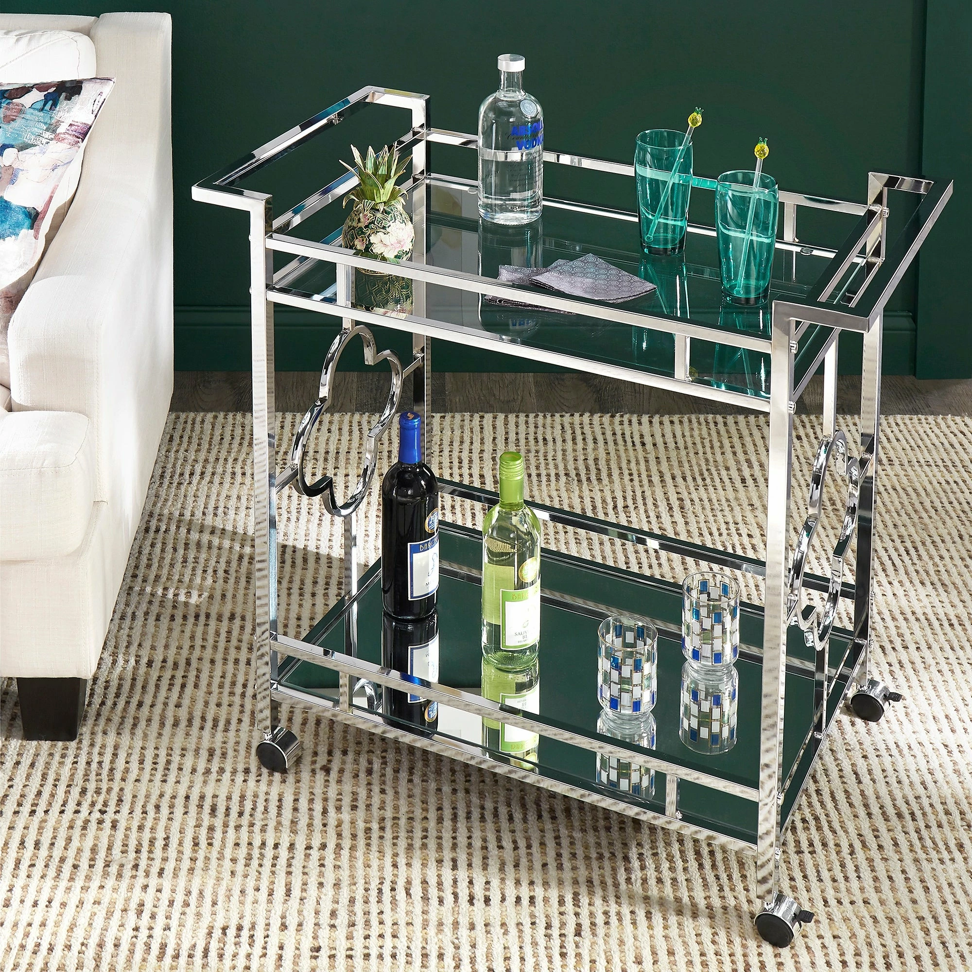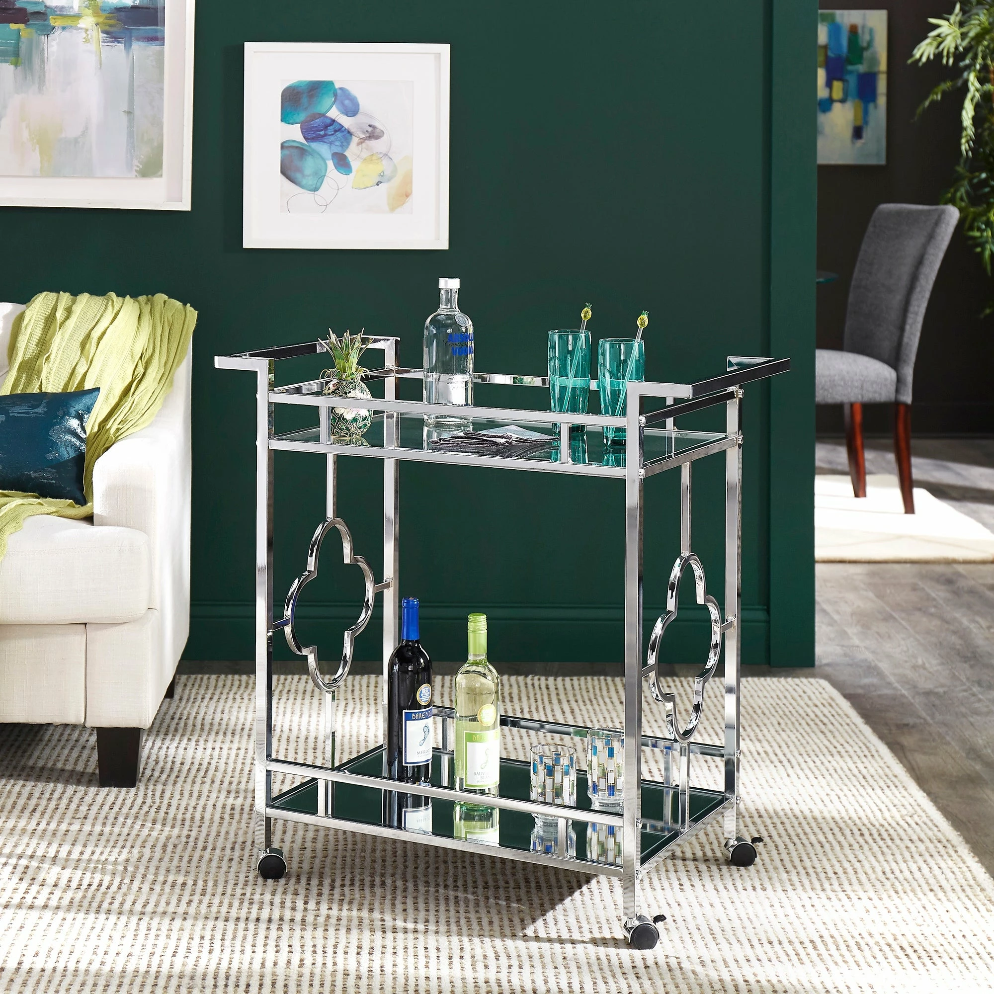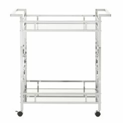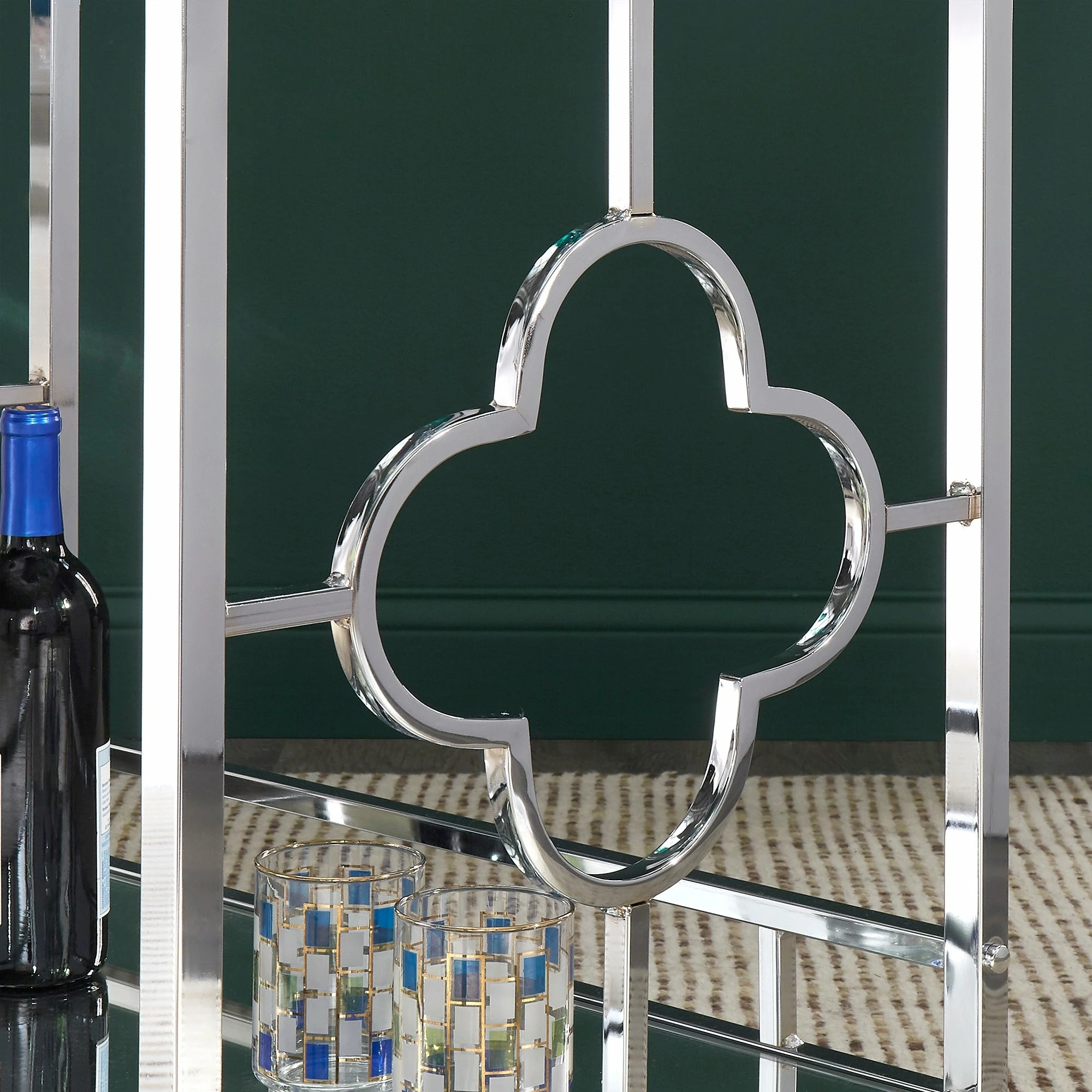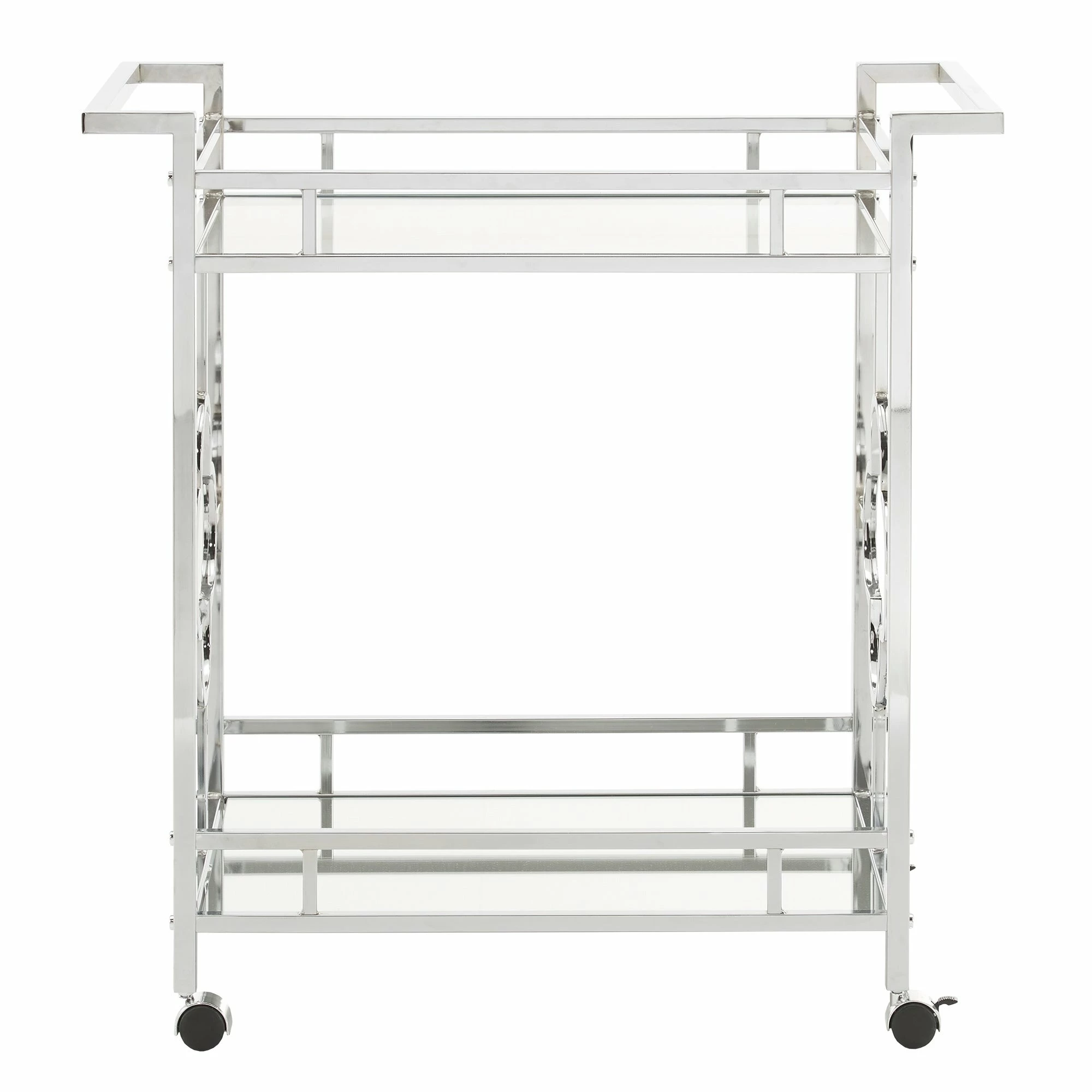 Make a statement with this elegant chrome finish bar cart! A sophisticated rounded quatrefoil pattern surrounds each edge of the cart to add an intentional standout statement within your home. This cart is conveniently fitted with locking caster wheels to keep your cart in place, wherever you may place it within your space! Two glam mirrored shelves allow you to get the party started, and keep items organized in a stylish way.