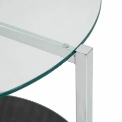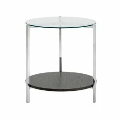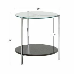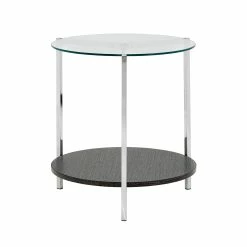 Deliver a bold update to your living space with the Roti Chrome Finish End Table with Glass Top from iNSPIRE Q Modern. This stylish end table features a glass table top that is generous, smooth, and easy to clean. The glass is beautifully complemented by a stunning chrome finish metal base. Set up a lamp on this contemporary end table and display pieces of home décor on its lower shelf.