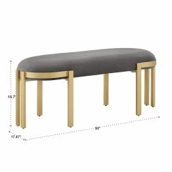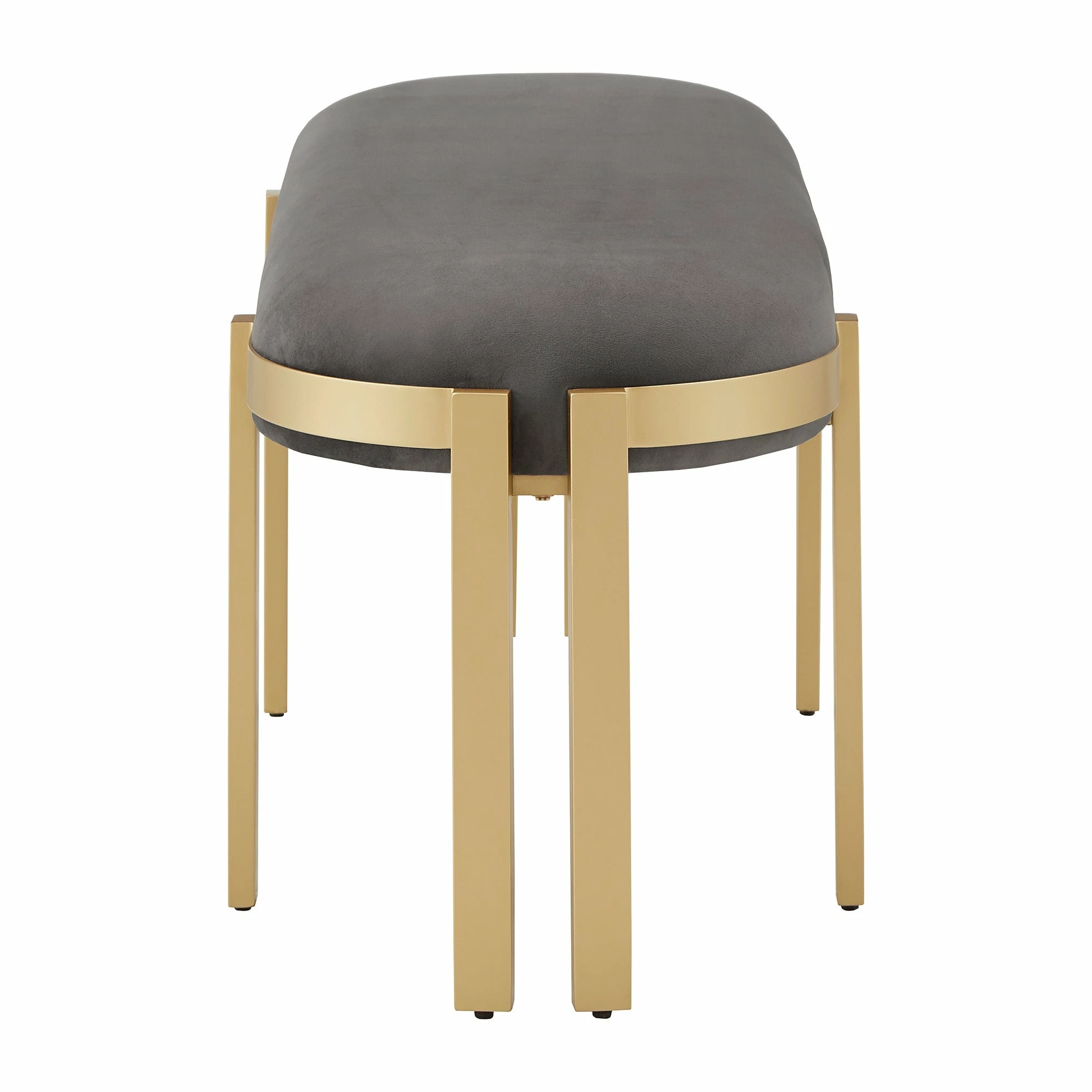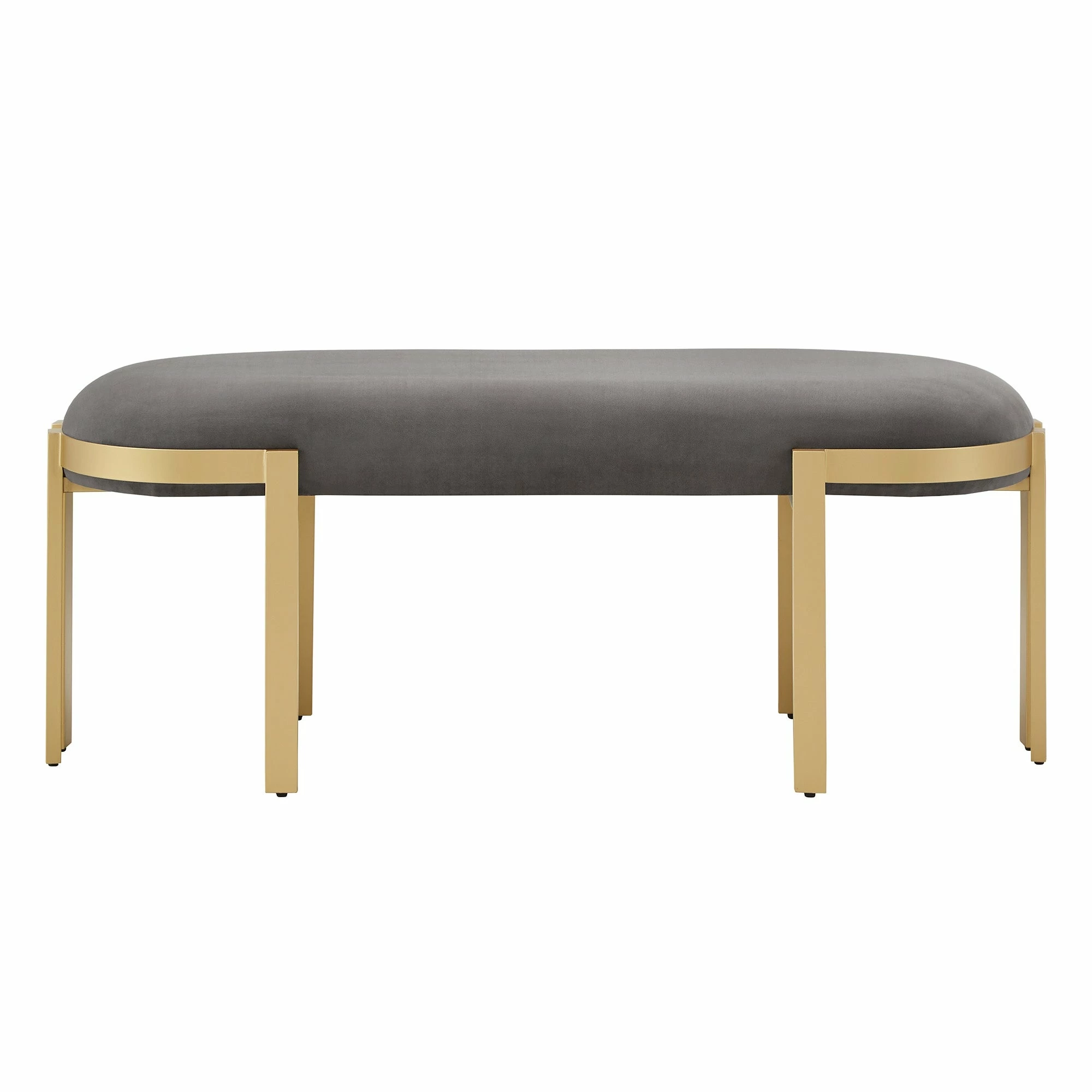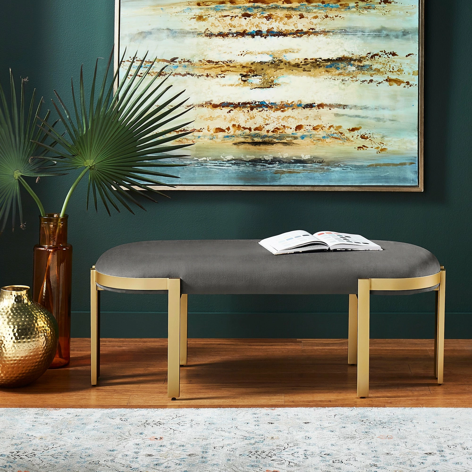 This bold, glam and elegant upholstered bench is the perfect addition to any modern room. The luxuriously smooth velvet fabric top provides a cozy touch to any bedroom or living space. The unique oval-shaped seat top is elegantly complemented by its bold metal half-round legs, which increases its durability, stability, and strength. Modern design and construction make this piece a stunning addition to any modern home. This upholstered oval metal bench is easy to put together.