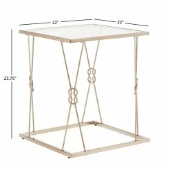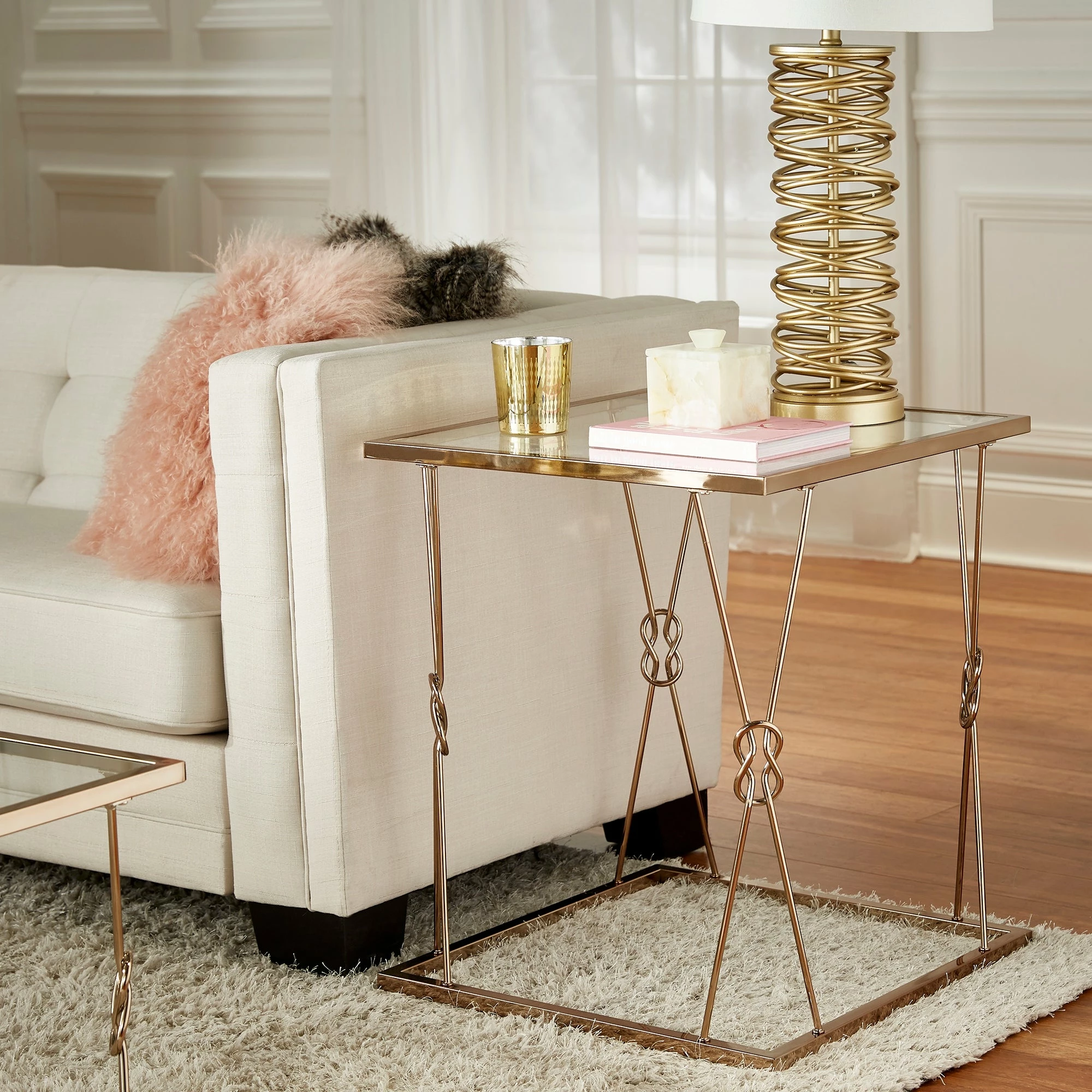 A timeless piece of furniture with the love of humble reef knot elegantly integrated into its champagne gold frame. Sophisticated and glamorous, the iNSPIRE Q Champagne Gold Finish with Reef Knot Frame and Glass Top End Table sets the tone for a luxurious setting. With a beautiful tempered glass top and gold metal frame, this table displays high class elegance. Bring this wonderful example of metal artistry into your home.