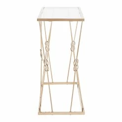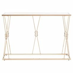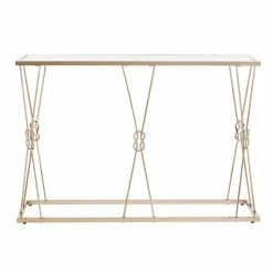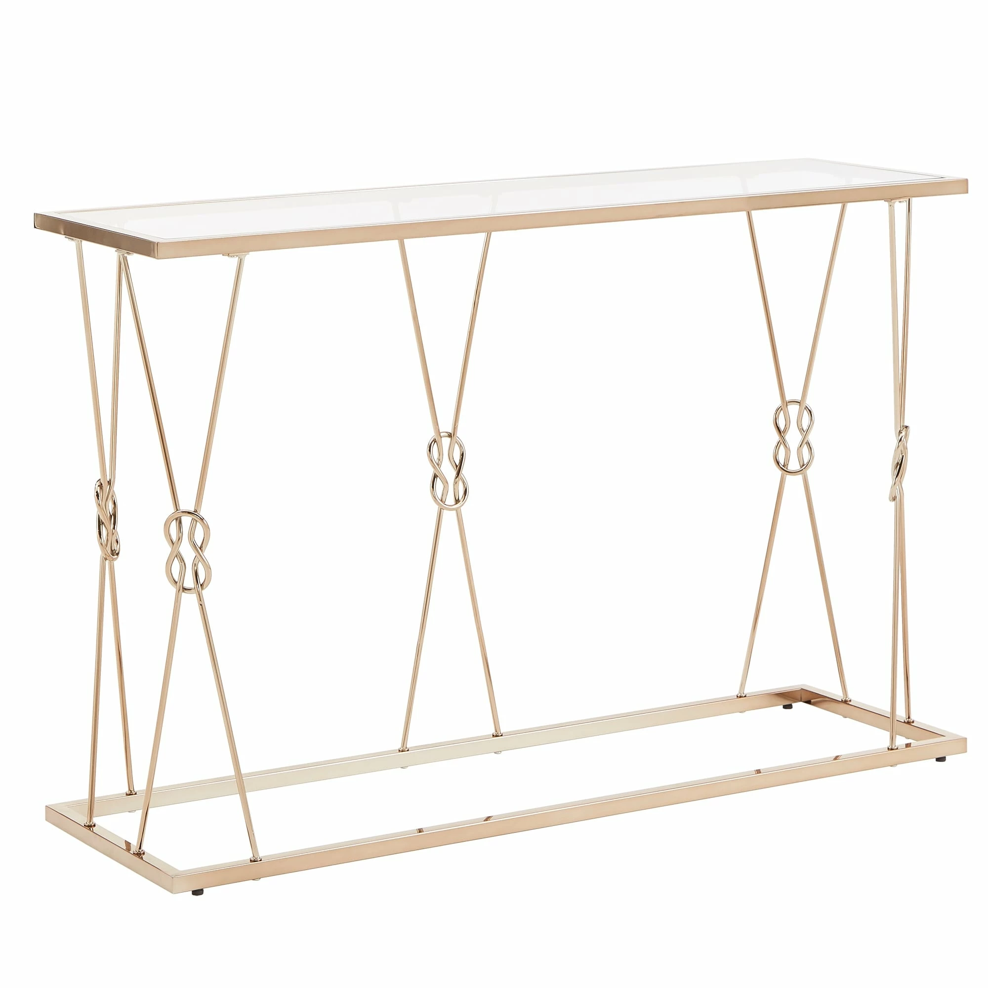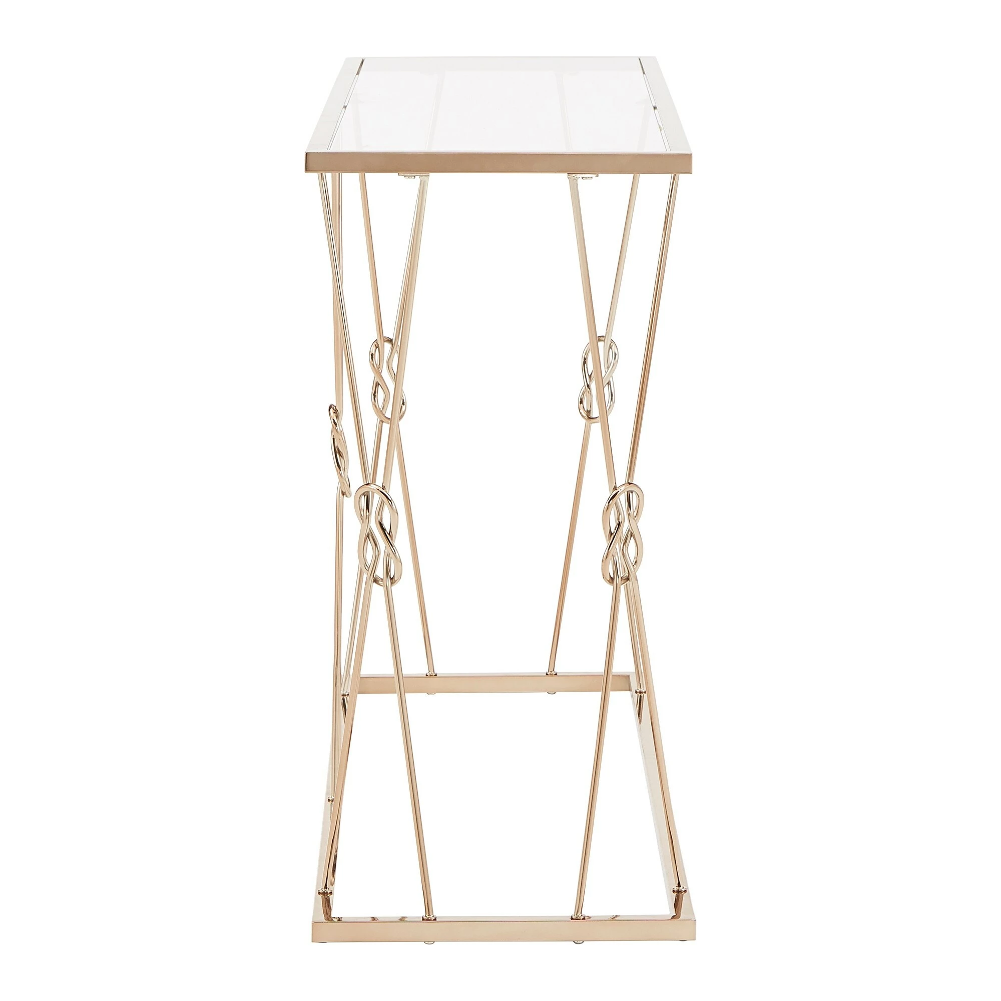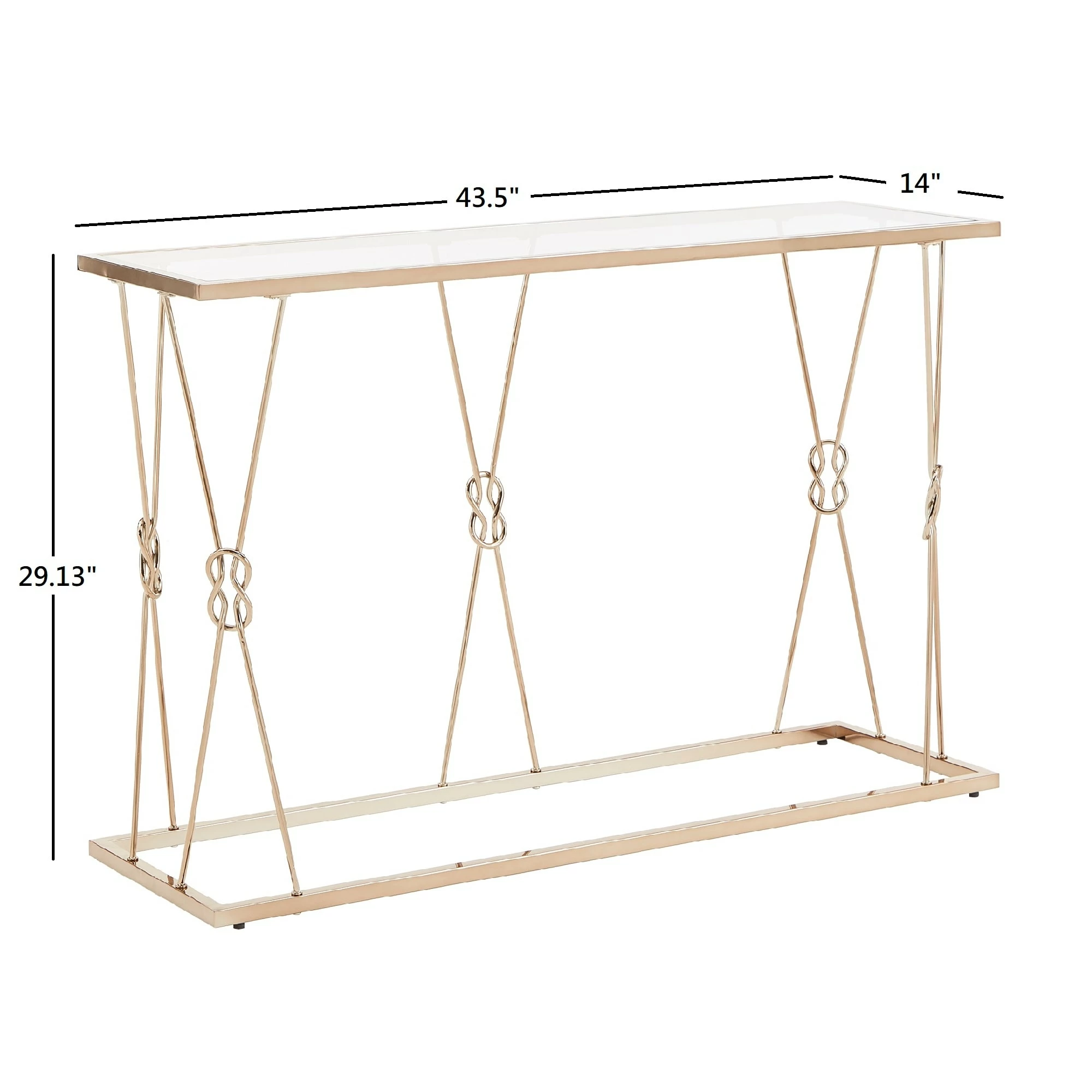 A timeless piece of furniture with the love of humble reef knot elegantly integrated into its champagne gold frame. Sophisticated and glamorous, the iNSPIRE Q Champagne Gold Finish with Reef Knot Frame and Glass Top Sofa Table sets the tone for a luxurious setting. With a beautiful tempered glass top and gold metal frame, this table displays high class elegance. Bring this wonderful example of metal artistry into your home.