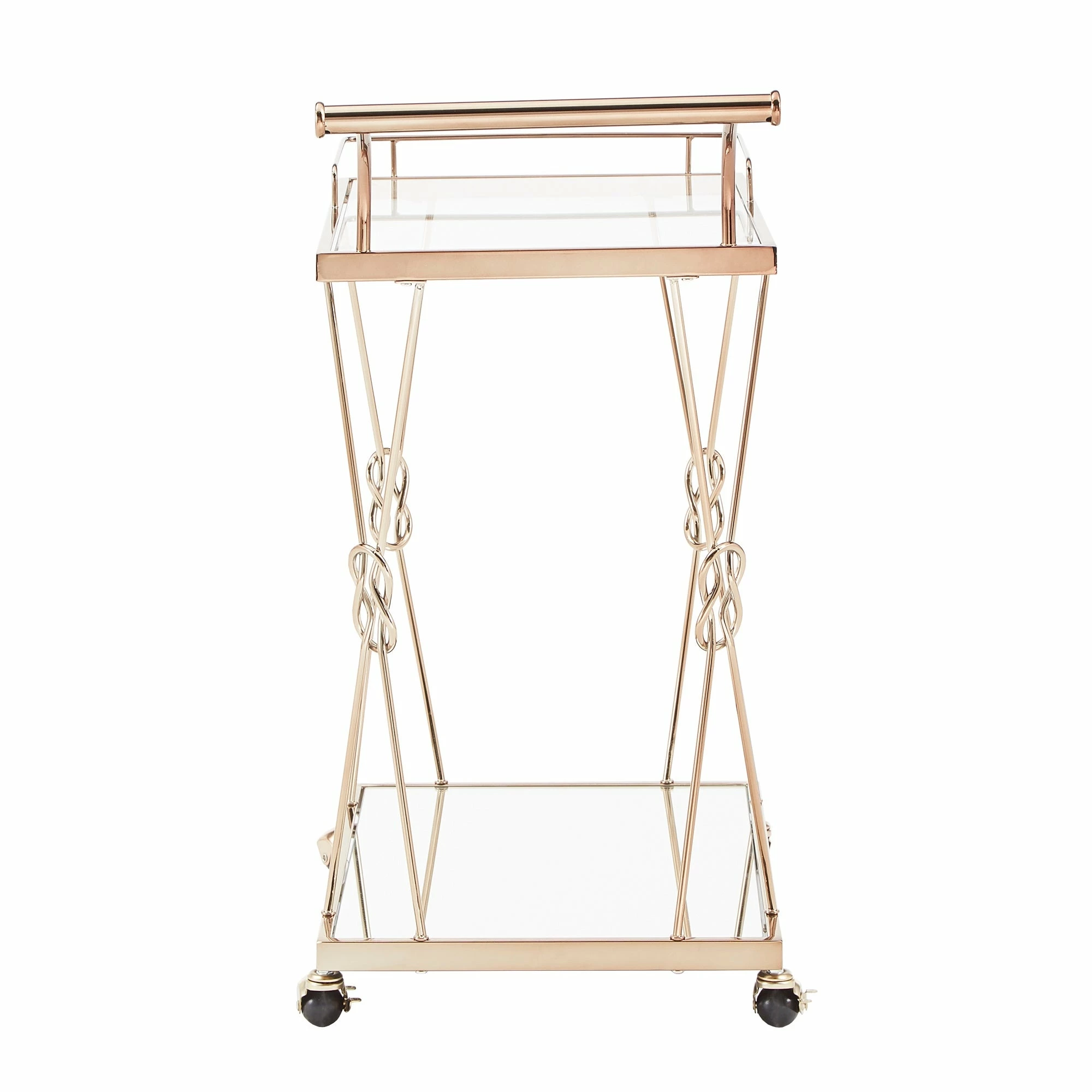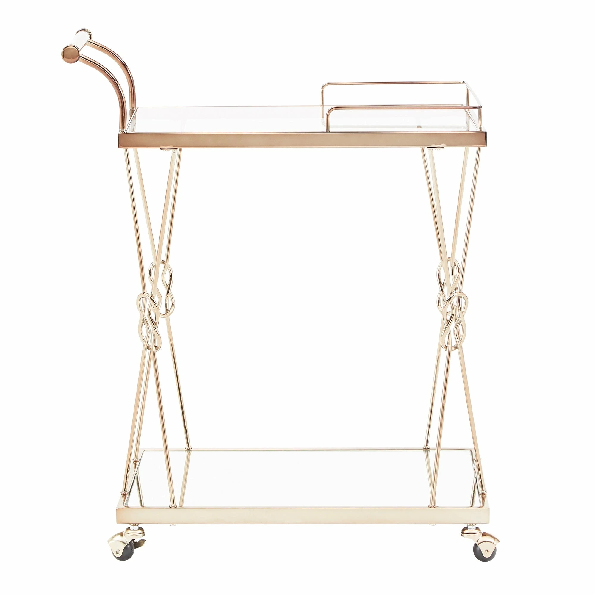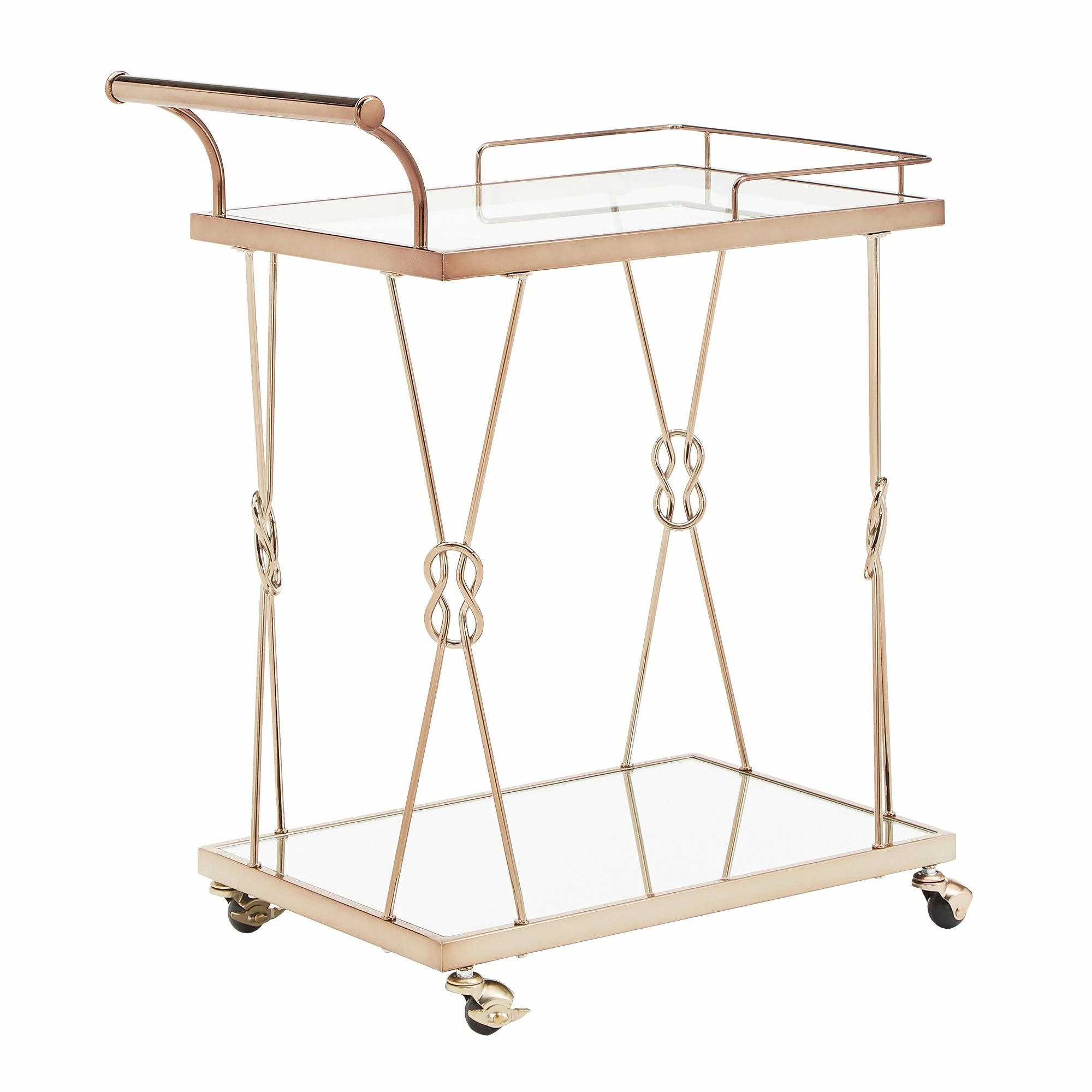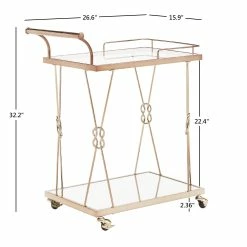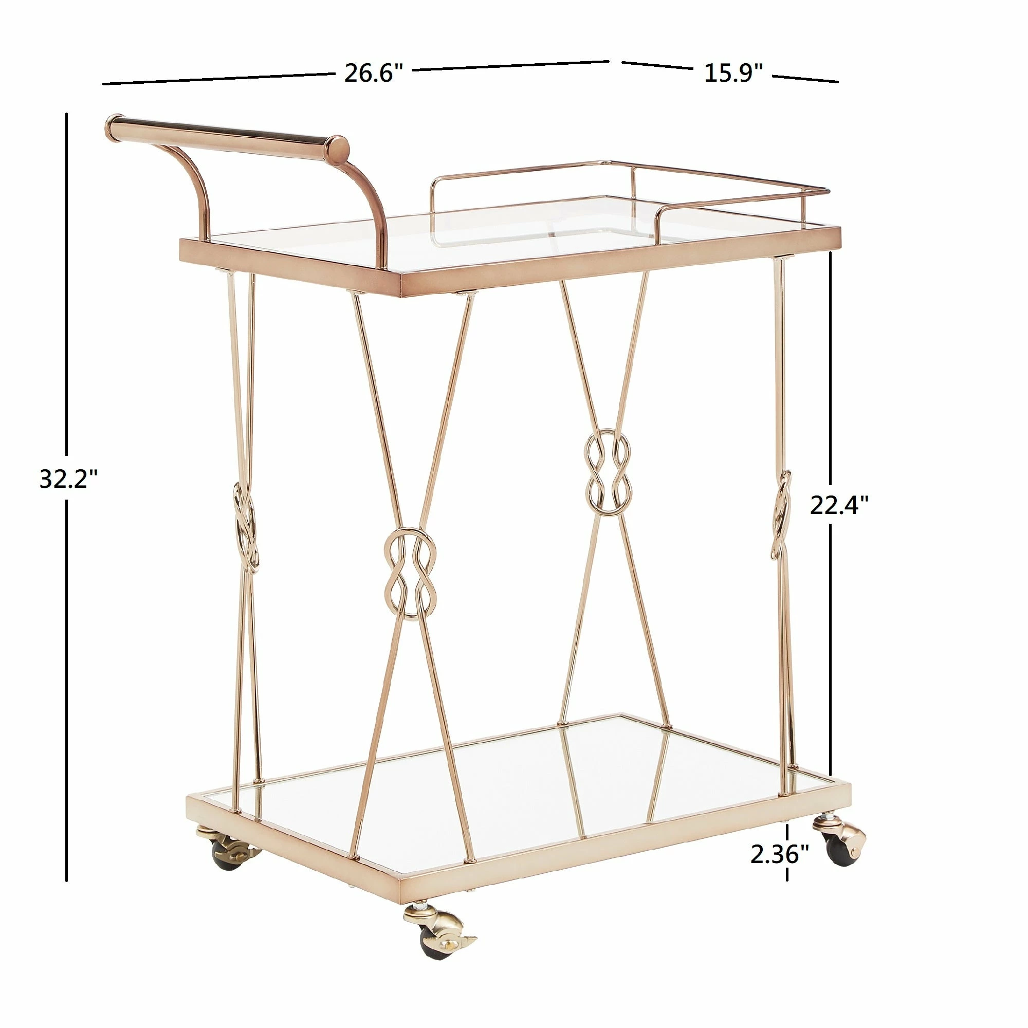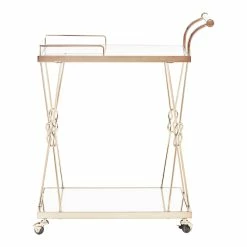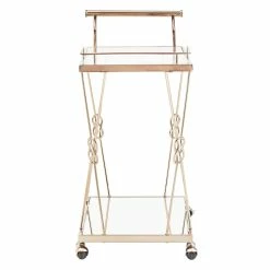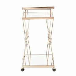 A timeless piece of furniture with the love of humble reef knot elegantly integrated into its champagne gold frame. Sophisticated and glamorous, the iNSPIRE Q Champagne Gold Finish Reef Knot Frame and Glass Top and Mirror Bottom Bar Cart sets the tone for a luxurious setting. With a beautiful tempered glass top, mirror bottom and gold metal frame, this table displays high class elegance. Bring this wonderful example of metal artistry into your home.