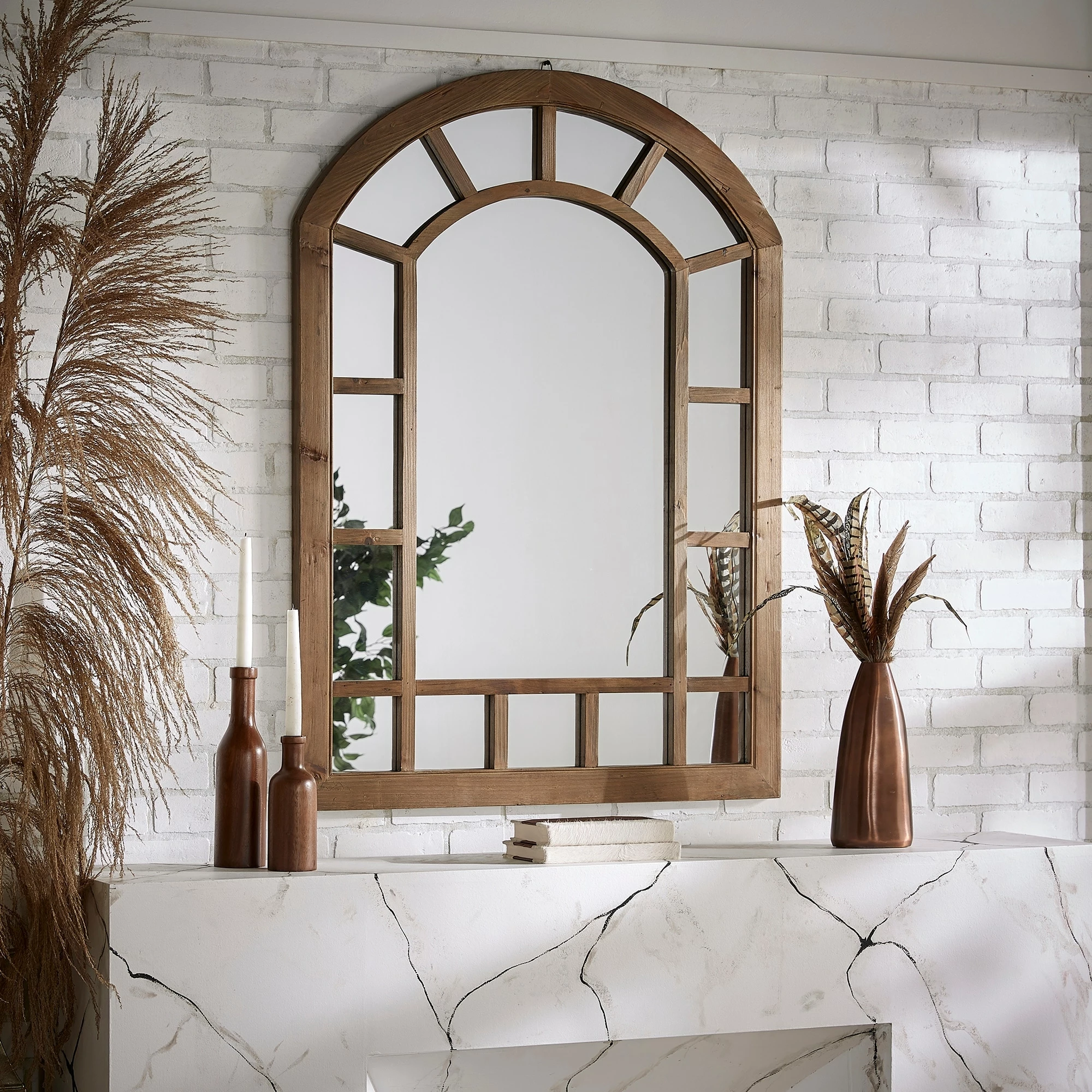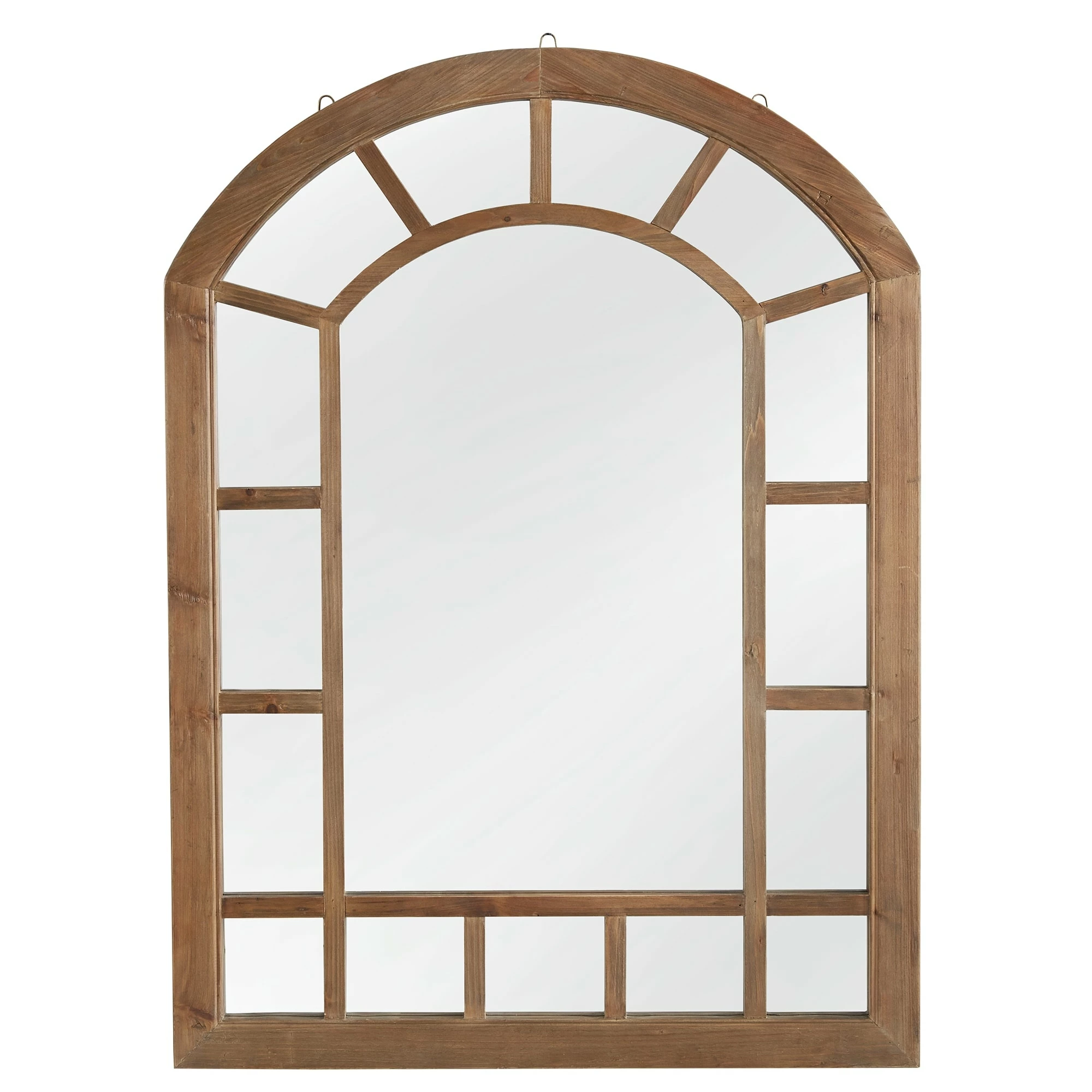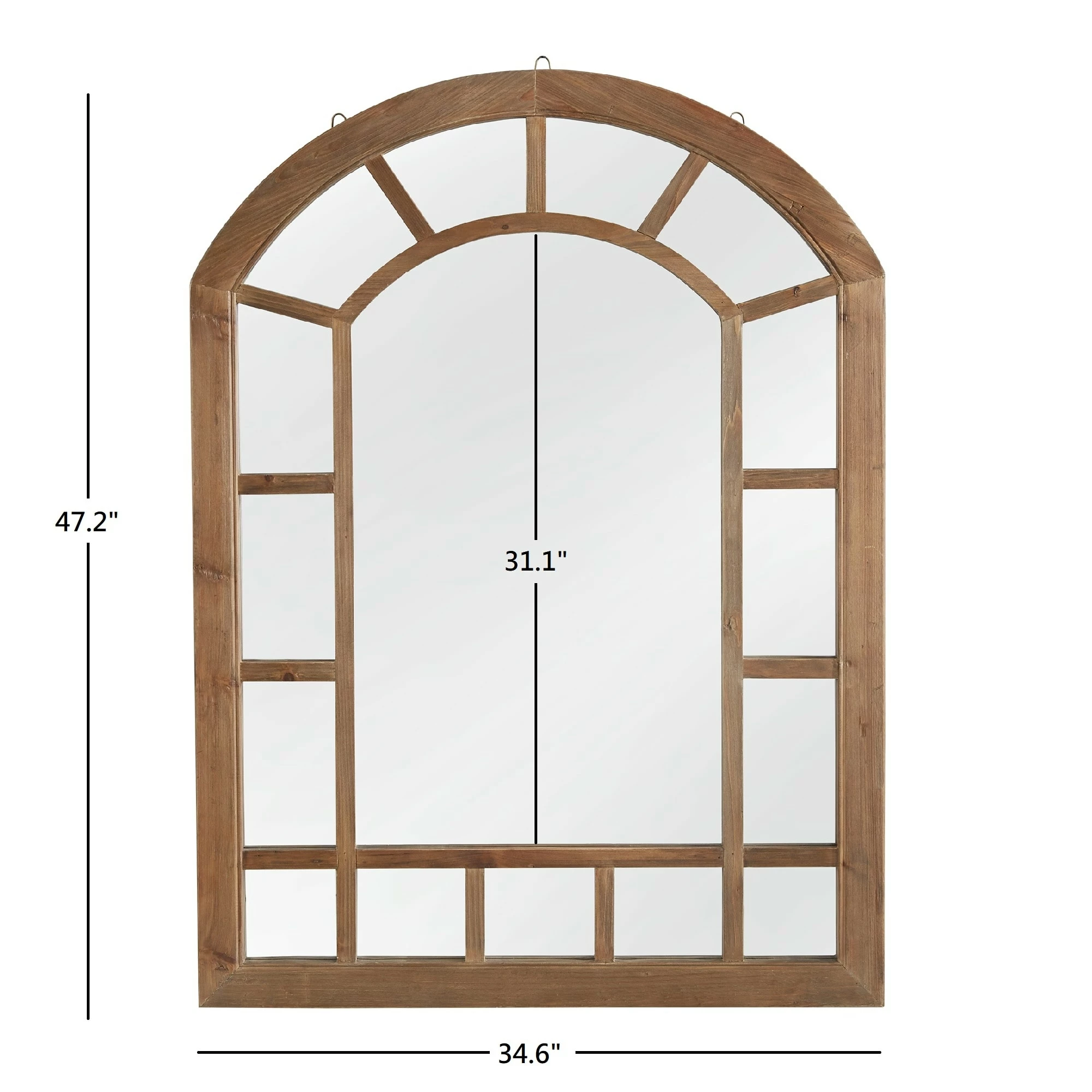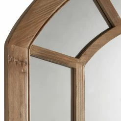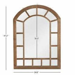 The Silas Wood Arched Windowpane Wall Mirror from iNSPIRE Q Artisan lends style and sophistication to the walls in your home. This charming mirror showcases a beautiful, classic, windowpane design, crafted from reclaimed pine and solid wood. The natural wood finish is neutral to blend with existing color schemes while also giving off a rustic vibe, perfect for farmhouse-inspired settings.ย