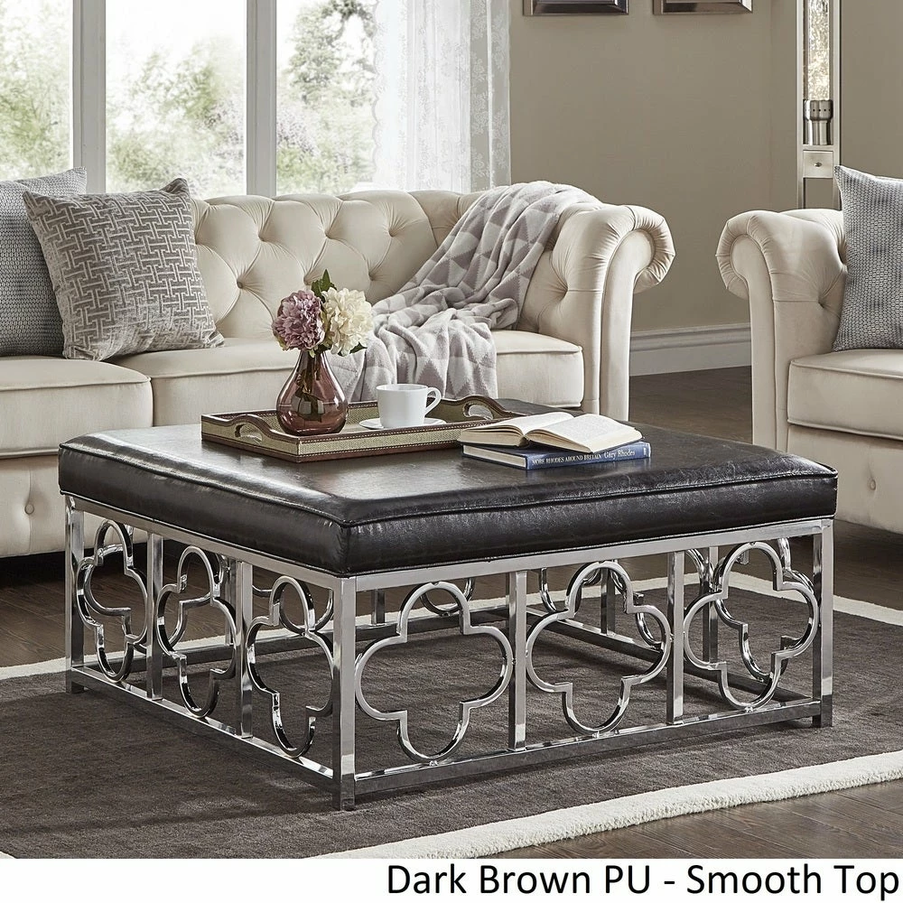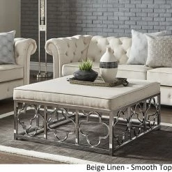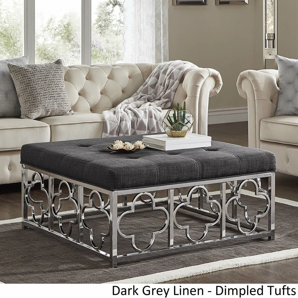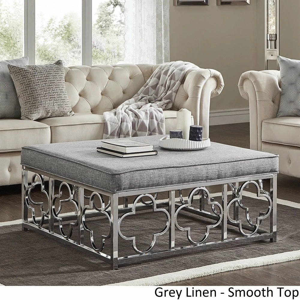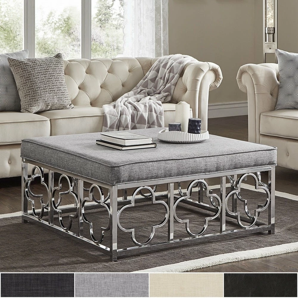 The Solene Chrome Quatrefoil Base Square Ottoman Coffee Table by iNSPIRE Q® Bold is a versatile piece offers the comfort of an ottoman and the convenience of a coffee table. With a large surface area to kick up your feet or keep your favorite snacks handy, this ottoman coffee table is an essential addition to your living space. While modern and sophisticated, the quatrefoil base design incorporates a Moroccan flair, creating a look that’s both contemporary and unique. Available in several different upholstery options, so you can customize this piece to match any design or color scheme.
