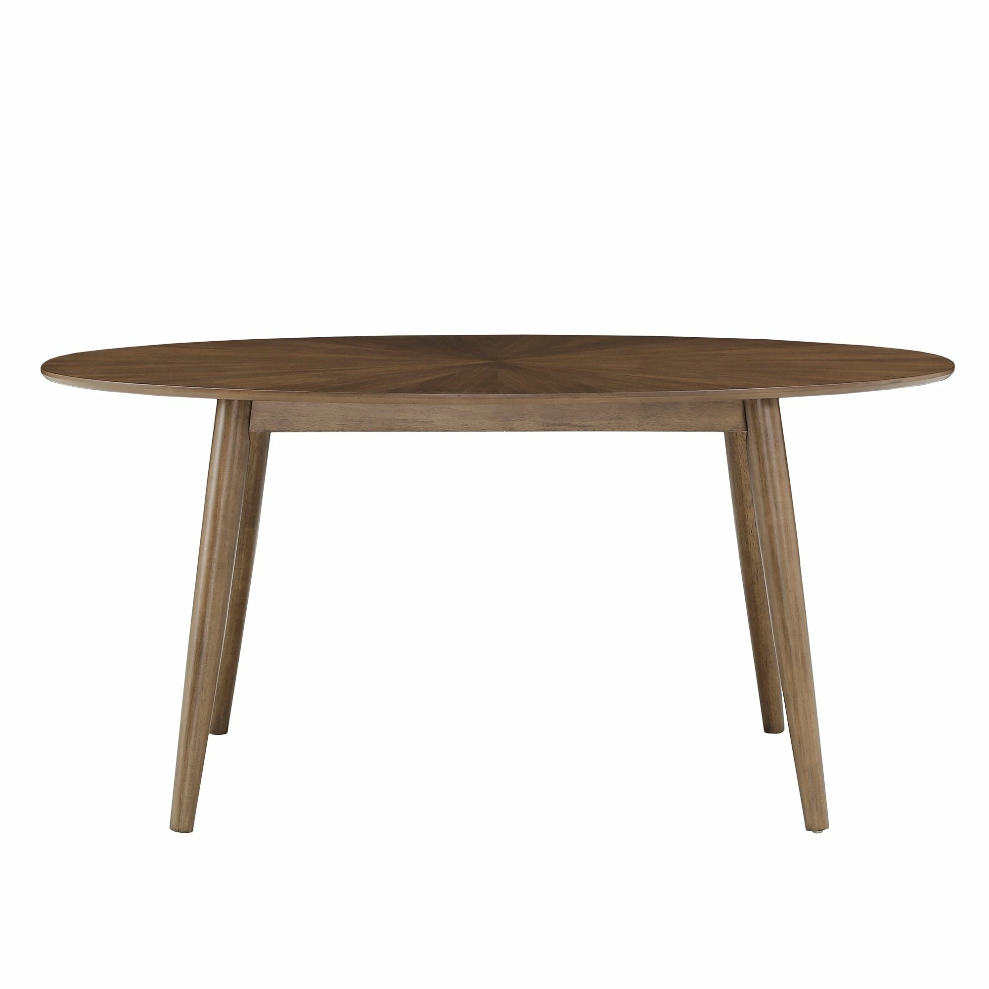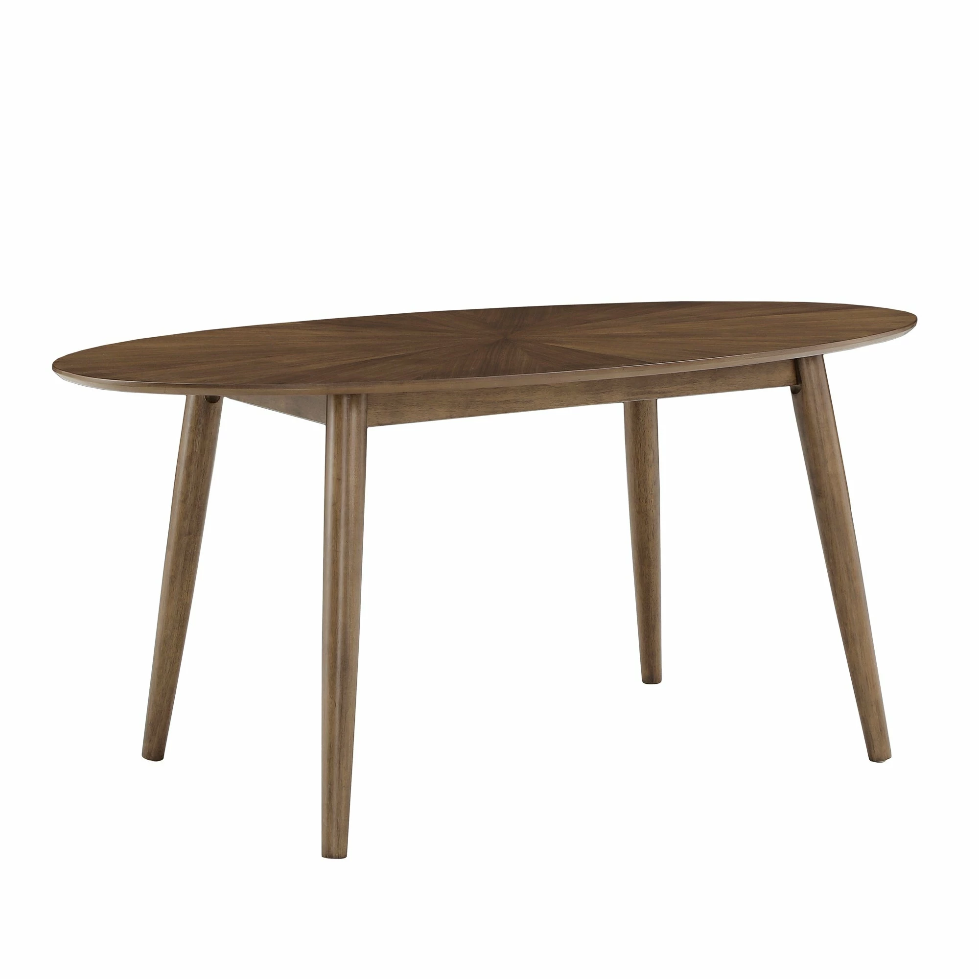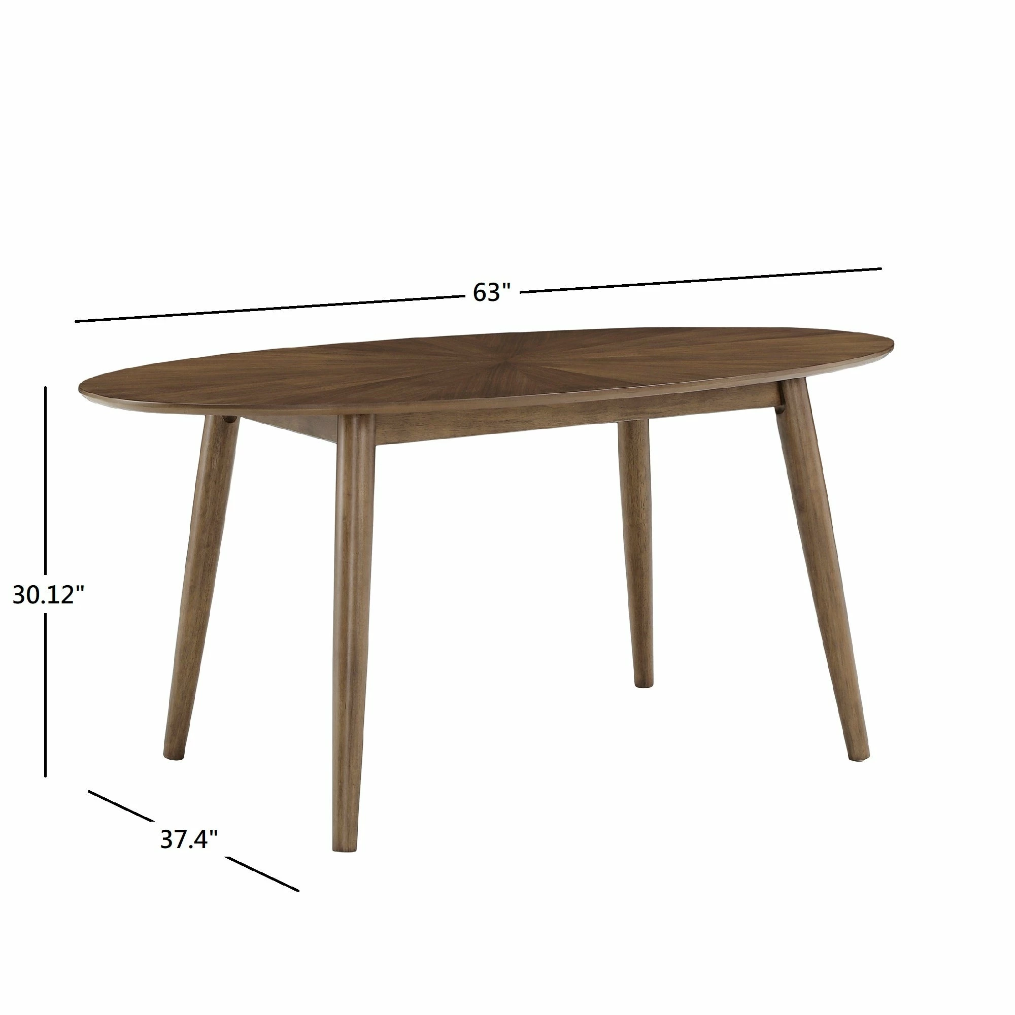 The Todd Mid-Century Walnut Oval Dining Table delivers timeless, retro vibes to any dining space. Crisp and clean, this state-of-the-art table features a simple design that could be dressed up or dressed down for all occasions. Sturdy tapered legs enhance the mid-century look, keeping it from taking up too much floor space and allowing plenty of airflow. Crafted with durable rubberwood, the smooth, oval-shaped table top exhibits as stunning starburst inlay design. A walnut finish completes this piece and is sure to never go out of style.