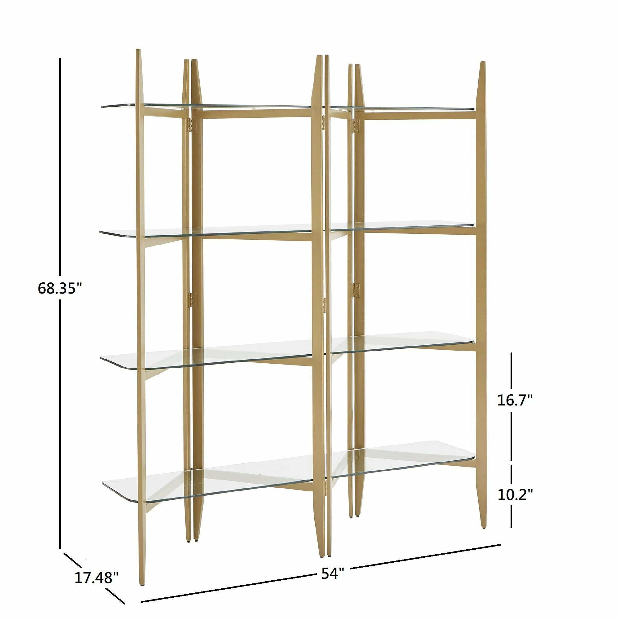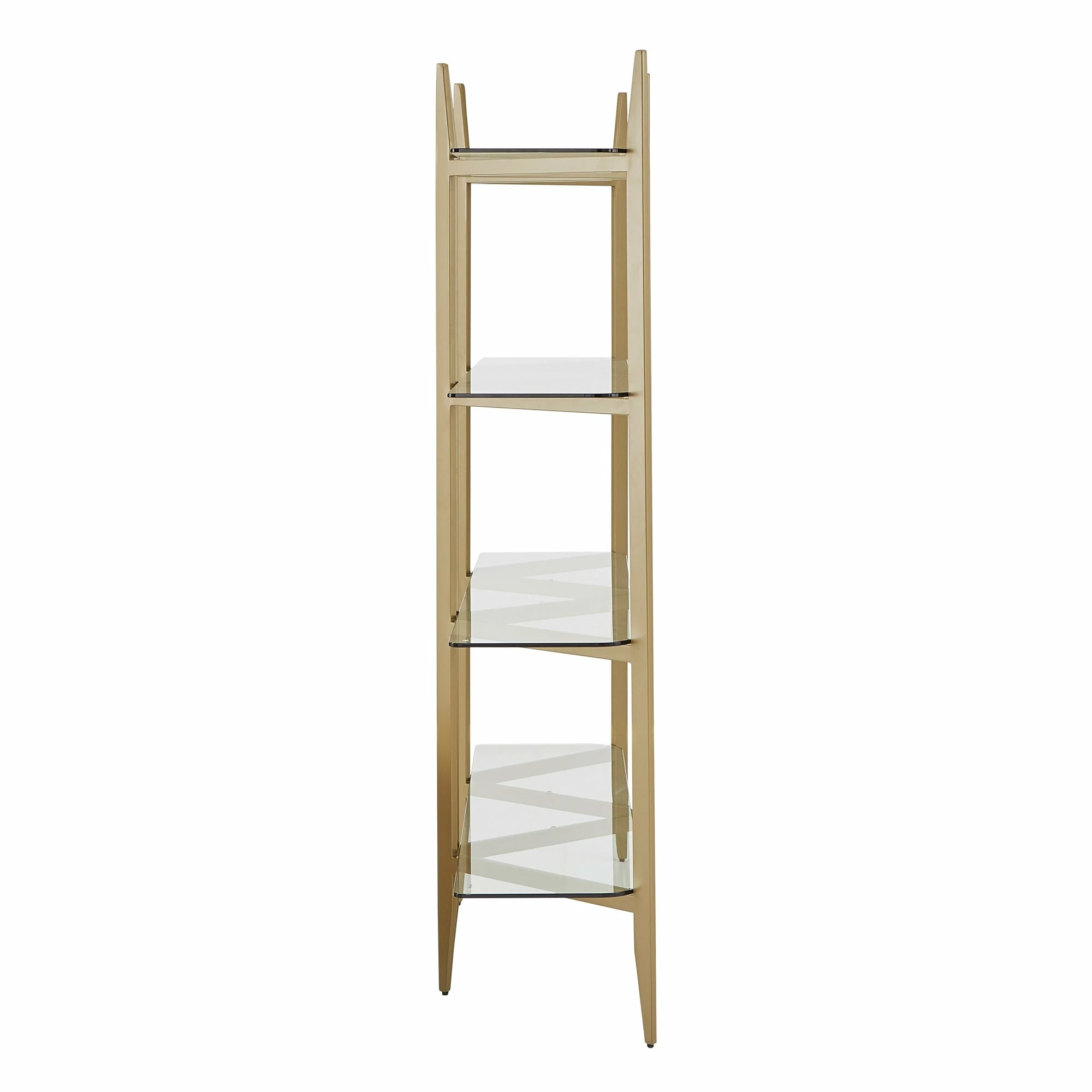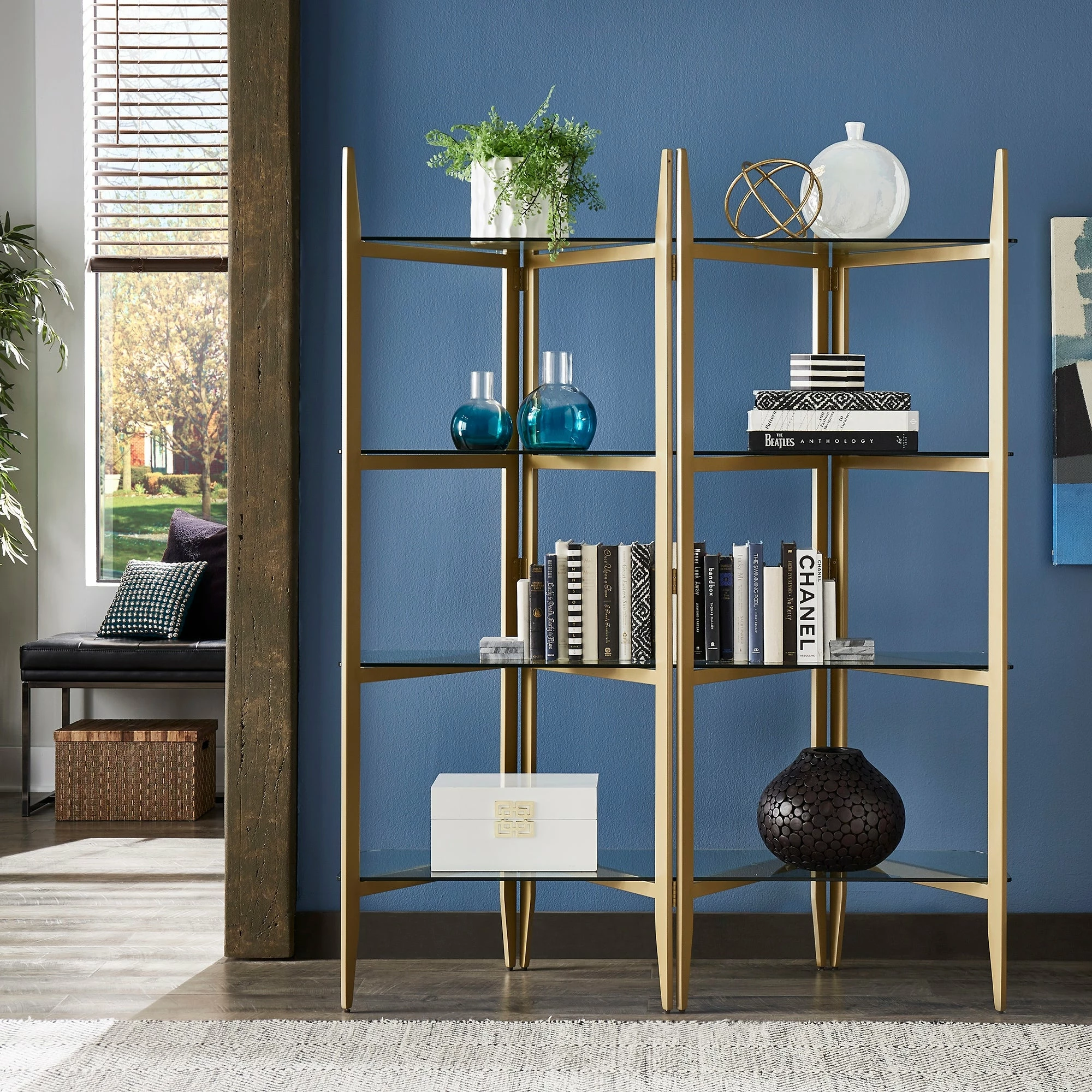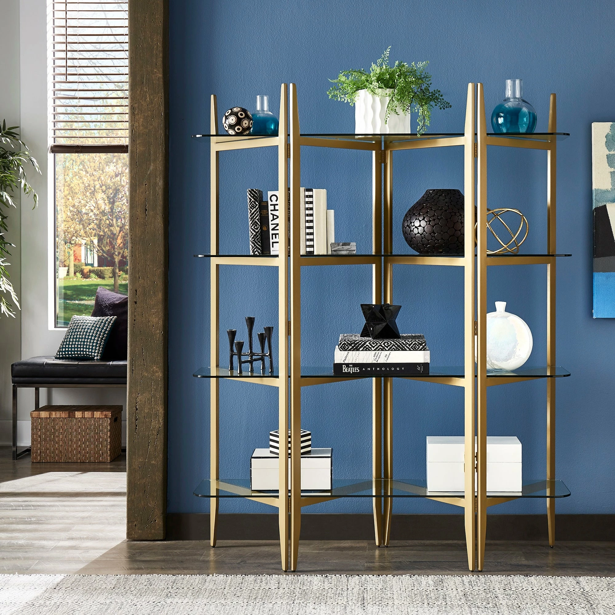 The Tove Gold Finish Metal Bookcase with Glass Shelves from iNSPIRE Q Bold delivers sleek style to any home. The open design of this piece allows for the spotlight to be placed on your prized possessions while also lending an airy appearance. A resilient gold-finish metal frame supports four, clear, tempered glass shelves, promising plenty of strength and room for your belongings.