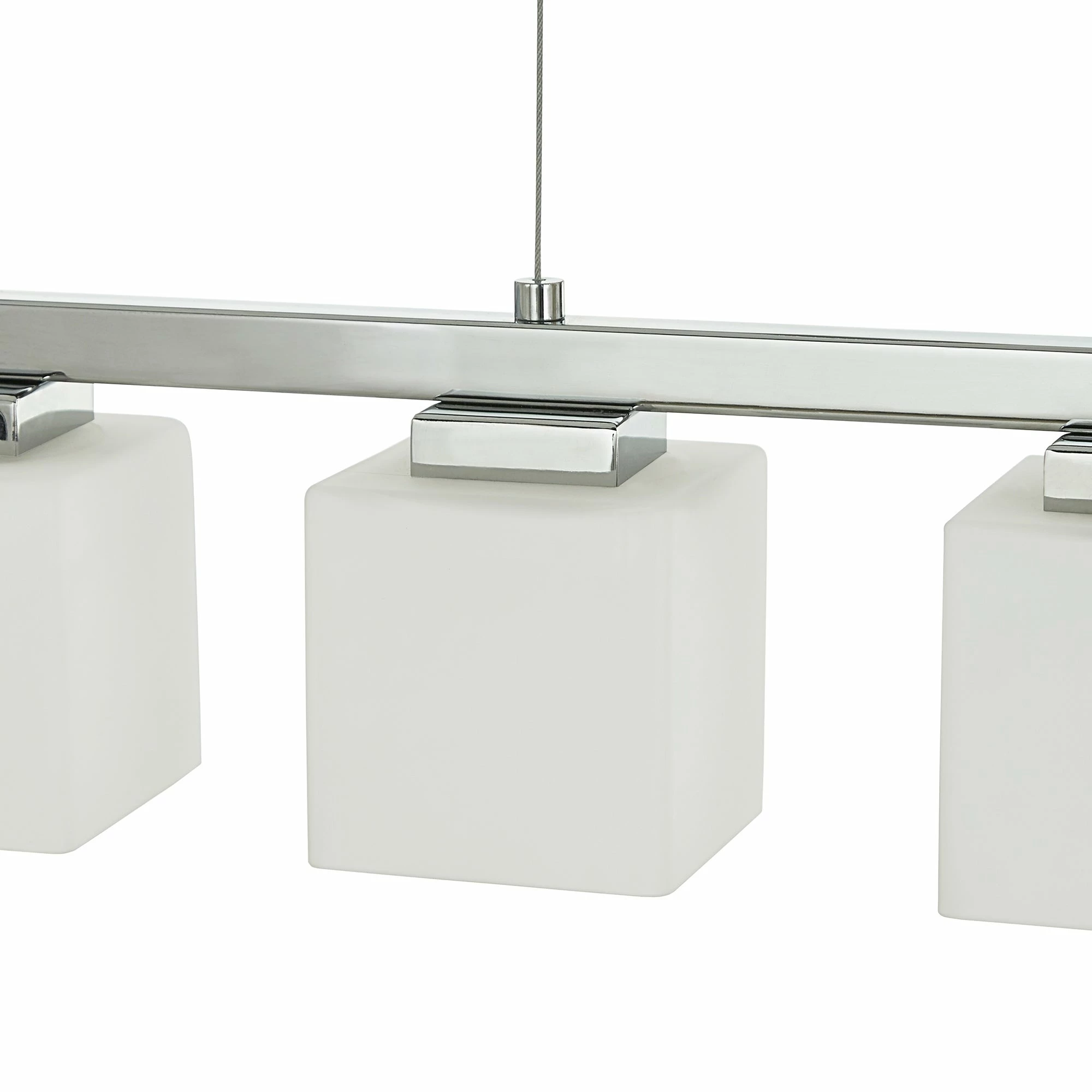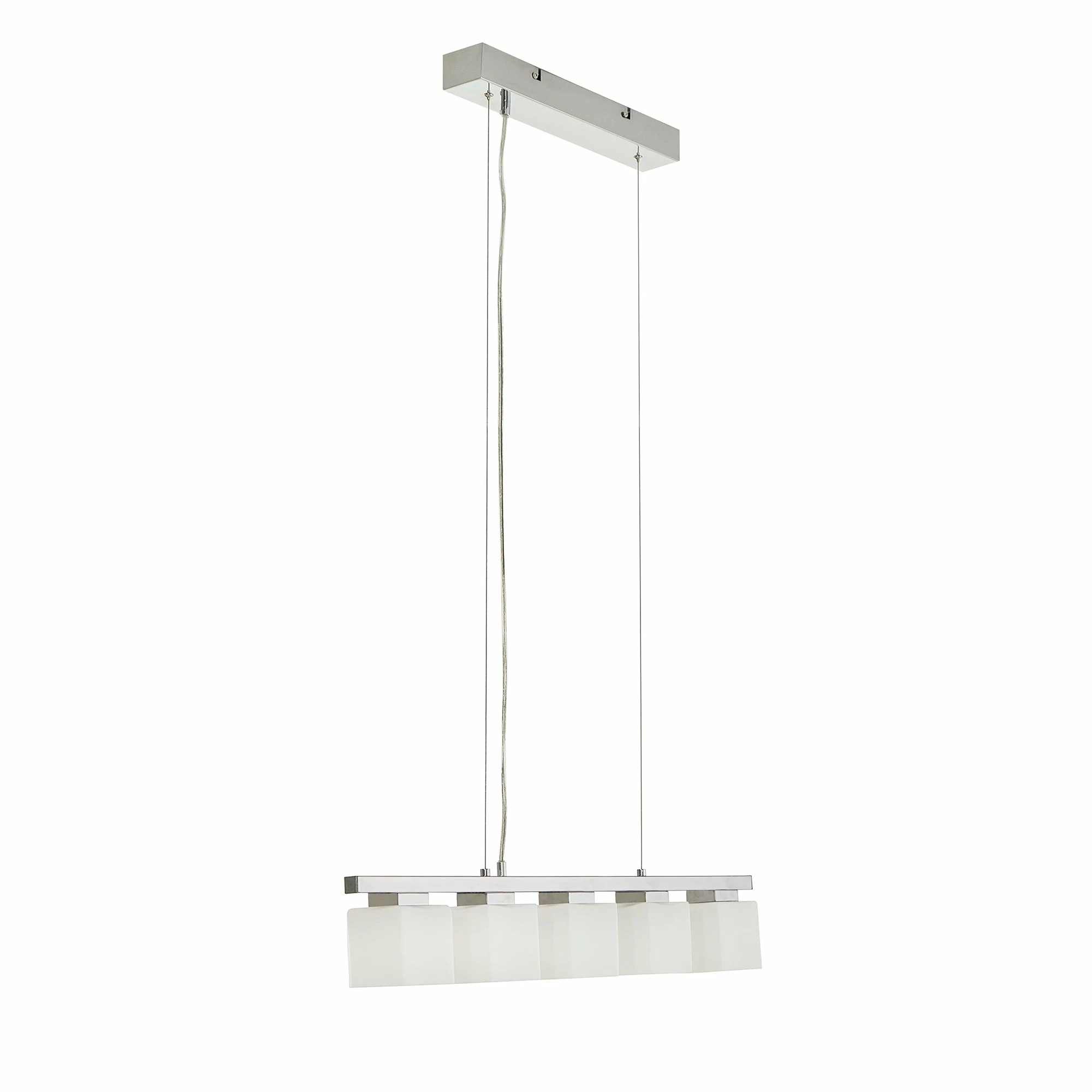 Displaying a chic presence in your dining or living space, the iNSPIRE Q Chrome Finish 5-Glass Cube Pendant Light is the perfect finishing touch to a contemporary interior setting. This pendant light features a luxurious chrome frame that faintly showcases the five white glass cubes. This light sheds a brilliant light onto your space and is easily hung from the ceiling.