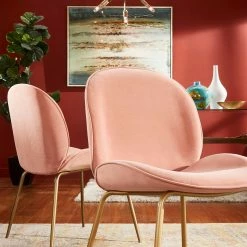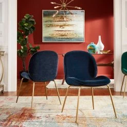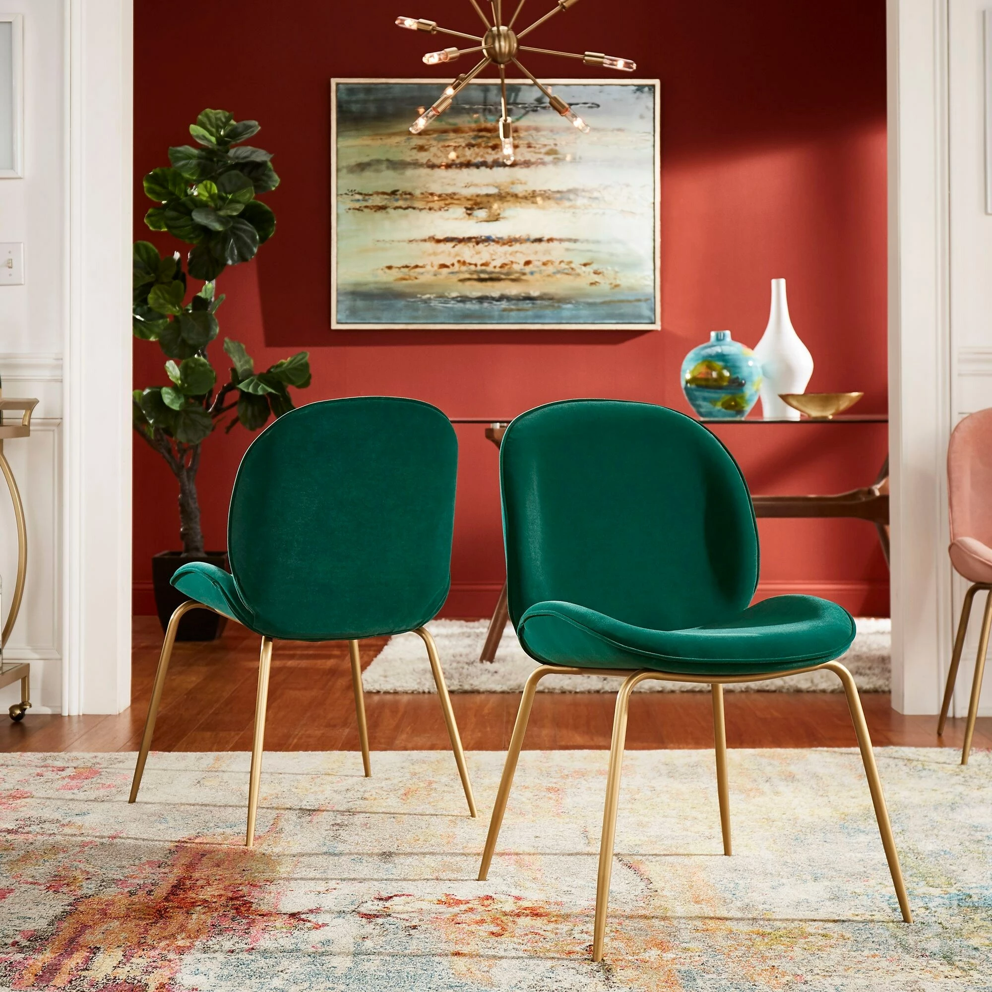 Well loved design by end-consumer and interior designer, the iNSPIRE Q Veronika beetle style Fully Upholstered Velvet Dining Chair features velvety sleek upholstery that is both comfortable and luxurious to have in your home. The all-metal brass base is finished in a styled gold color that pairs well with any modern settings.